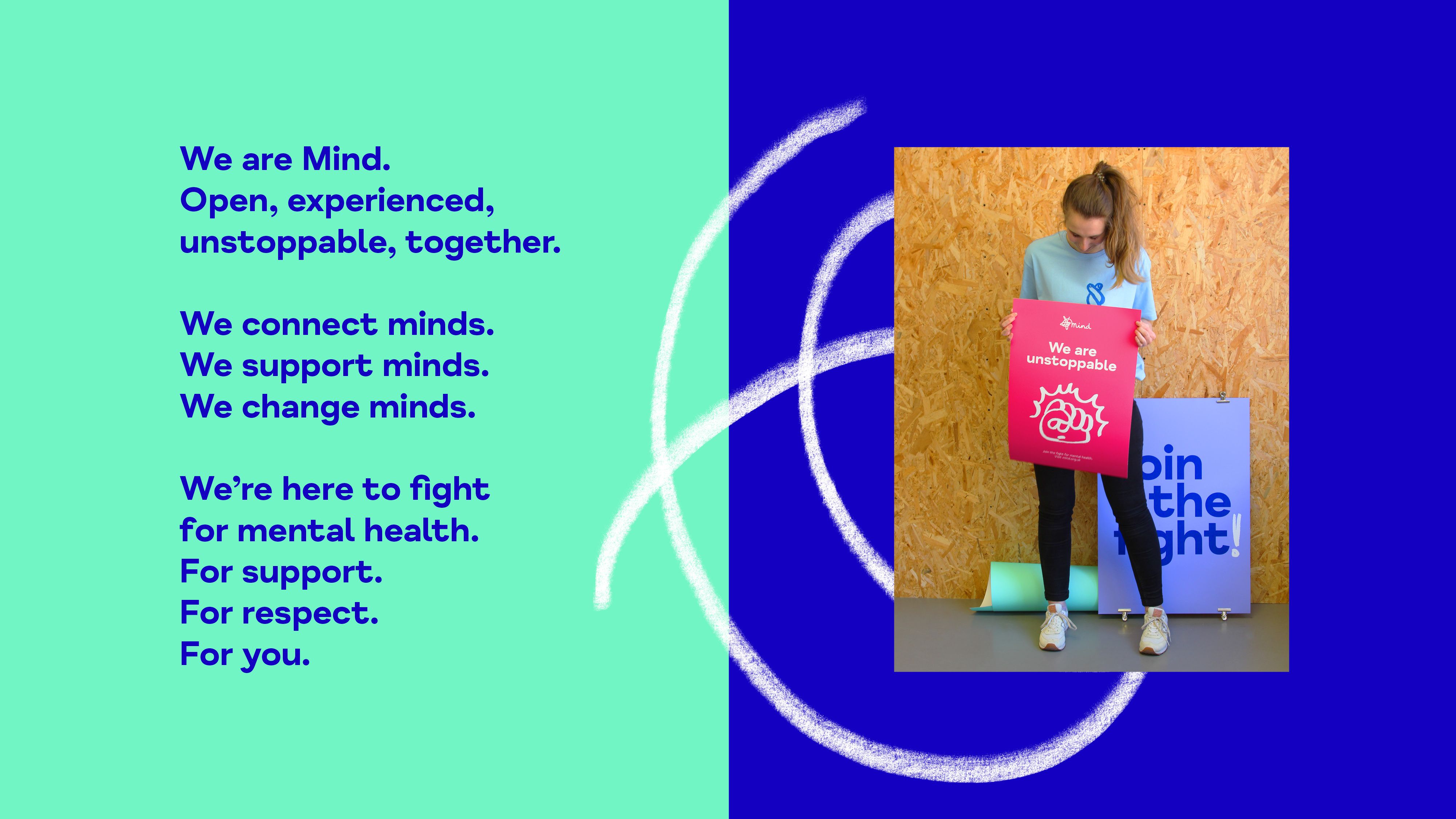 Brief: Mind needed a bold brand that would re-energise its staff under a new brand purpose. A clear inclusive story that engages everyone from vulnerable communities to policy makers. A design that feels personal and shows Mind’s fighting spirit. A design that is fit for screen and accessible for all audiences (incl visually impaired)