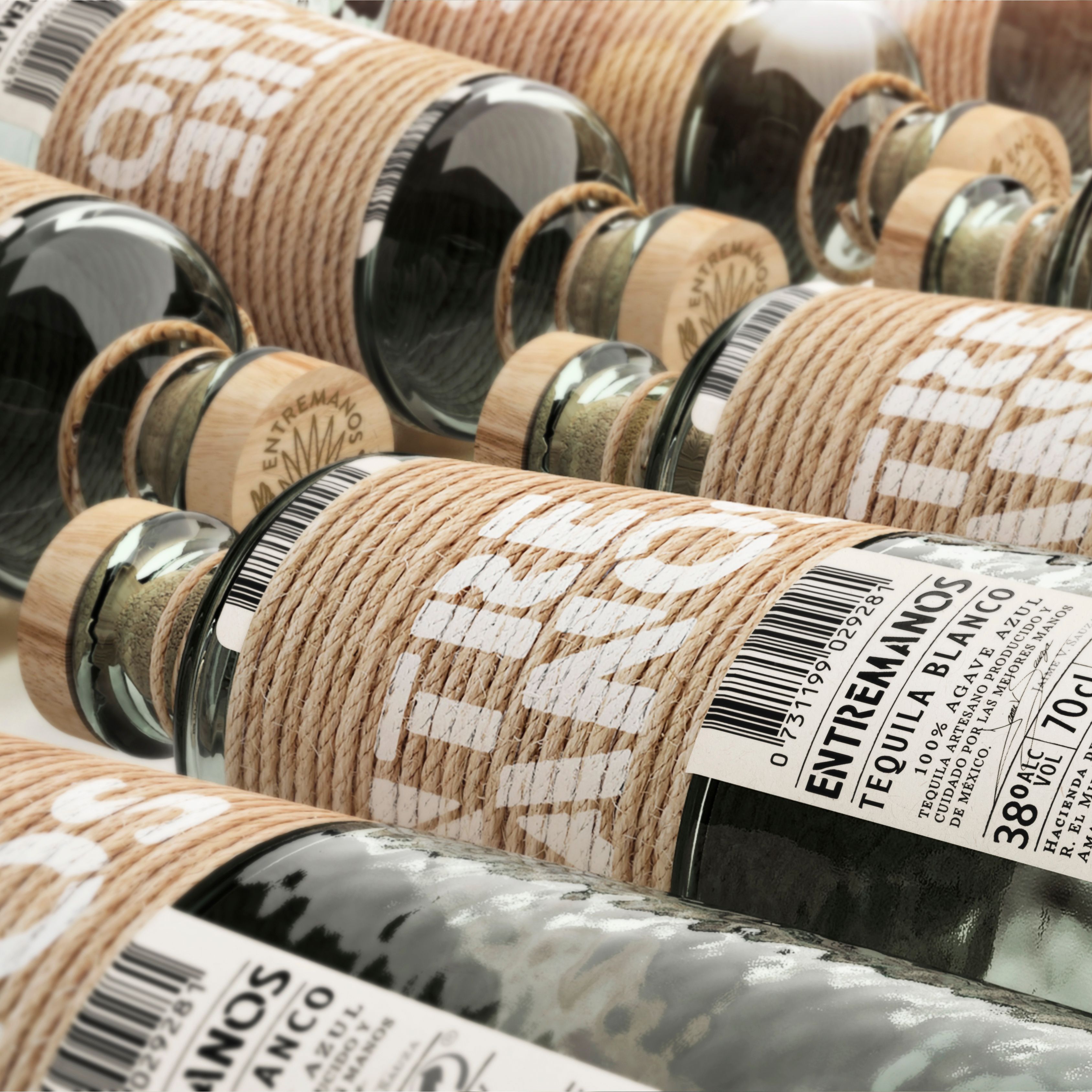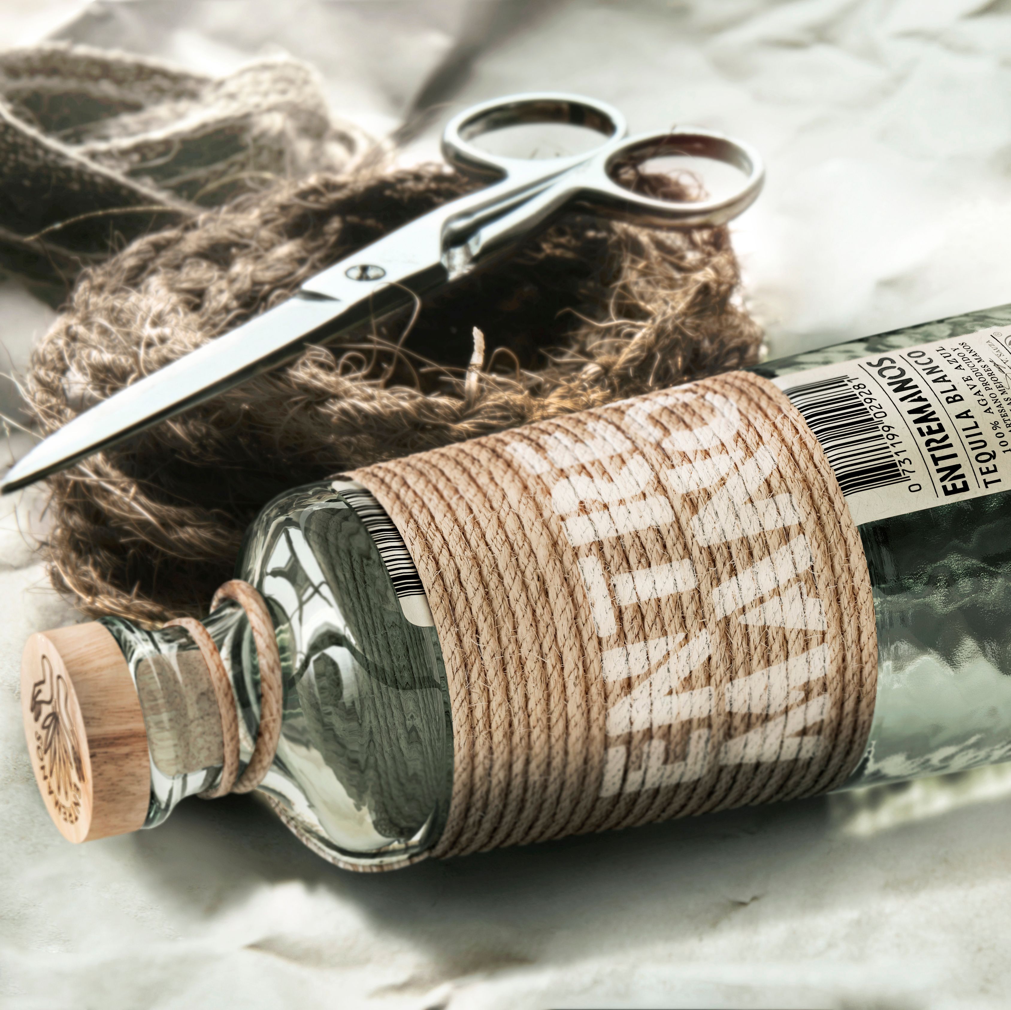 Entremanos has a bottle made in Mexico with surface finishes typical of the local technology. Its conical and friendly shape tries to replicate packaging from the past based on simplicity and modesty. The single paper label is held in place by a jute rope that encircles the central area of the bottle. A pyrographed wooden stopper joins this sum of materials and finishes that are part of the artisanal world that can only be found in places like the Mexican Pacific.
