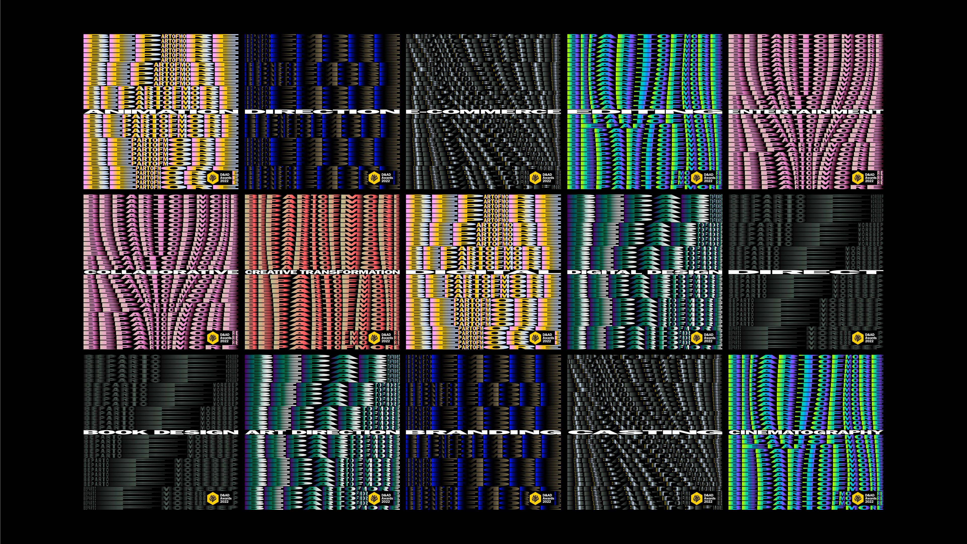 The annual D&AD awards are a byword for creative excellence. In 2022, celebrating the 60th year since its foundation, D&AD sought to highlight the inclusive spirit of its awards, inviting creatives around the world to be part of more by sharing their work, expertise and innovations with the broader creative community. It’s a line that appeals to all: from large companies to individuals working from home. For the third year running, Studio Dumbar/DEPT® were asked to create a visual identity encompassing a call for entries, virtual ceremonies, an online annual, and everything in between.