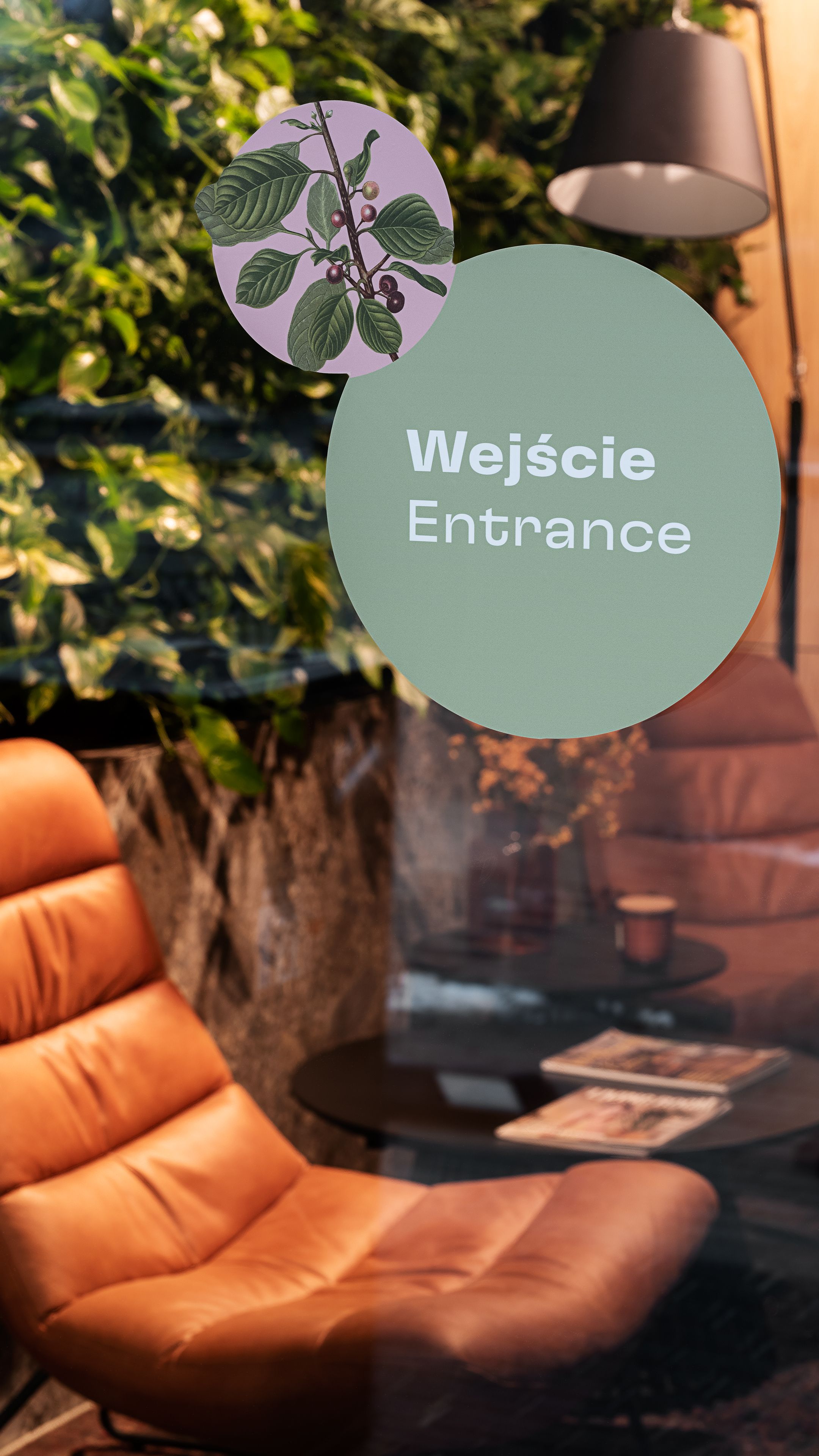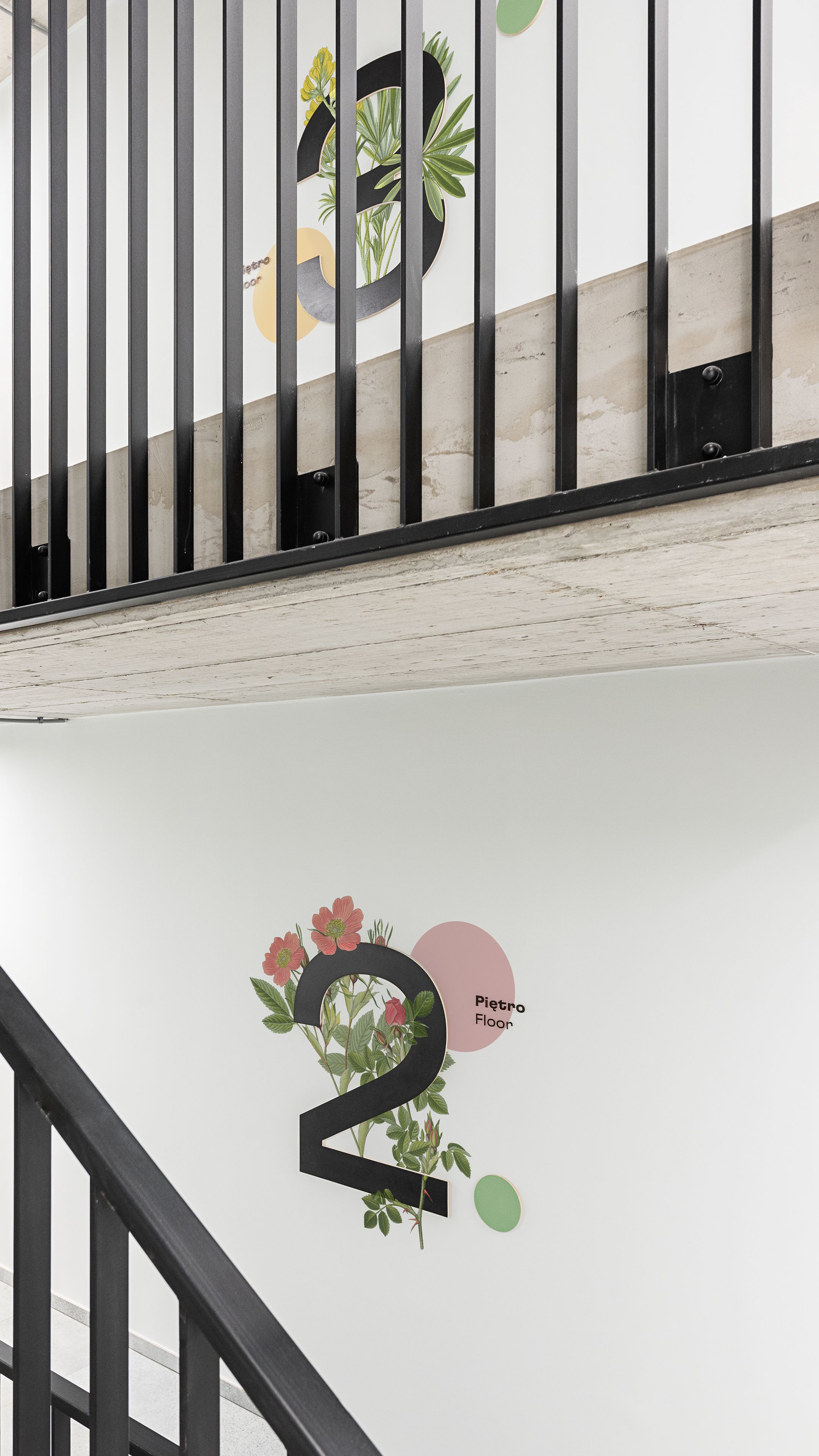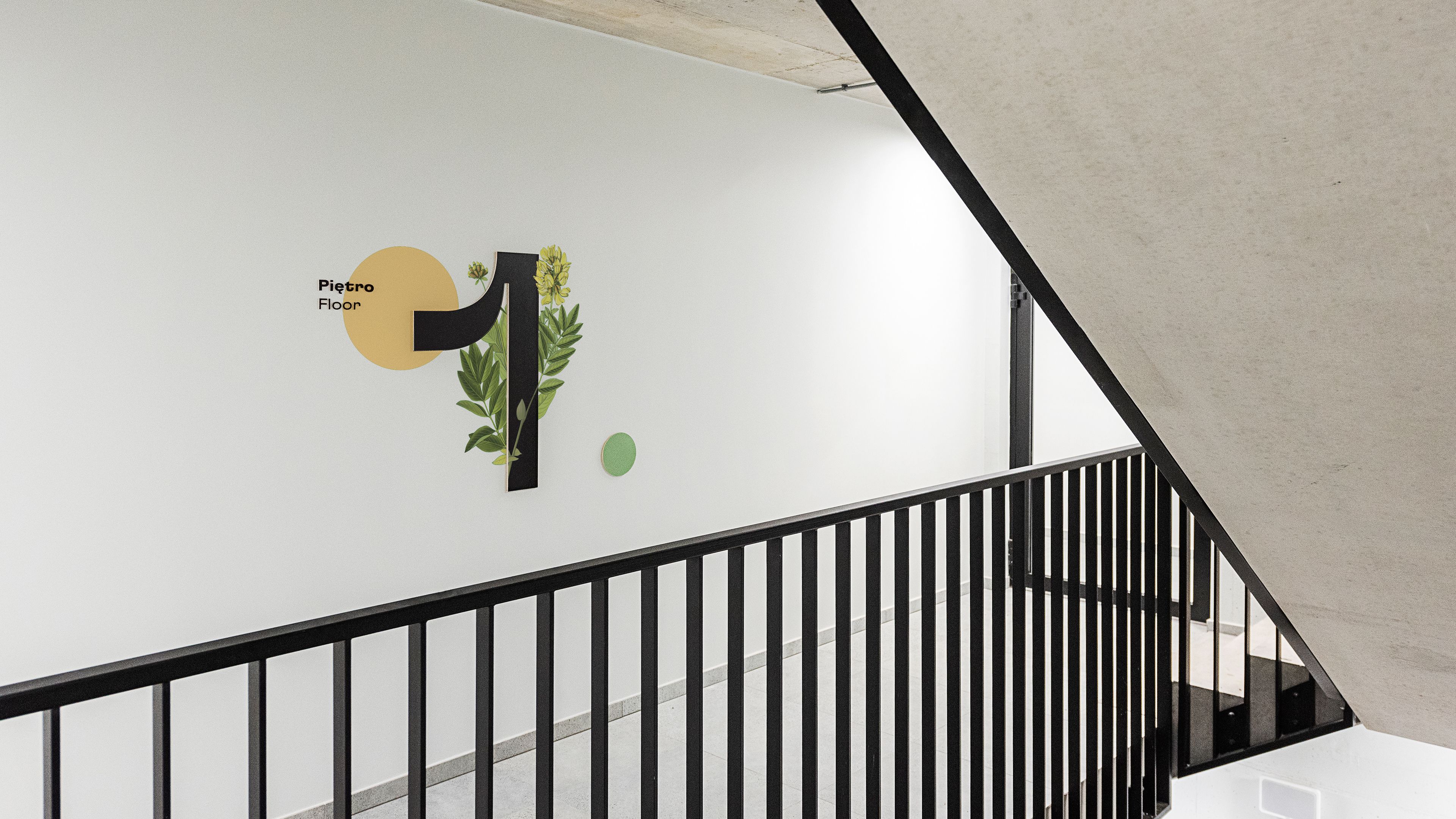 To balance the eclecticism achieved by the collages, we contrasted the illustrations with the modern typeface GT Flexa, designed by Grilli Type. A Bold style was used for Polish-language messages, while Regular was used for English-language messages. Both the colors and materials we used in this project have a natural feel - which complements many of the interior architecture elements already present in the building. Within some of the directional informations, plywood has been used, which gives the elements made of it a feeling of more spatiality. From the front it is painted/varnished to give it the desired color, while the sides of the material remain raw. Graphics are a combination of shades of green and pink, text messages to maintain the best possible contrast are painted black.
