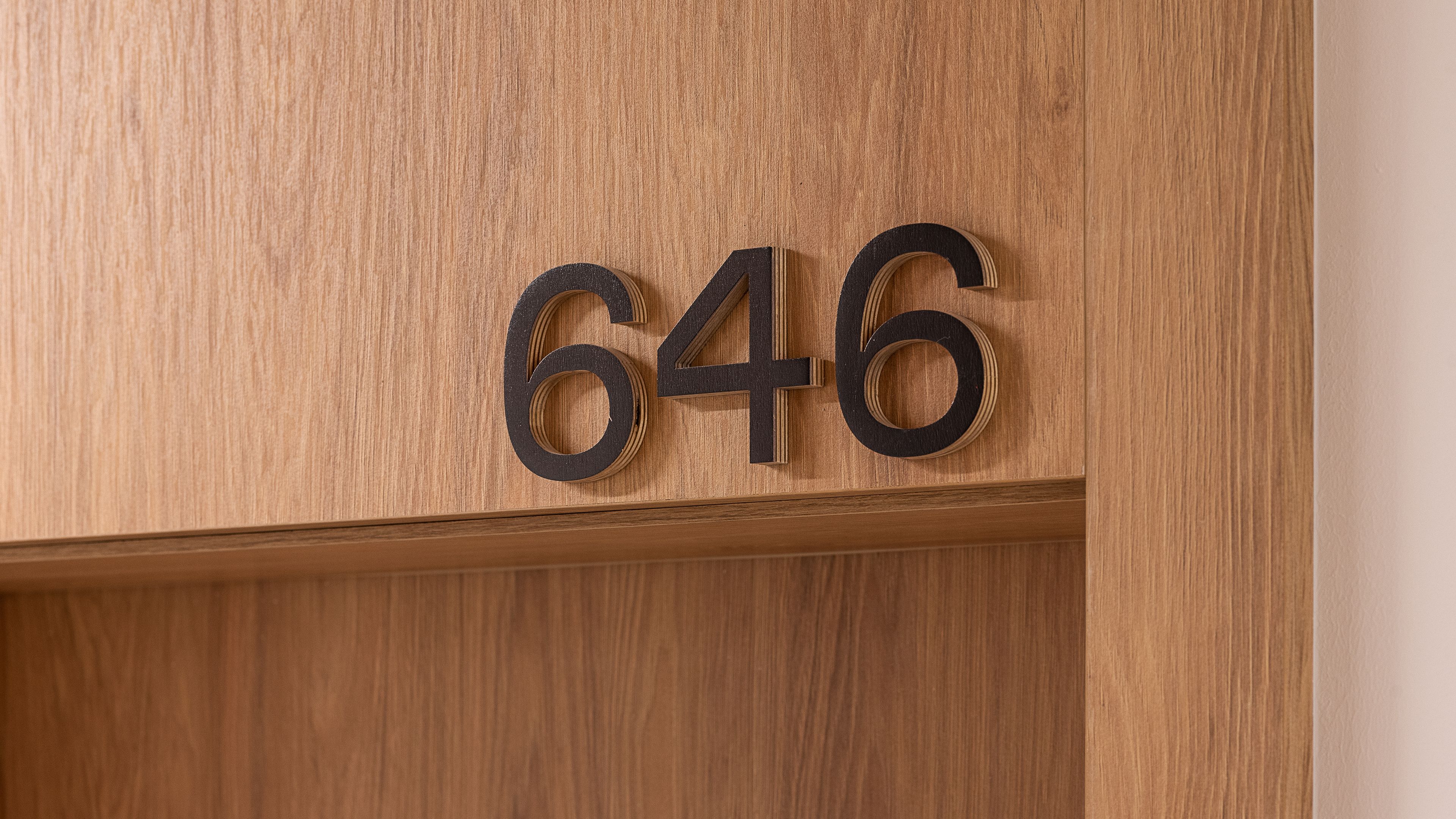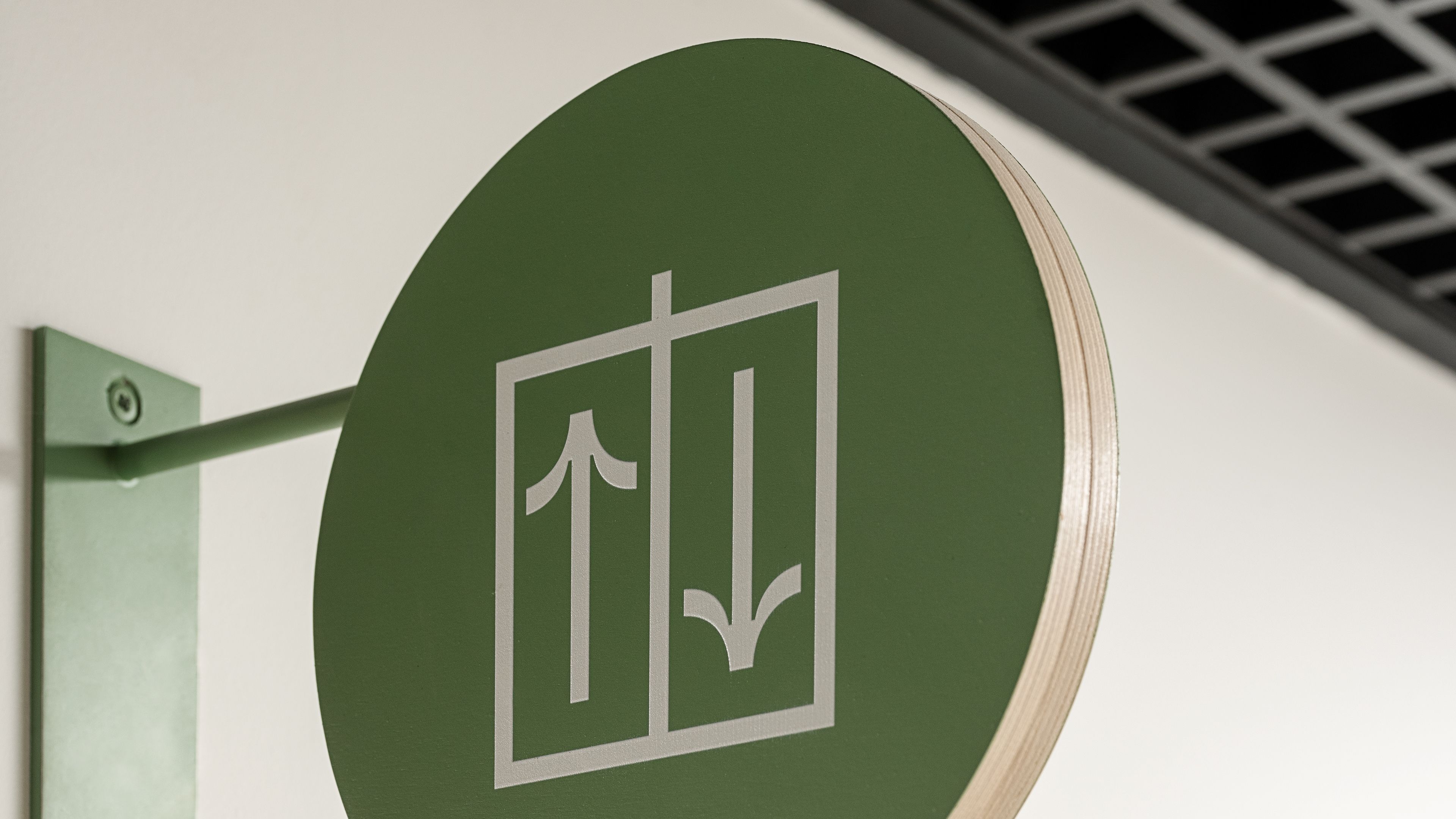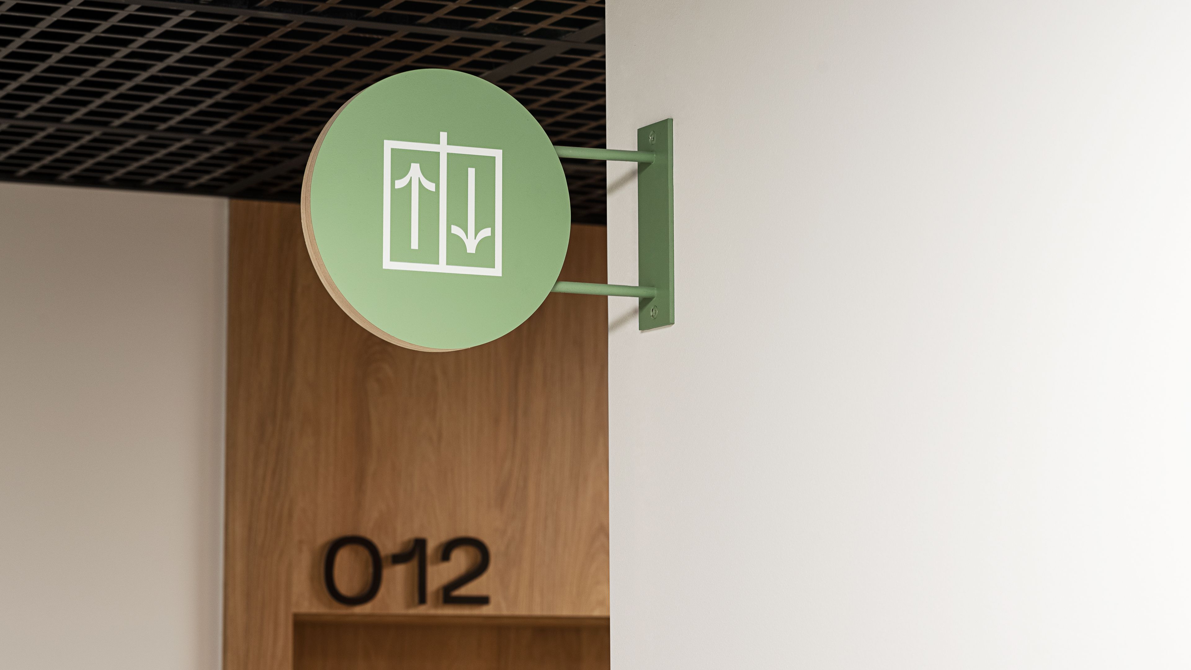 To balance the eclecticism achieved by the collages, we contrasted the illustrations with the modern typeface GT Flexa, designed by Grilli Type. A Bold style was used for Polish-language messages, while Regular was used for English-language messages. Both the colors and materials we used in this project have a natural feel - which complements many of the interior architecture elements already present in the building. Within some of the directional informations, plywood has been used, which gives the elements made of it a feeling of more spatiality. From the front it is painted/varnished to give it the desired color, while the sides of the material remain raw. Graphics are a combination of shades of green and pink, text messages to maintain the best possible contrast are painted black.