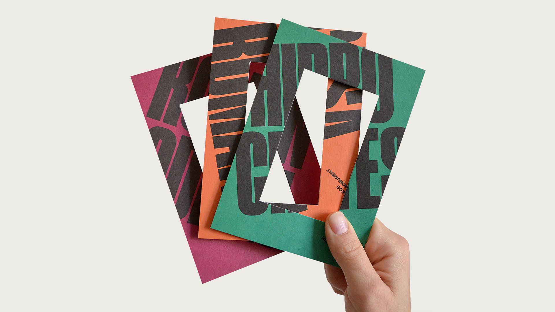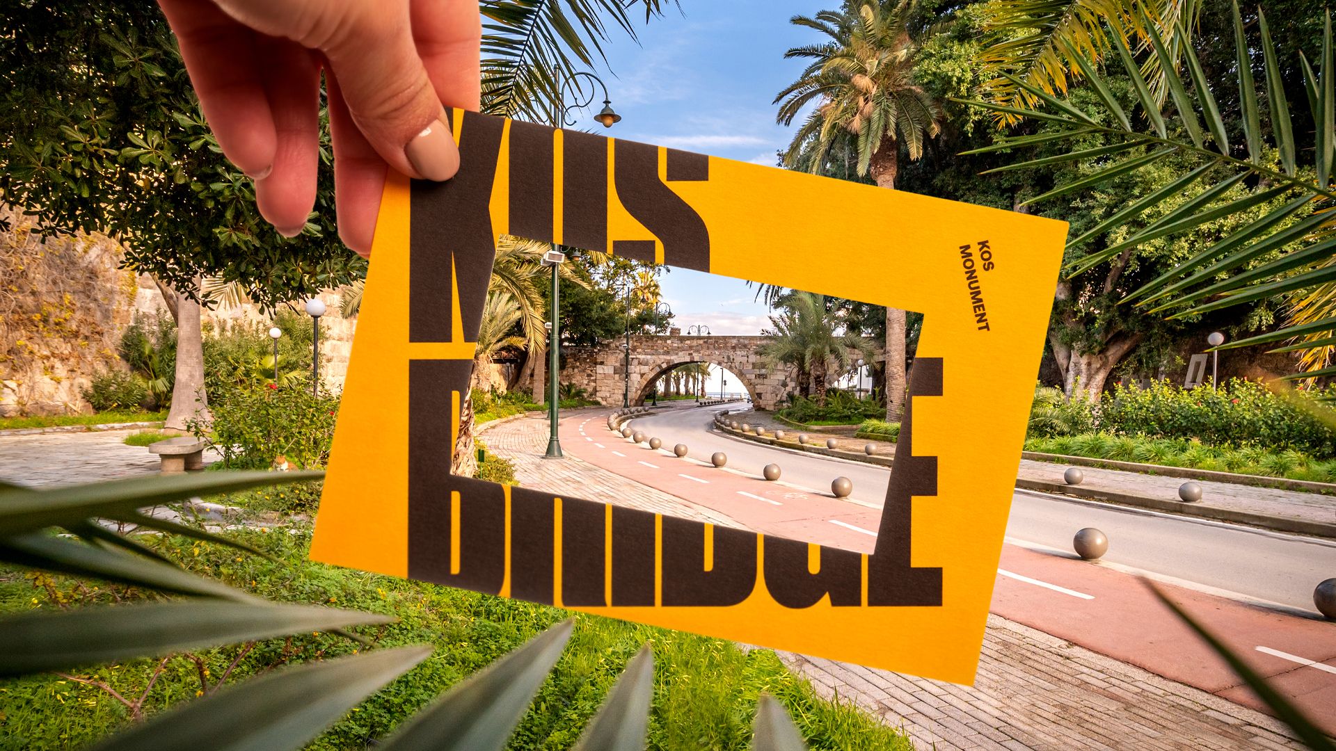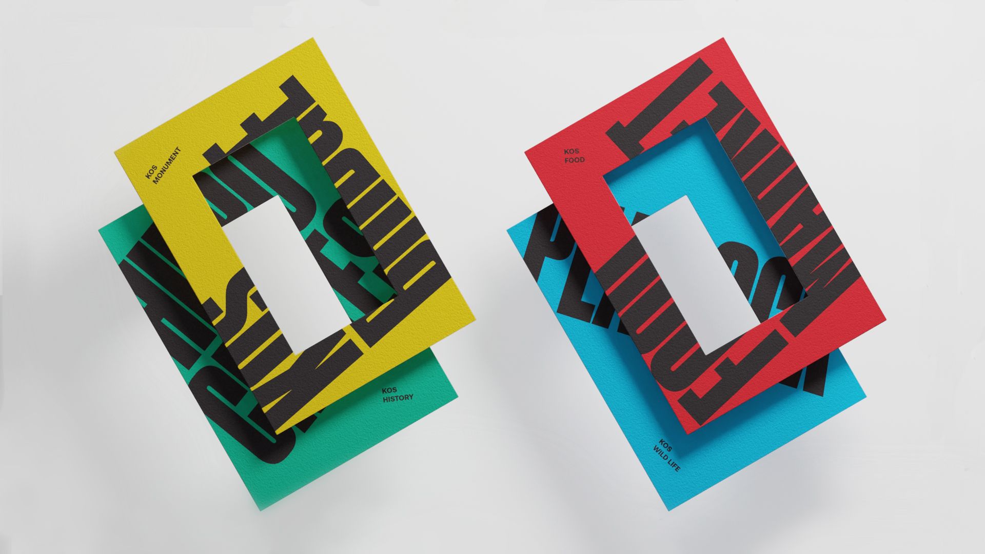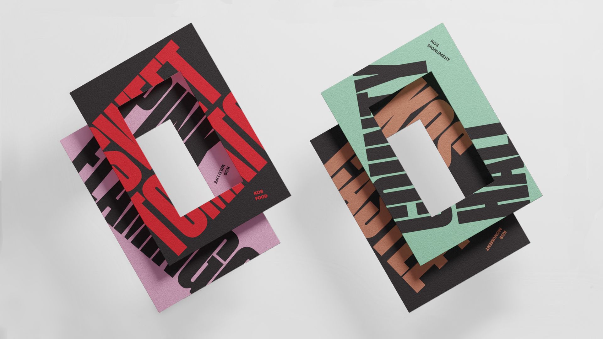 We designed a series of cardboard picture-frames inviting visitors to stand in front of a landmark, frame the action, take a pic, and share online. To maximise visitor engagement, we picked picture-perfect spots of: Monuments, History, Food, and Wildlife, and designed typographic frames, that create an emotive connection between visitors and island landmarks, while educating them on local history, and customs. Using simple typography in bright colours, we typed the name of a landmark and removed the core, so that the physical landscape literally fills in the card and complements the typography. Kos frames were shared at Kos’s exhibition stand at the Berlin and Utrecht tourism fares, and at local hotels as giveaway gifts.
