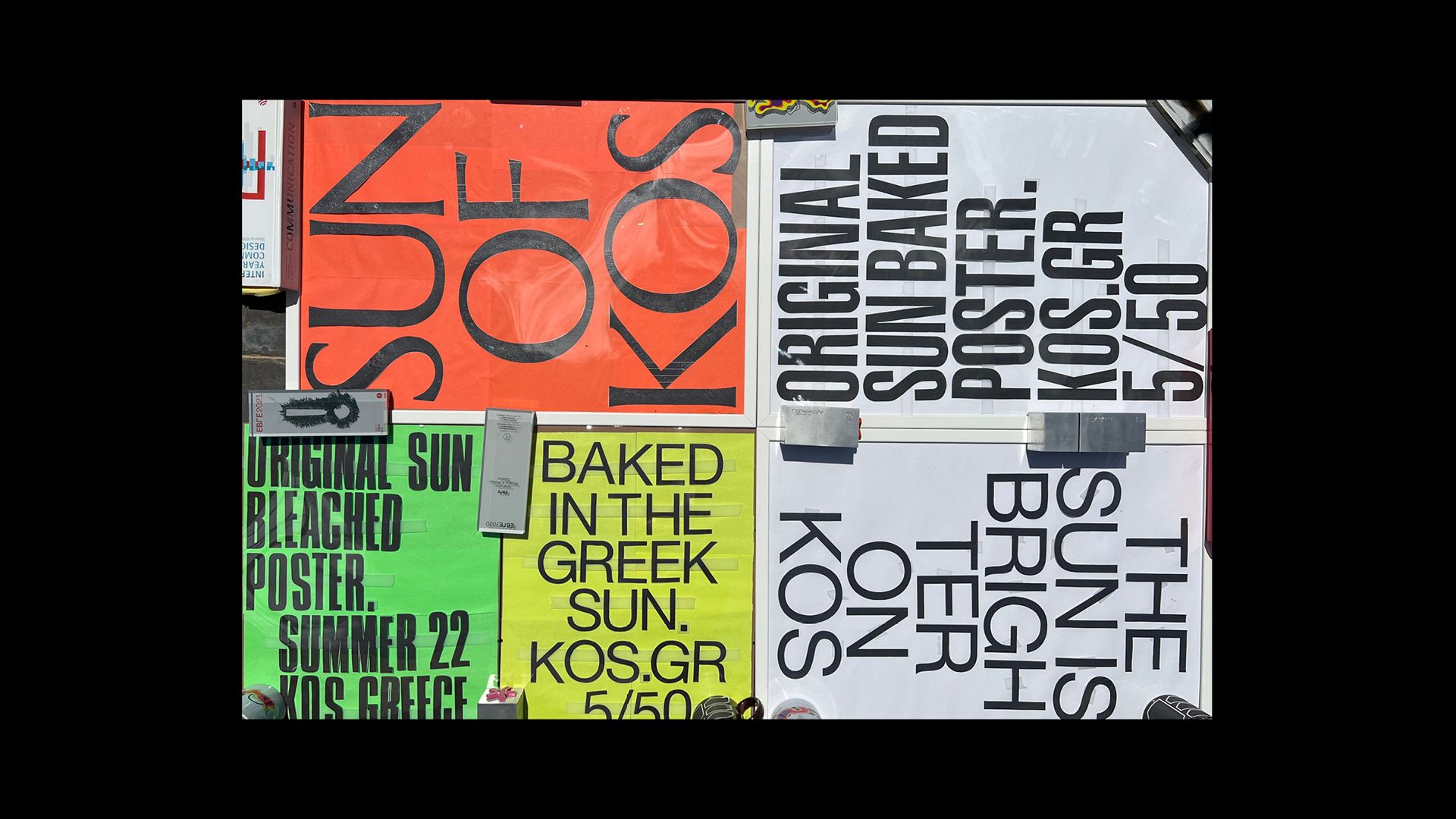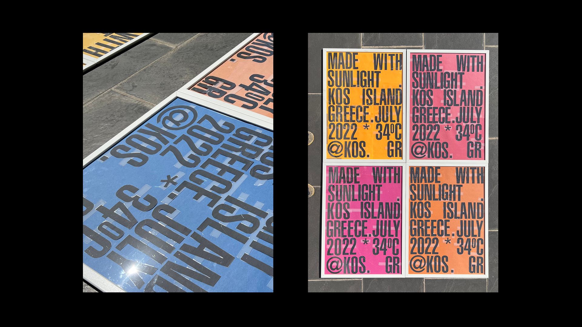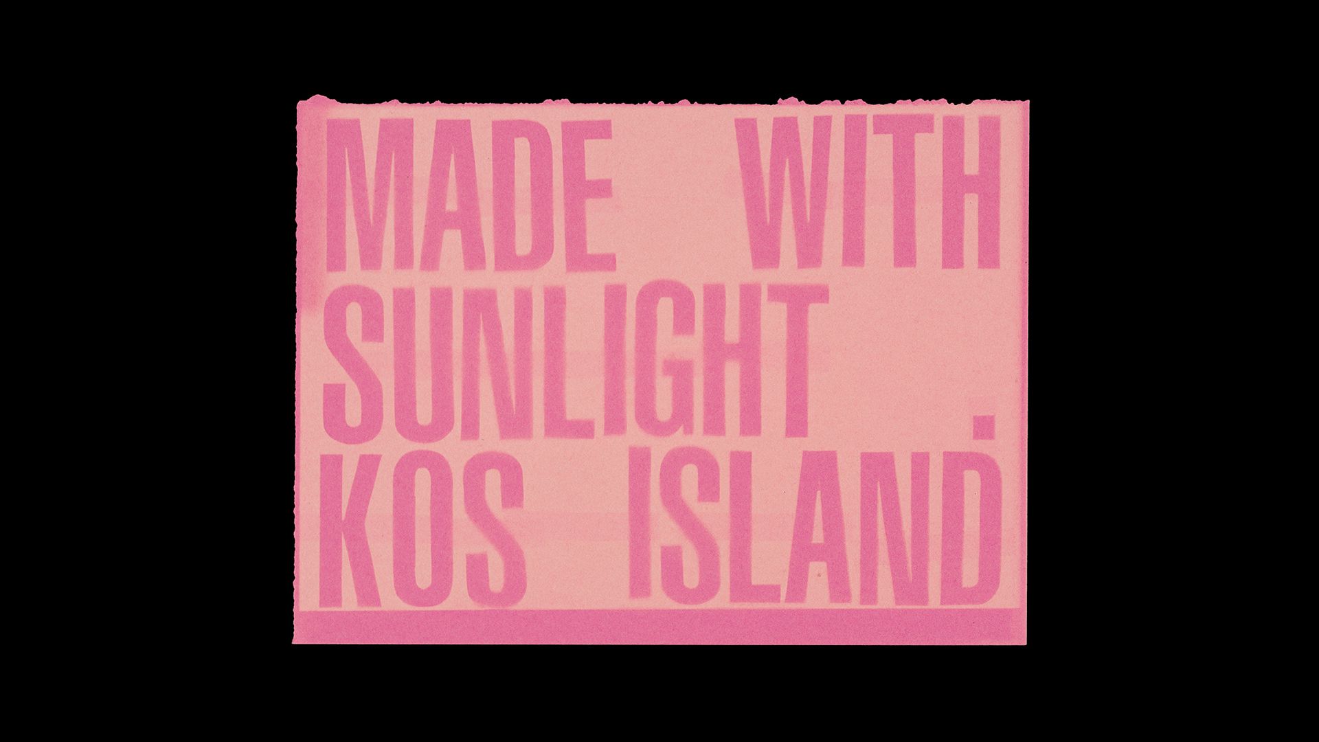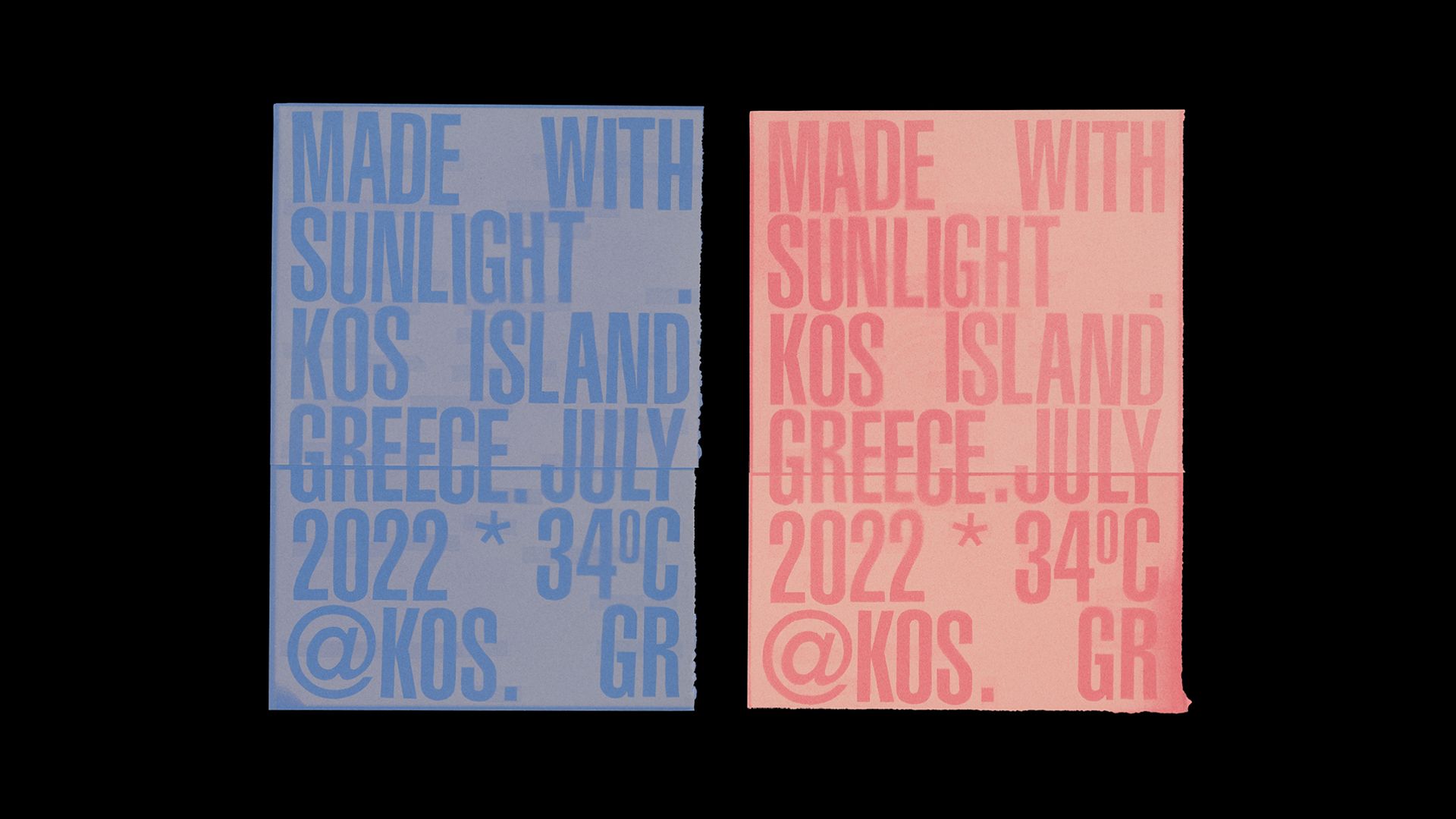 Helioprints is a body of work resulting from an experiment that uses sunlight’s natural property of bleaching paper. Working on a branding project for a Greek island, we discovered that white paper left in the sun is prone to yellowing and examined ways to harness the process and produce inkless artwork, printed with sunlight. Researching the chemical qualities of paper, we selected untreated papers rich in wood pulp and lignite, that are particularly sensitive to the sun’s natural UV light. To produce the artwork, we made stencils from handprinted and cut typographic elements and collected dry leaves, seeds, and flowers. We arranged the elements on sheets of 5 mm. clear acetate, secured them in frames and laid them on a variety of papers. Experimenting with exposure times, daylight temperatures and other contributing factors, we produced a series of bleached posters printed with sunlight. Each Helioprint constitutes a unique piece of work, a one-of-a-kind contact sheet drawn with sunlight. The natural process gives the prints a unique visual style, a blurring of the edges around the stencils, as objects come in direct contact with the surface of the paper. Body of work 18 Helioprints. Numbered and dated. Exposure: May-October 2022 1-35 hours of natural sunlight, 9.00-17.00, 35οC+. Stencils on Kraft and Sugar paper, 120 gr. (various colours), Newsprint, and Munken Print White paper 90 gr.