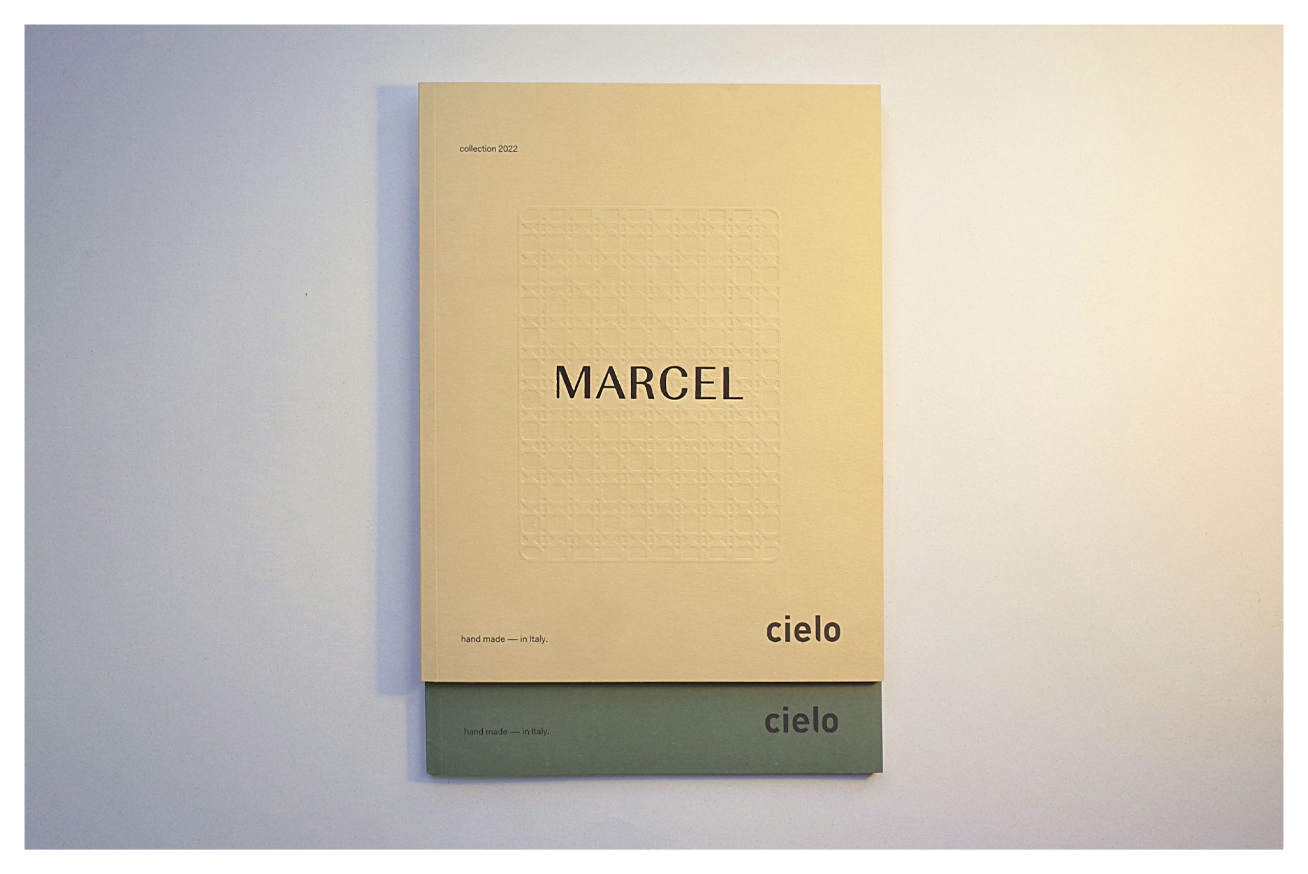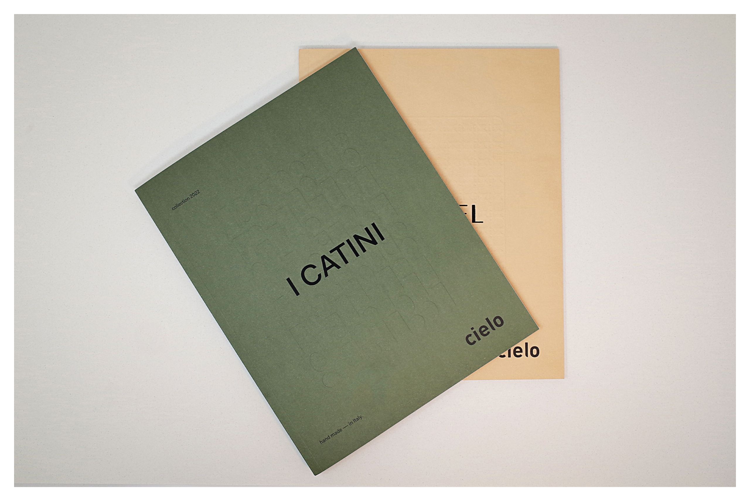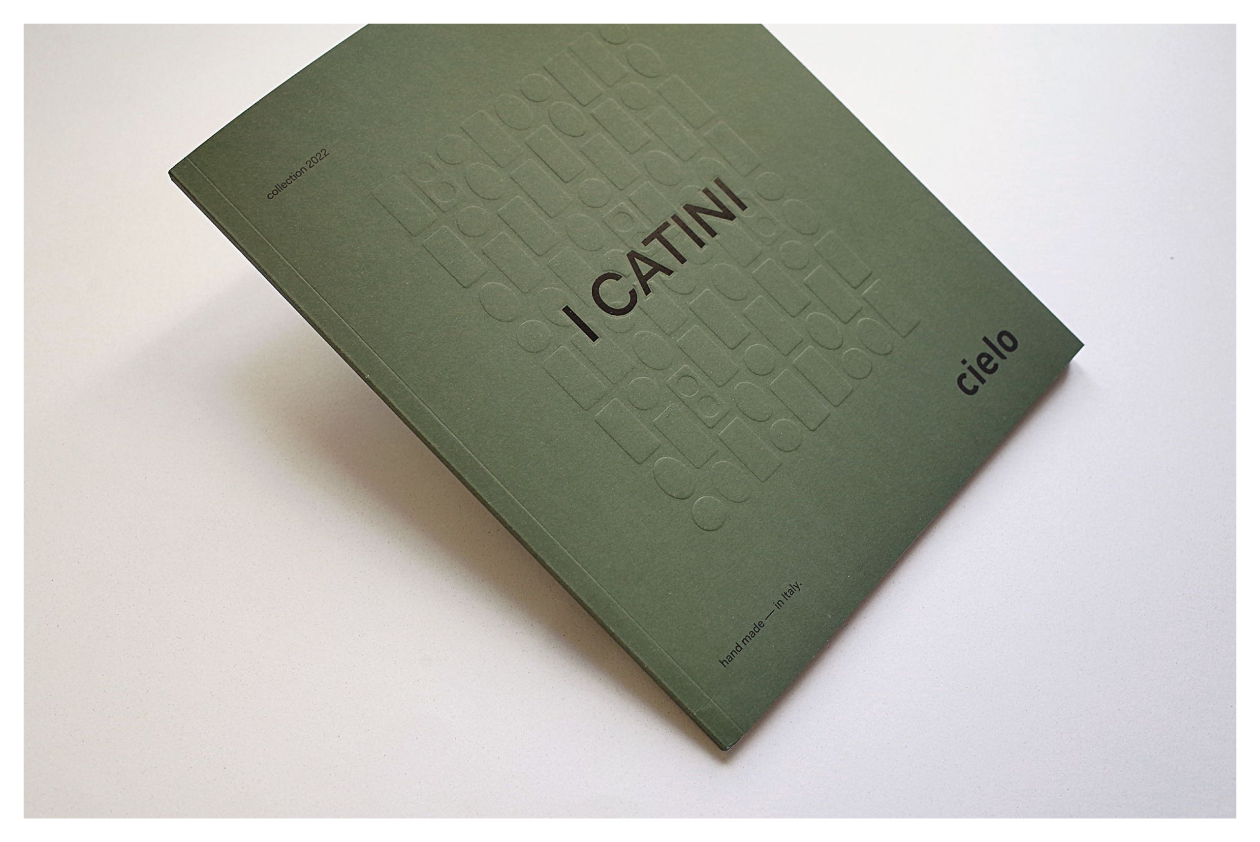 A series of new catalogues for Ceramica Cielo collection 2022. A collection of small publications that showcase individual and different products of the brand. Each product has its own characteristics and language, which are also meant to be represented through the graphics and printing techniques used; the covers, chapter openings, fonts, and colors always change to make the character and peculiarities of the product evident. The first one is Marcel with rational and elegant shapes in curved wood and Vienna straw, the punch on the cover and the card inserted with laser cut immediately create a connection with this product. Catini plays on the different base shapes of this collection, and on the infinite combinations of glossy and opaque colors that can be created on the same piece of furniture.