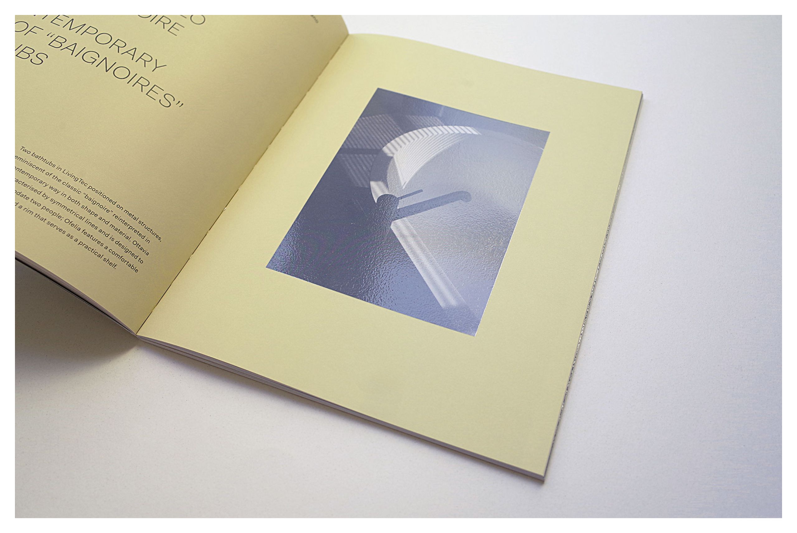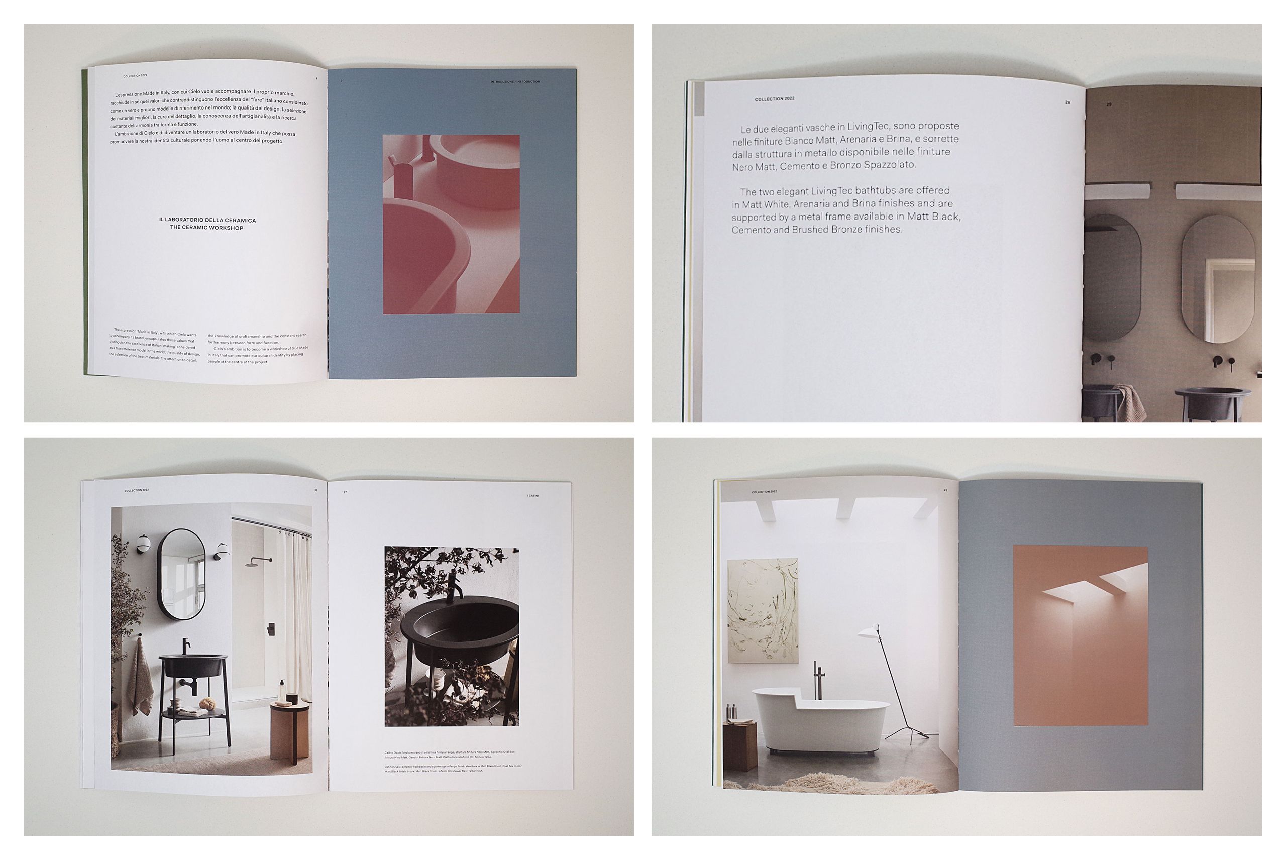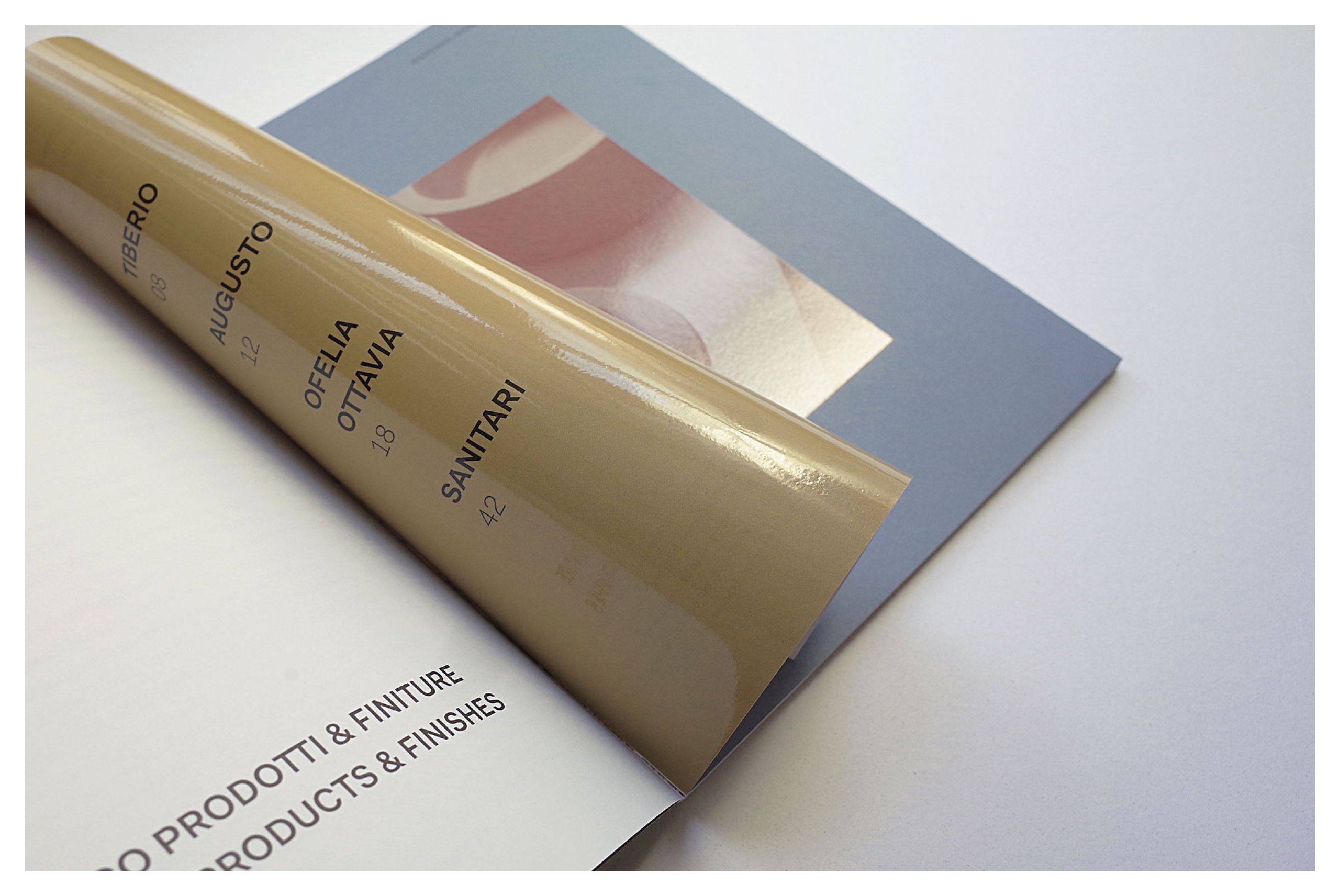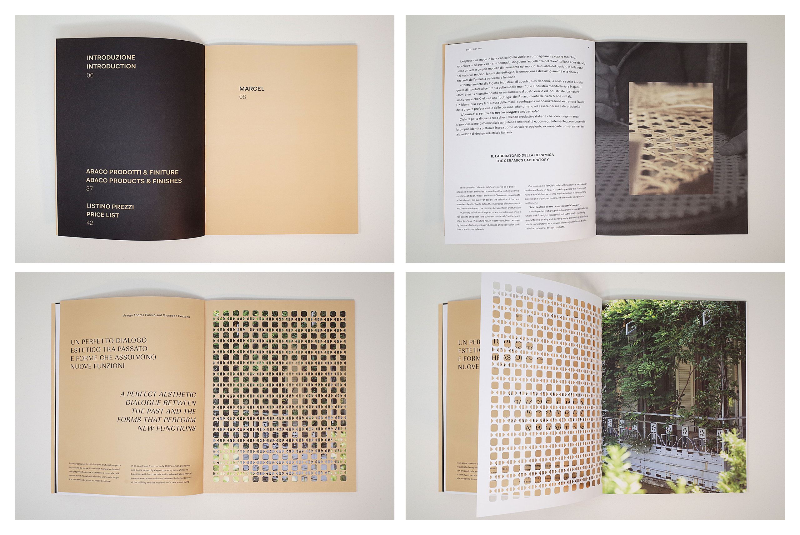A series of new catalogues for Ceramica Cielo collection 2022. A collection of small publications that showcase individual and different products of the brand. Each product has its own characteristics and language, which are also meant to be represented through the graphics and printing techniques used; the covers, chapter openings, fonts, and colors always change to make the character and peculiarities of the product evident. The first one is Marcel with rational and elegant shapes in curved wood and Vienna straw, the punch on the cover and the card inserted with laser cut immediately create a connection with this product. Catini plays on the different base shapes of this collection, and on the infinite combinations of glossy and opaque colors that can be created on the same piece of furniture.