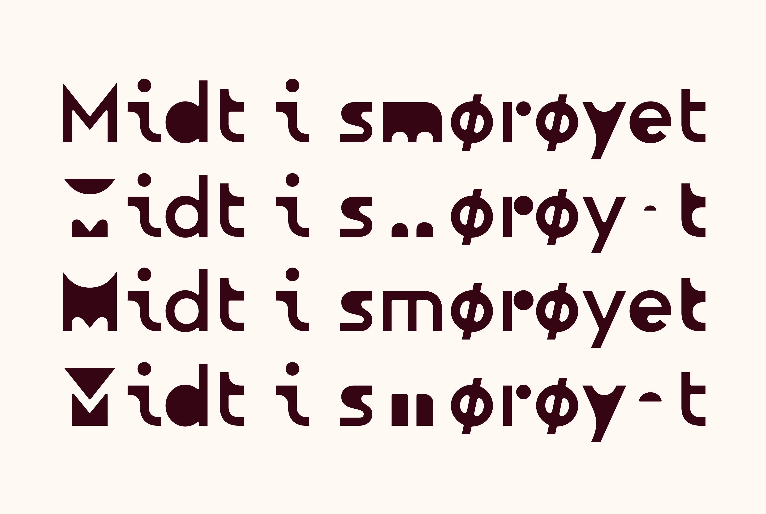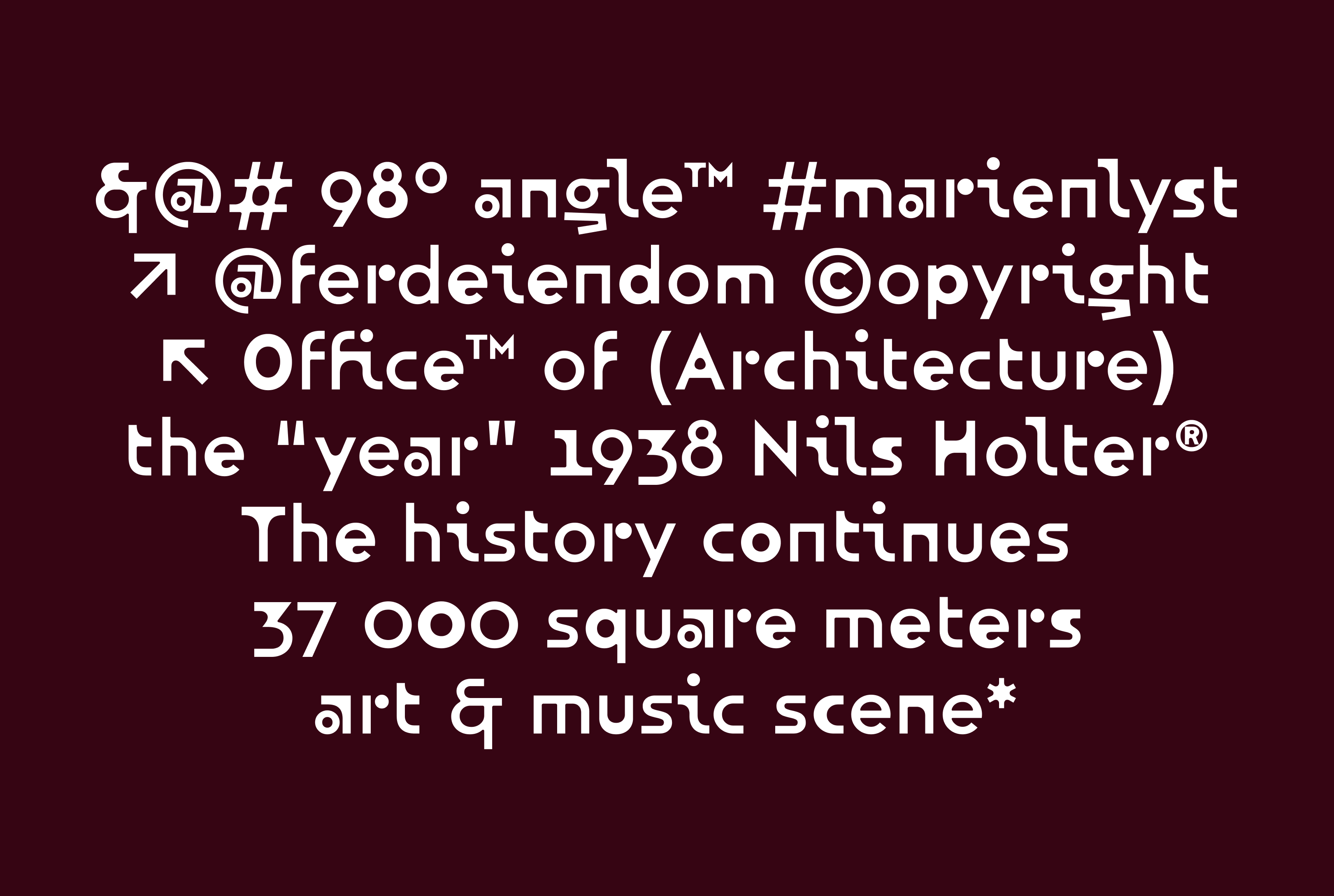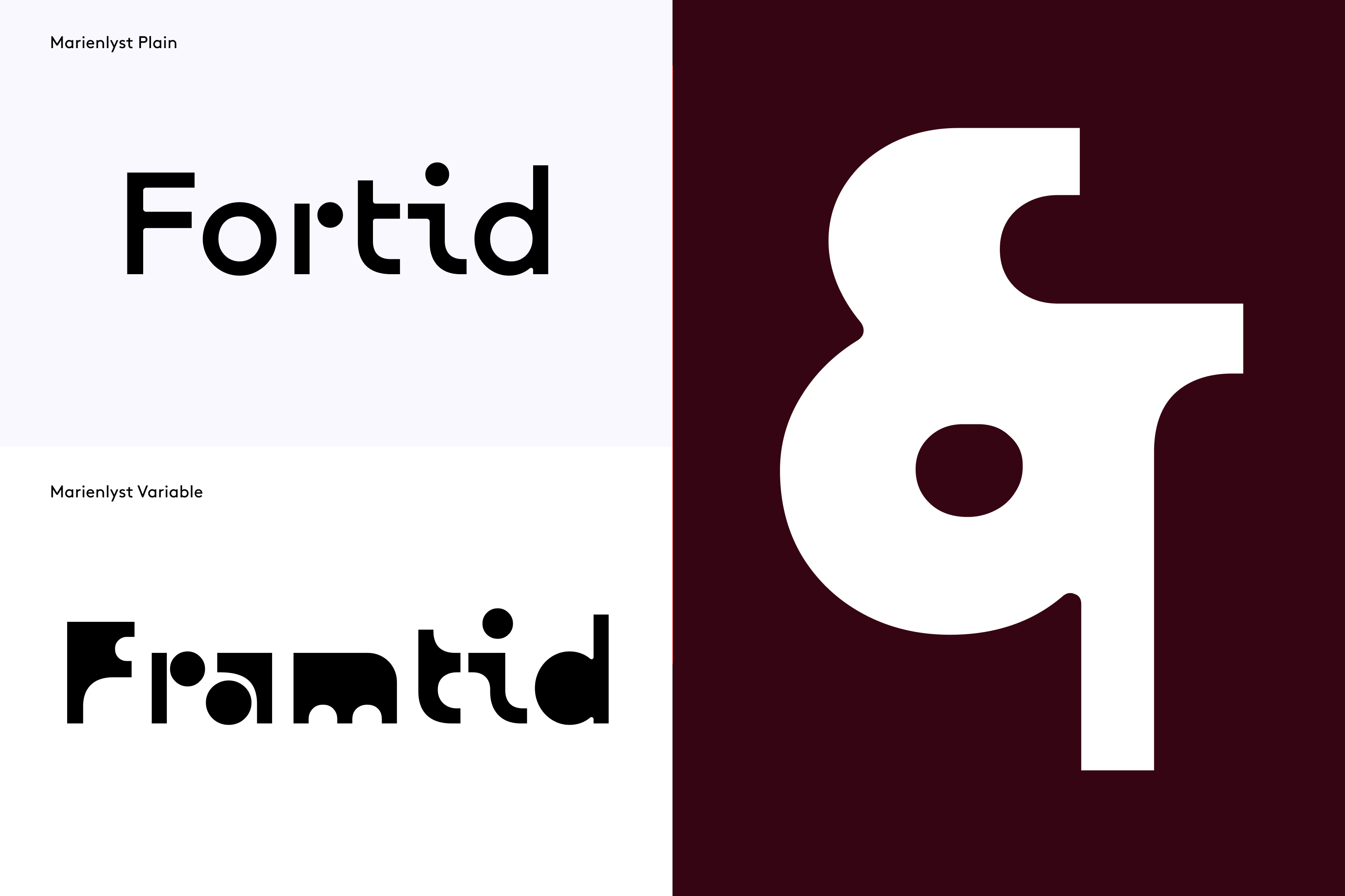 Concept: Marienlyst Display will be a focal point with references from NRK's architecture and distinctive visual qualities. The variable typeface is rooted in the concept - The Story continues - and represents transformation and movement between history and the future. The basic shape is inspired by the architecture of Kringkastingshuset (KKH) and Store Studio – the listed building next door. The contrast between the KKH's brutal square shape and Store Studio's organic asymmetry is reflected in letter forms. A nod to NRK is shown in minuscule r, which is also found in the original drawings of Paul Renner's Futura from 1927, made in the period when architect Nils Holter designed the winning entry for KKH. The listed facade is reflected in how the outer shape of the letters is preserved, while the inner shape undergoes a transformation symbolizing that the building will soon be filled with new life. The font is designed with flexible animation in mind. It also has its own style sets with negative shapes to make Marienlyst Display a solid display with surprising qualities.
