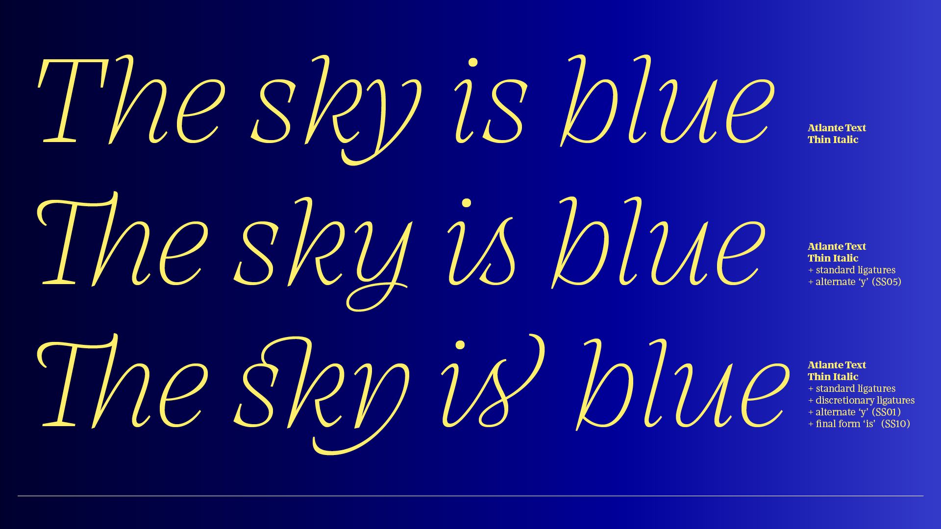 The first thing likely noticed is the sharpness and precision of Atlante’s forms, which makes sense, as it originally stemmed from the idea of an italic-only family. Care was taken with the extreme weights and delicate contrast to maintain its sophistication in pixel and on paper.