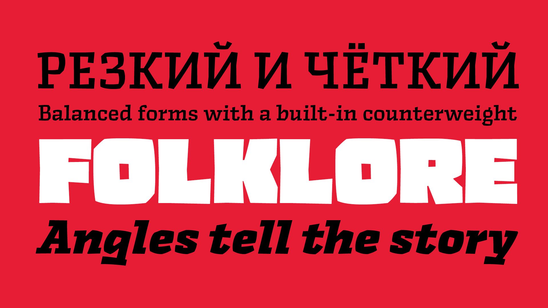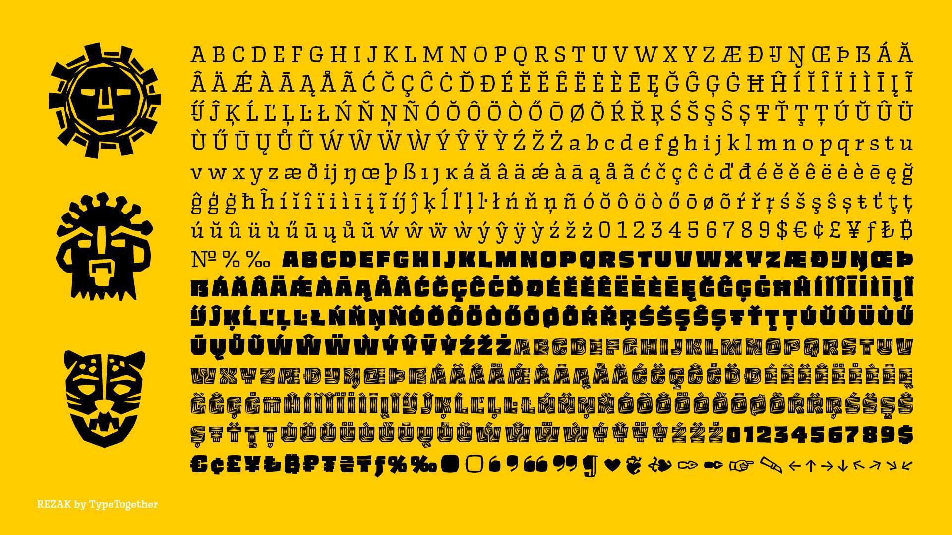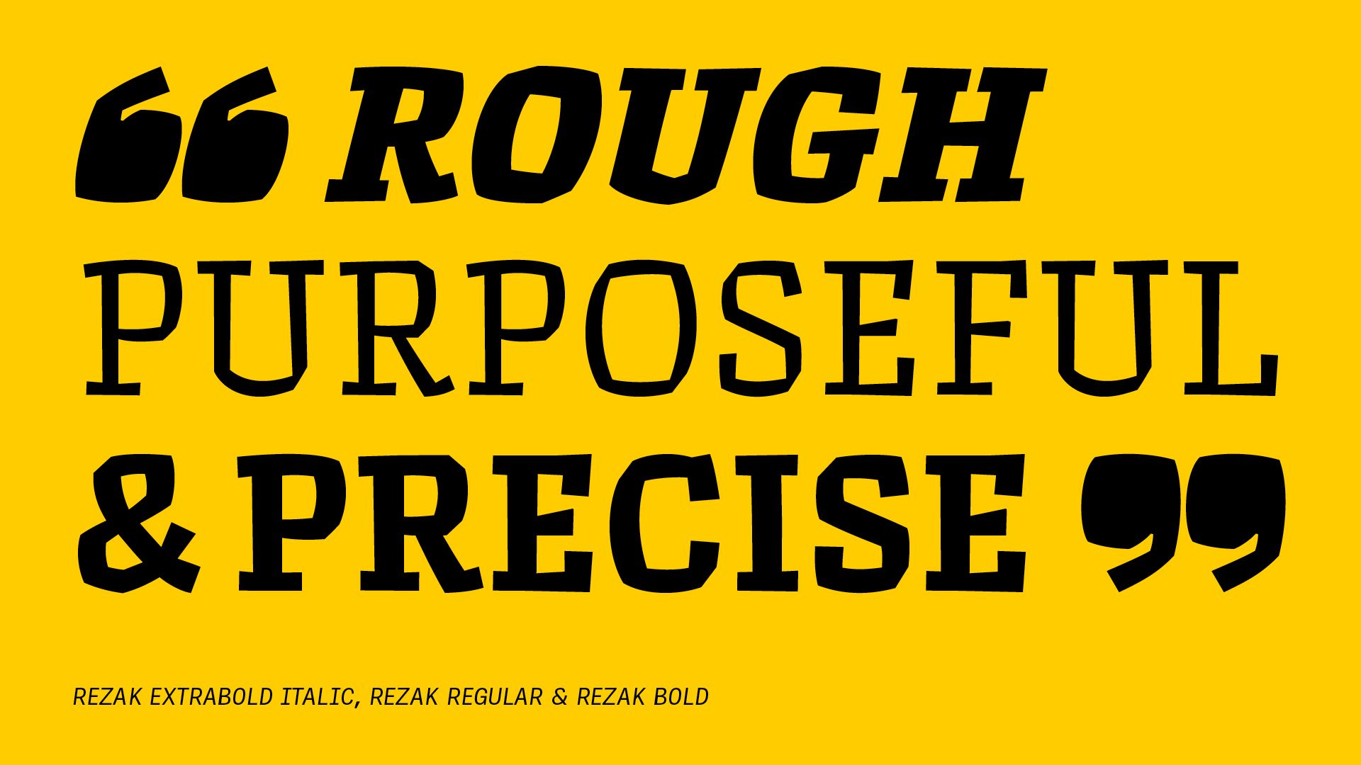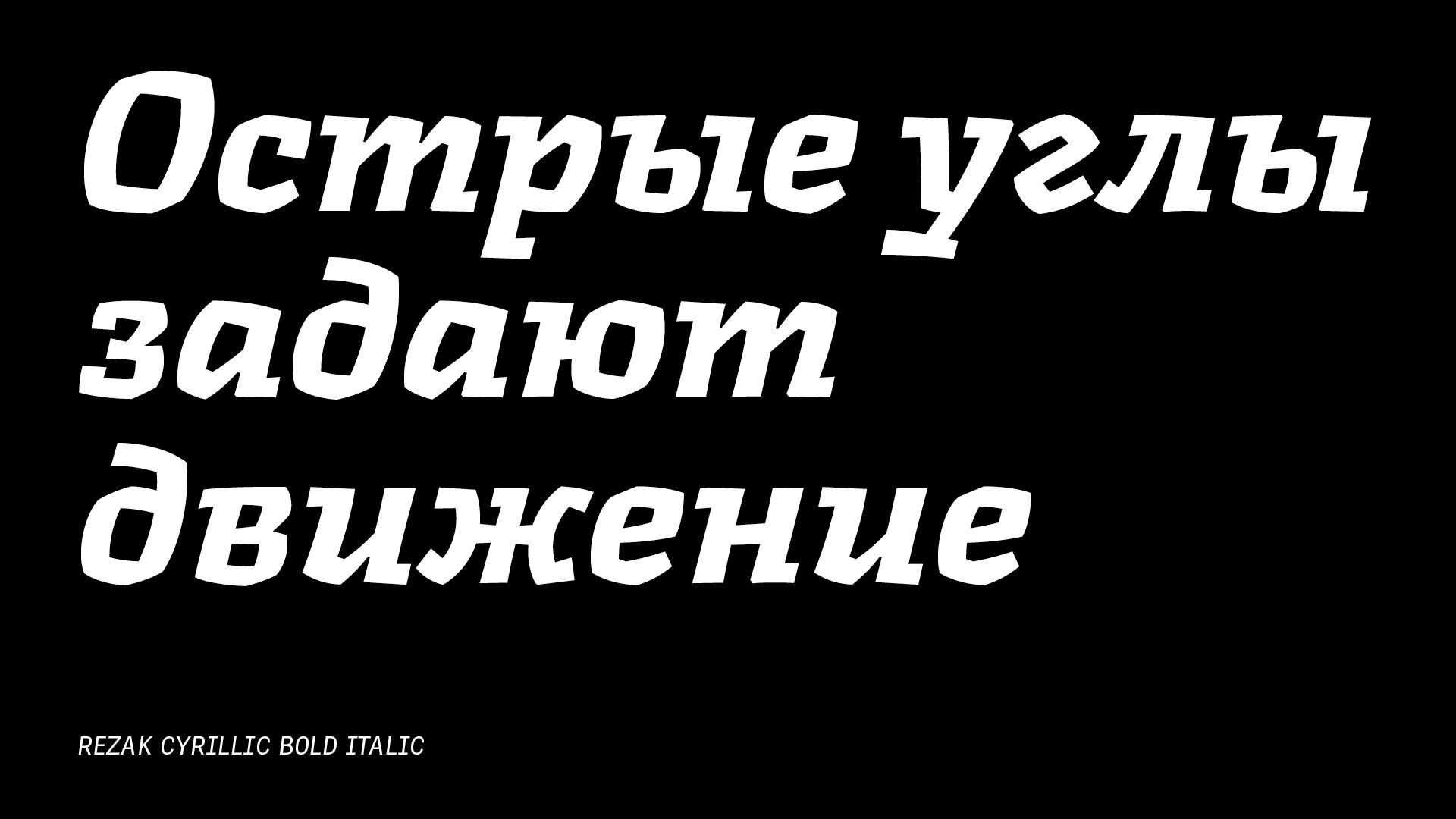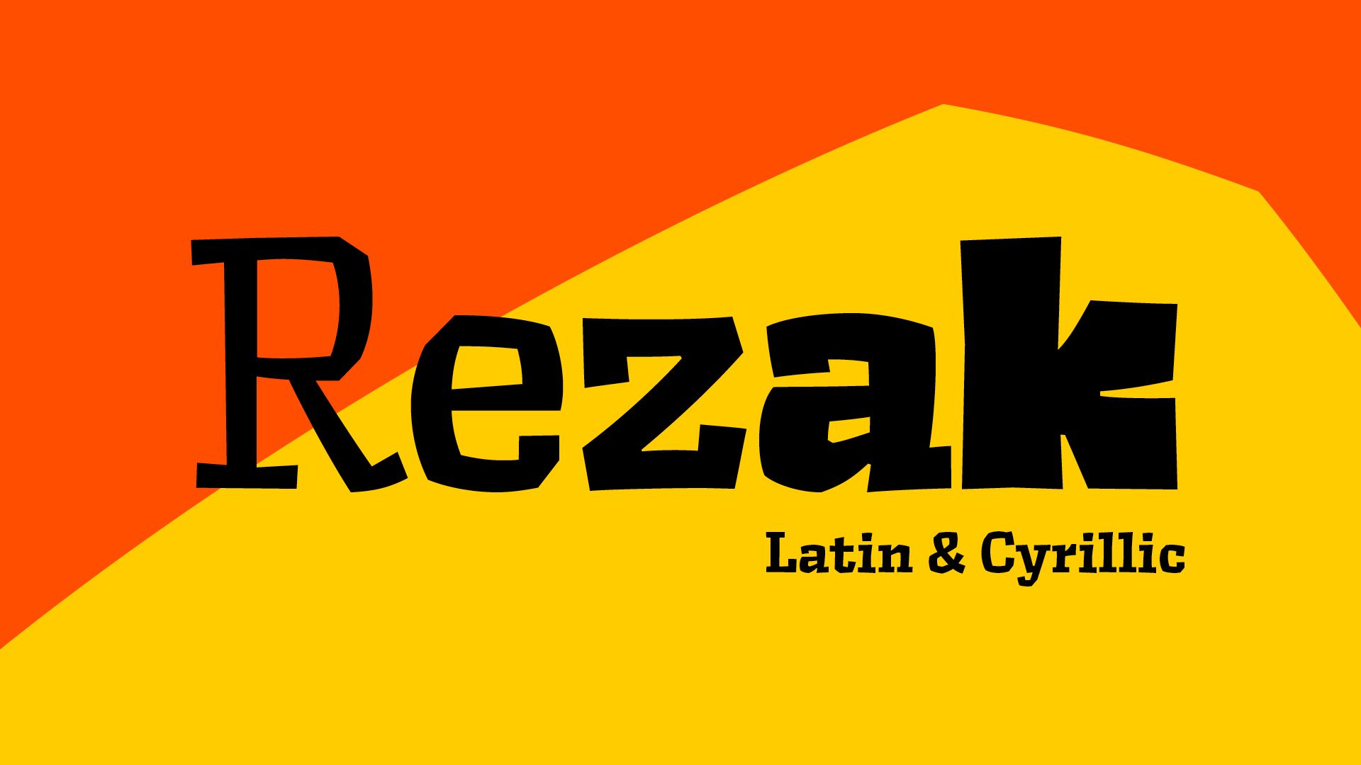 Rezak’s crunchy letters are meant to expose rough, daring, or dramatic text. A further benefit is that this family is not sequestered within one specific genre or script, so it can be easily interpreted for other scripts, such as its current Latin and extended Cyrillic which supports such neglected languages as Abkhaz, Itelmen, and Koryak. Rezak’s push toward creativity and innovation, with an eye on typography’s rich history, reinforces our foundry’s mission to publish invigorating forms at the highest function and widest applicability.