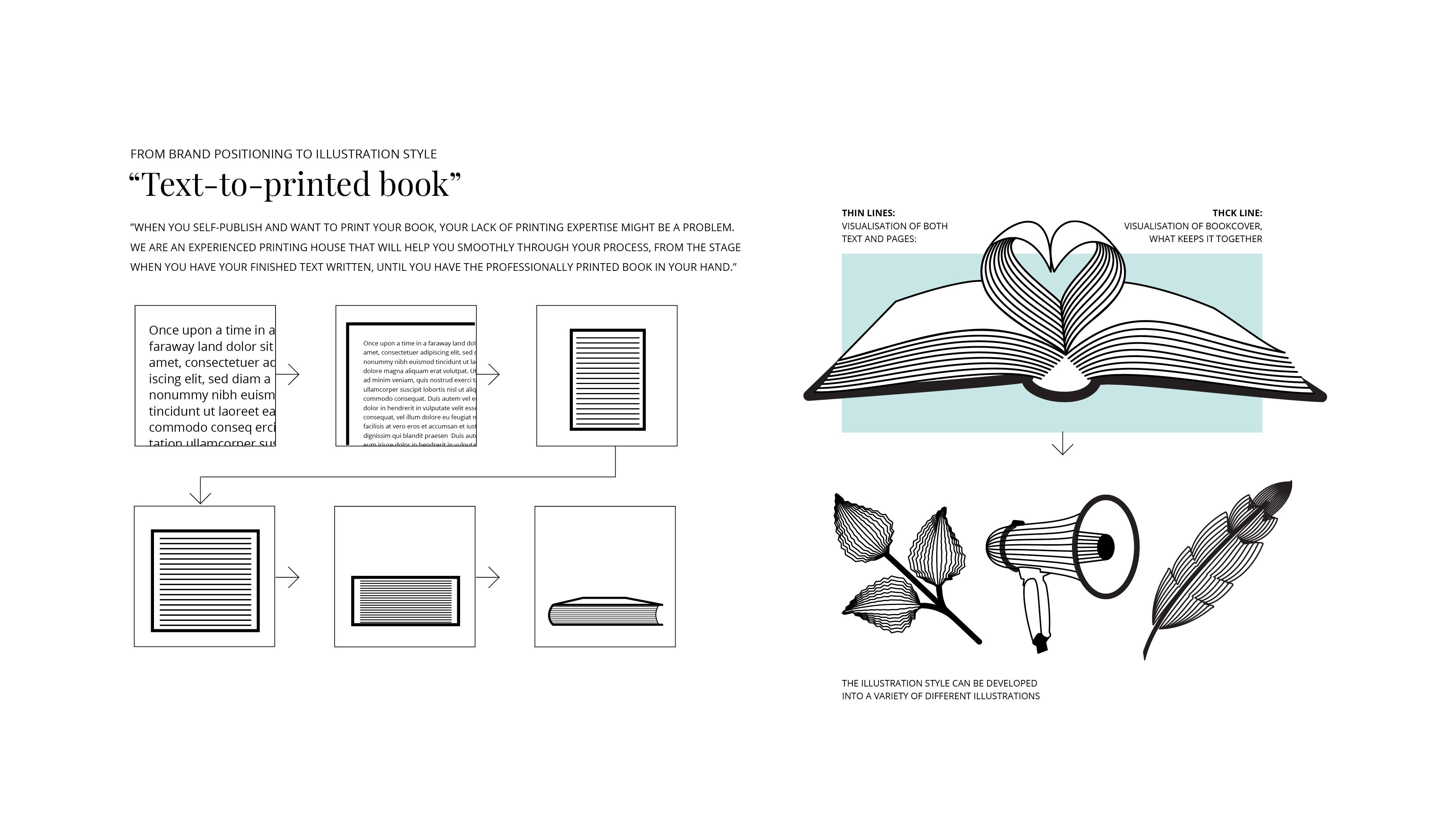 Authors often think of their book as ”their baby”, so it was important to create an identity where the author felt safe and respected. A positioning was developed focusing on the safe journey from the authors’ text to the finished, professionally printed, book. An illustration style was derived from the same positioning. The lines in the illustrations refers to both how sentences and how pages are sketched. The thicker black line indicate the book cover, black and white suggest paper and ink. The illustration is often paired with a coloured rectangle, hinting at all the variable sizes books can be printed.
