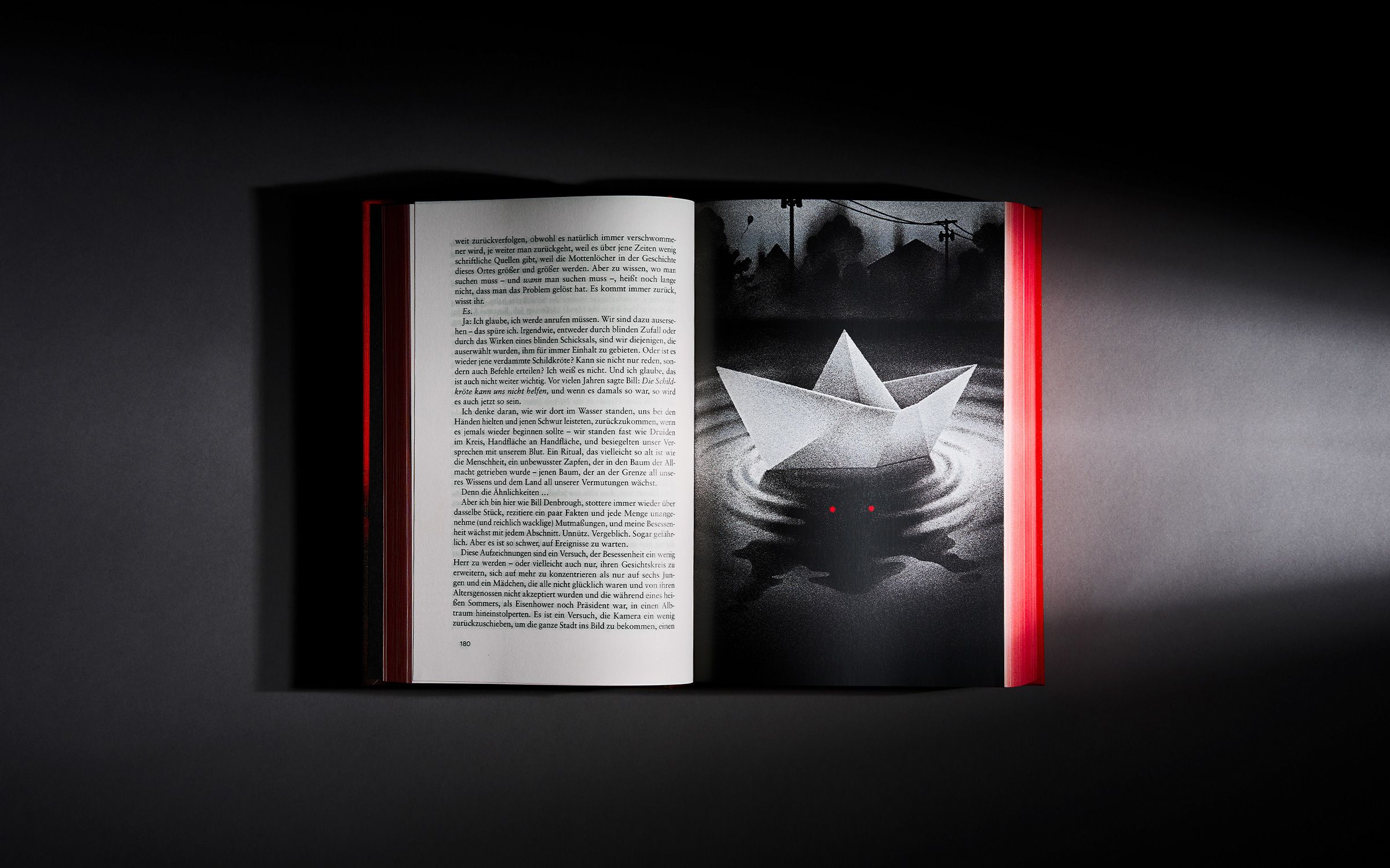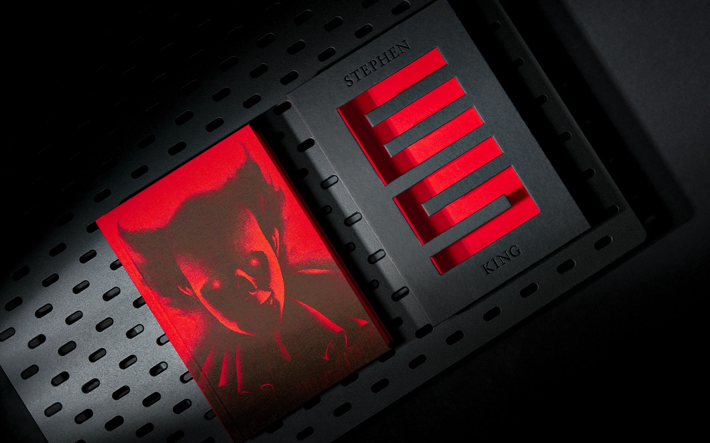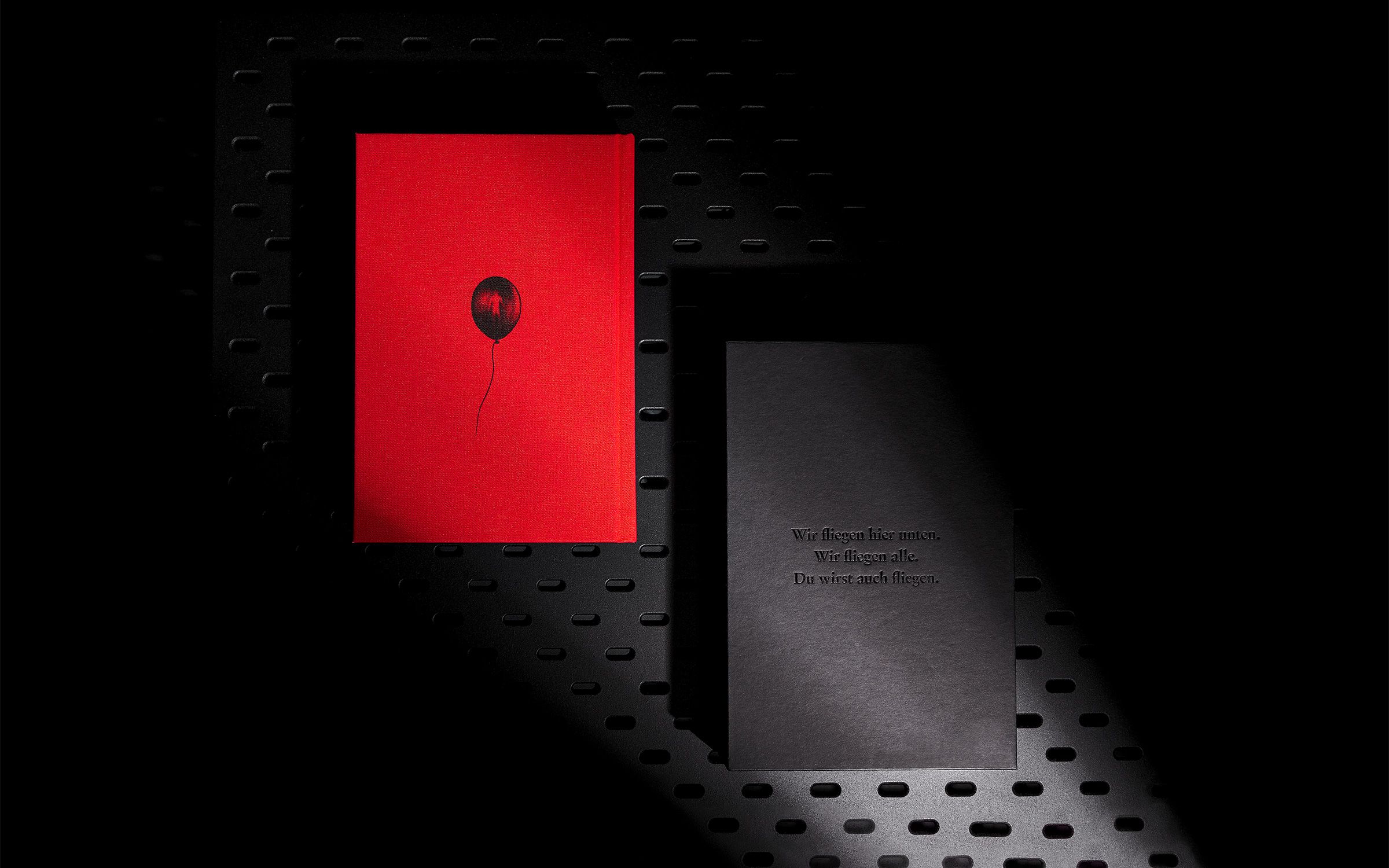 Cover and back are already part of the story: The story starts on the front. Pennywise, the main character, can be seen luring his victim to him through the manhole cover, symbolized by the punching of the title "ES." On the back of the slipcase, you can read the final quote embossed with black foil on black paper: „Oh yes, they float.