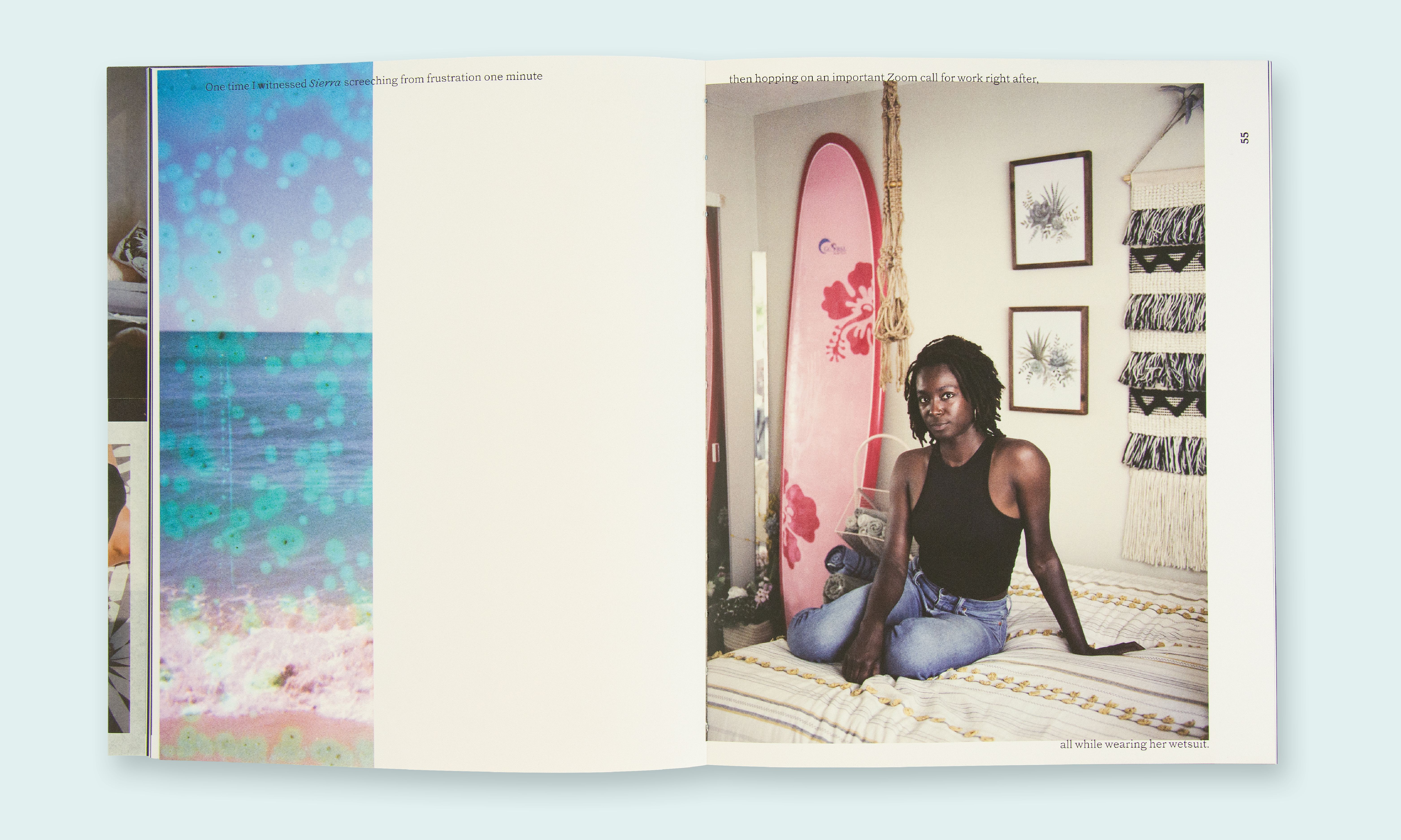 I Just Wanna Surf centers on more things than just one. On top of the surfing and being Black and being a woman, there also is a mental-health struggle.The book design narrates the story through a number of sections (they’re not strictly delineated or separated as chapters), into which blocks of text have been set. The text serves to introduce the many aspects of the book that no picture could fully tell.