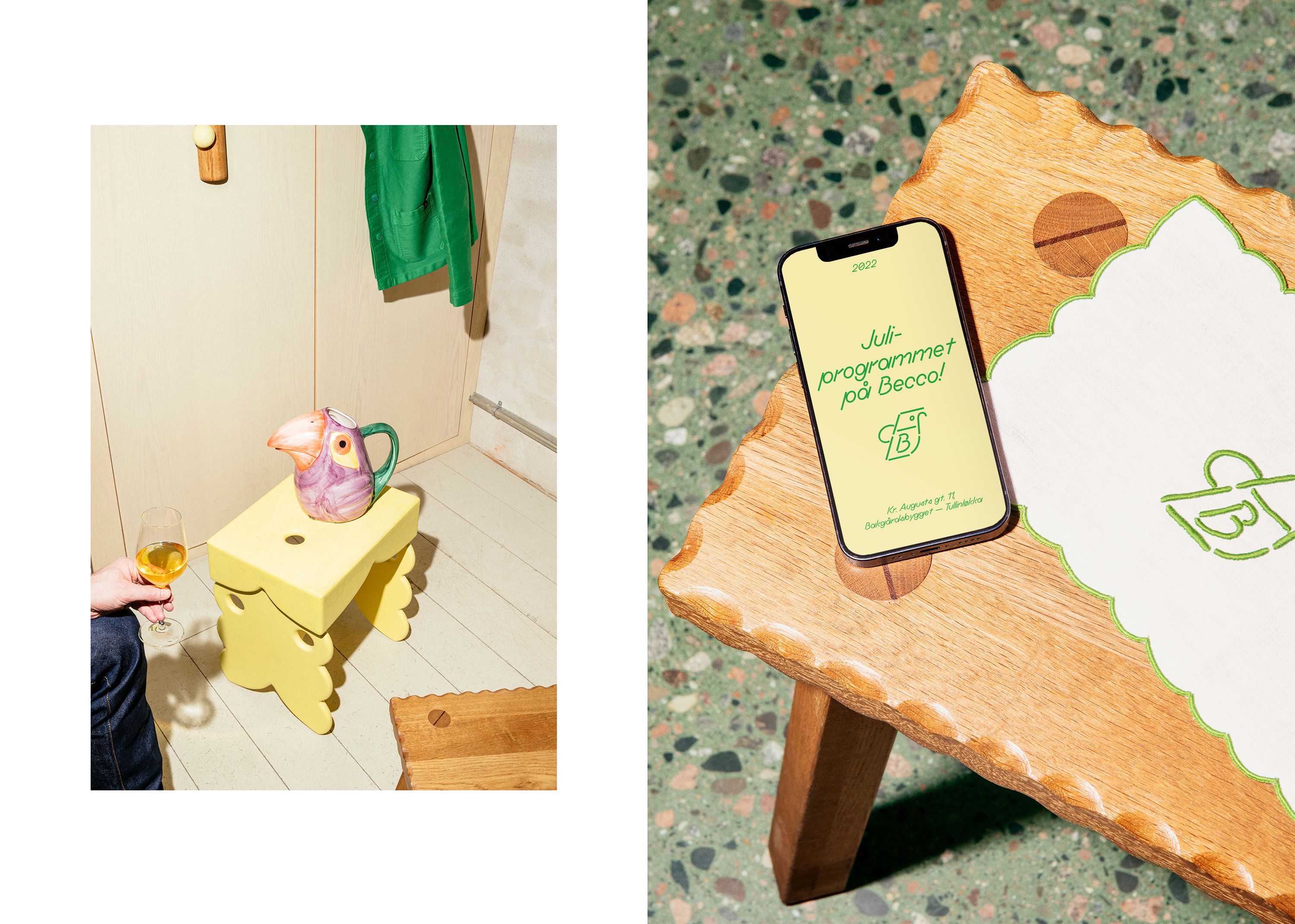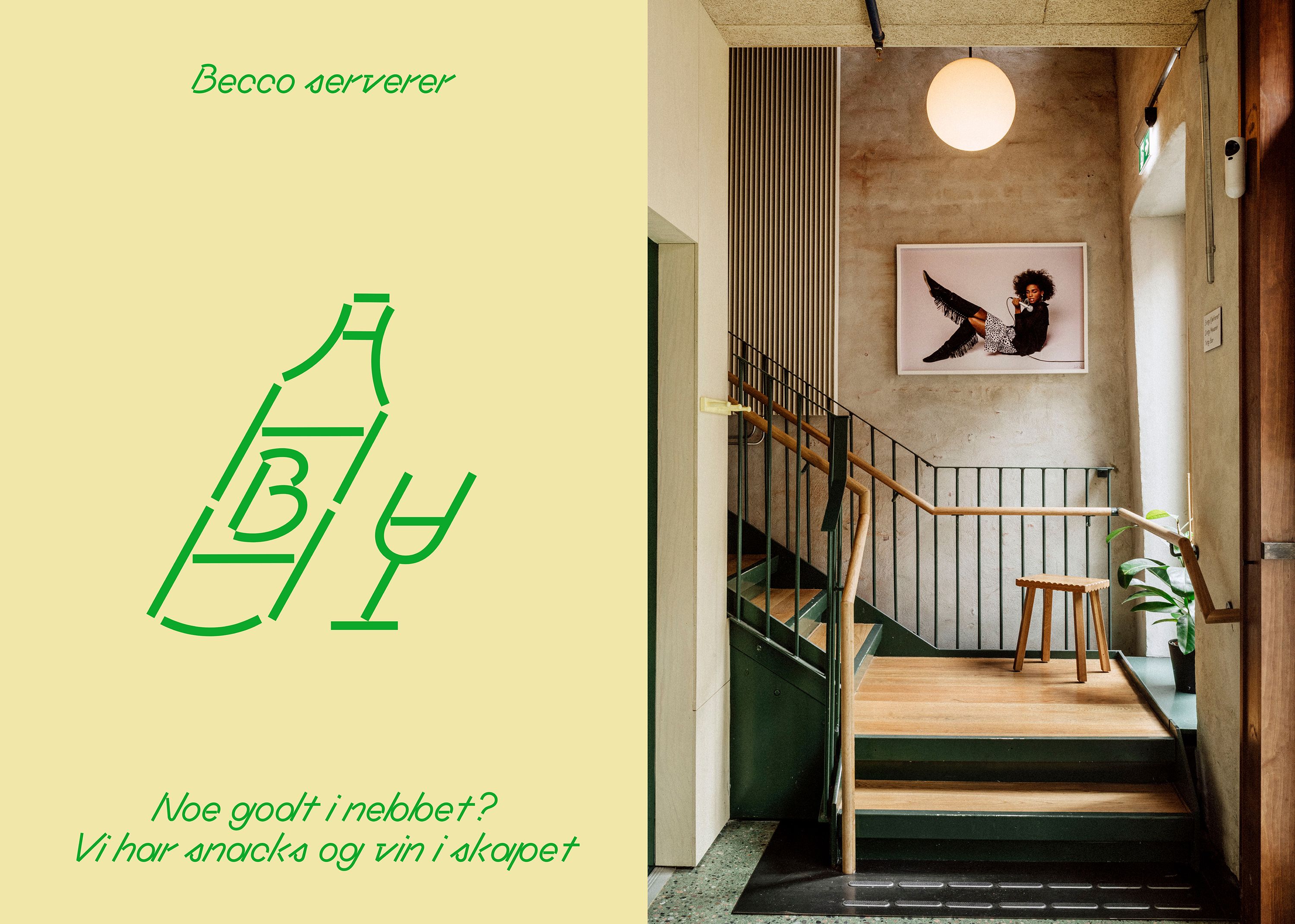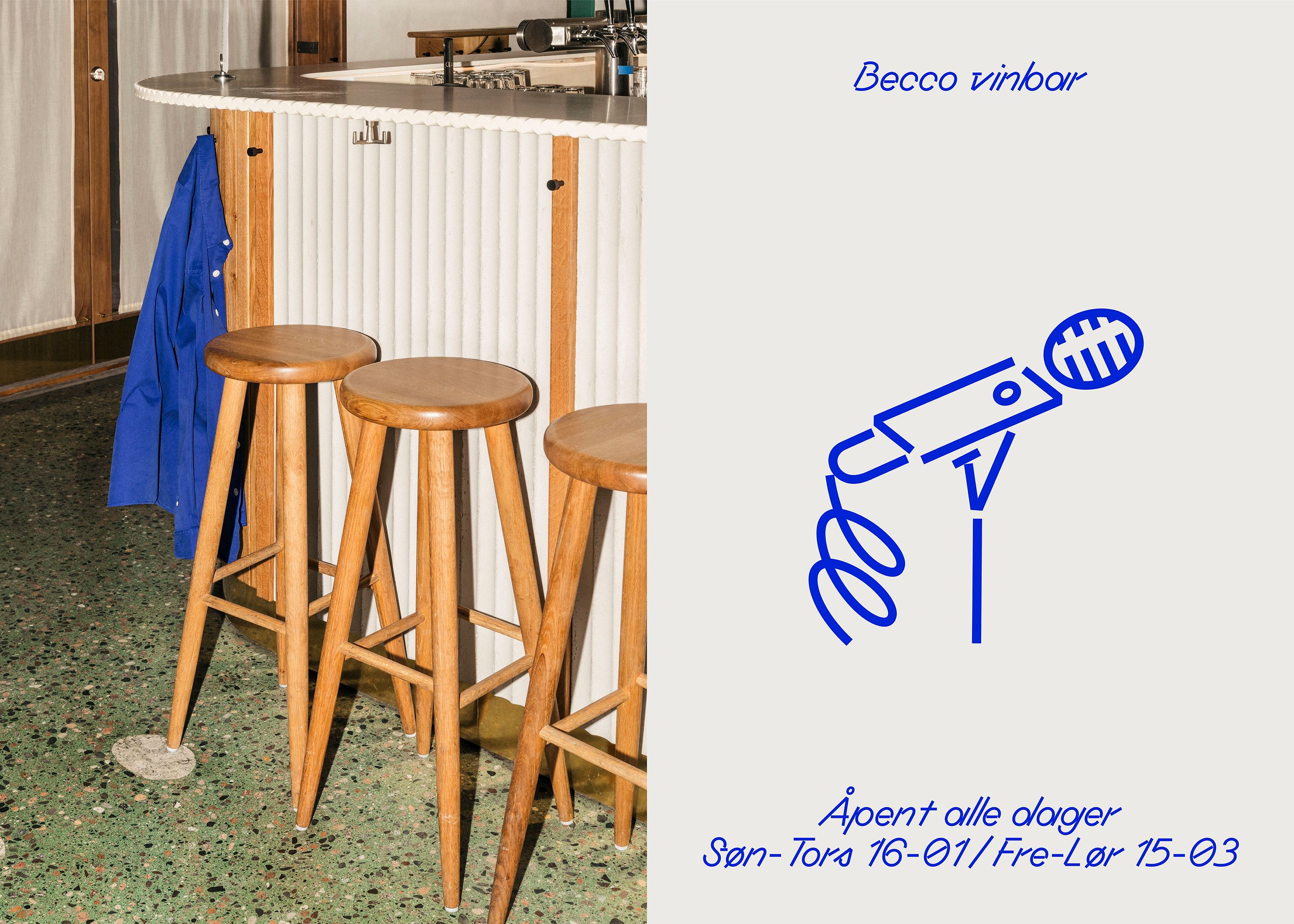 Becco is a contemporary and eclectic bar, serving natural wine with music and cultural program in a backyard at Tullinløkka in Oslo. It’s a project out of the ordinary, initiated by Flott Gjort, and curated down to each detail, from the natural wine selection, to custom designed furniture, colours, interiors, doorknobs and monthly live music programs by artist Are Mokkelbost, photographer and natural wine aficionado Anne Valeur, and music producer Erlend Mokkelbost.