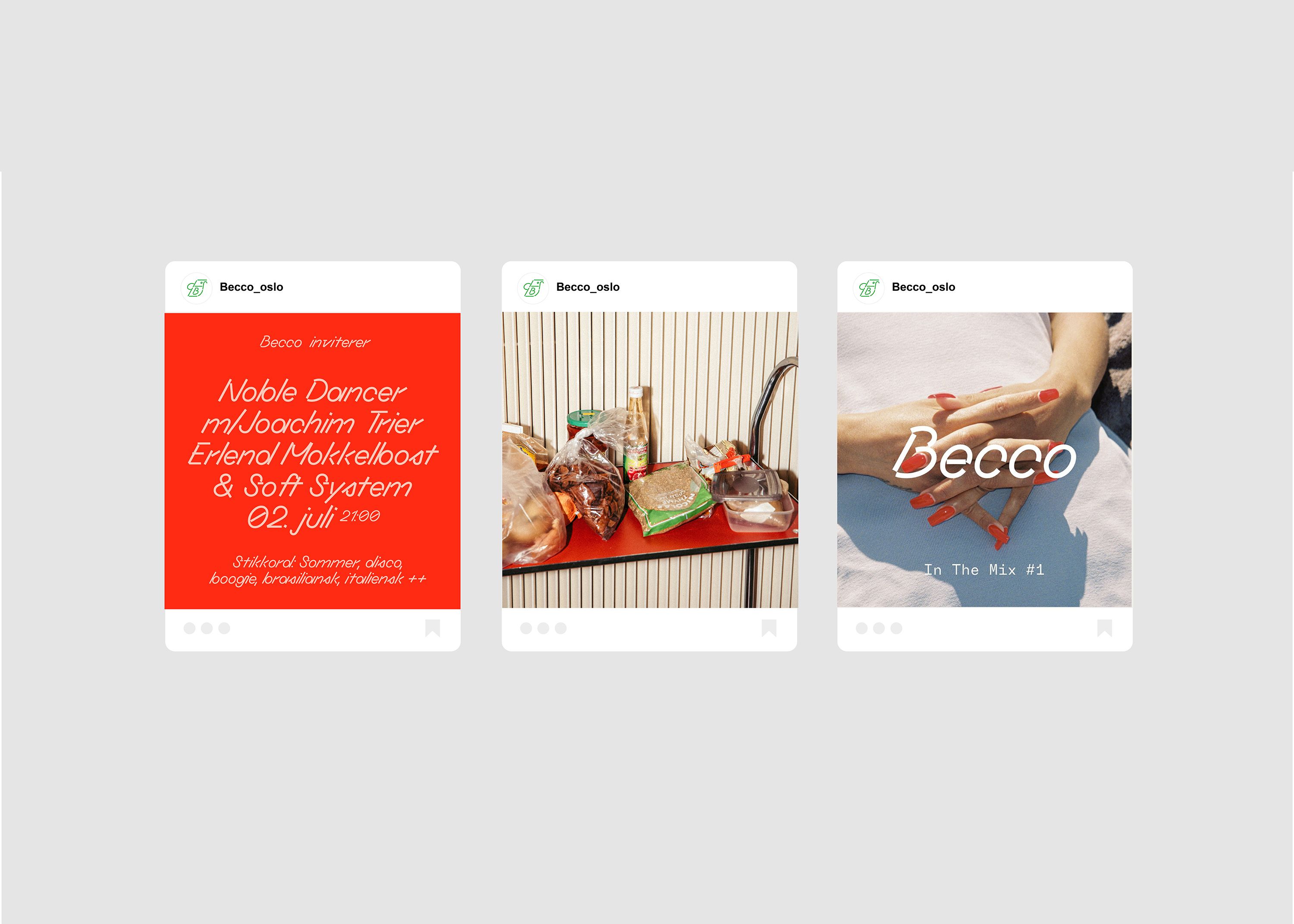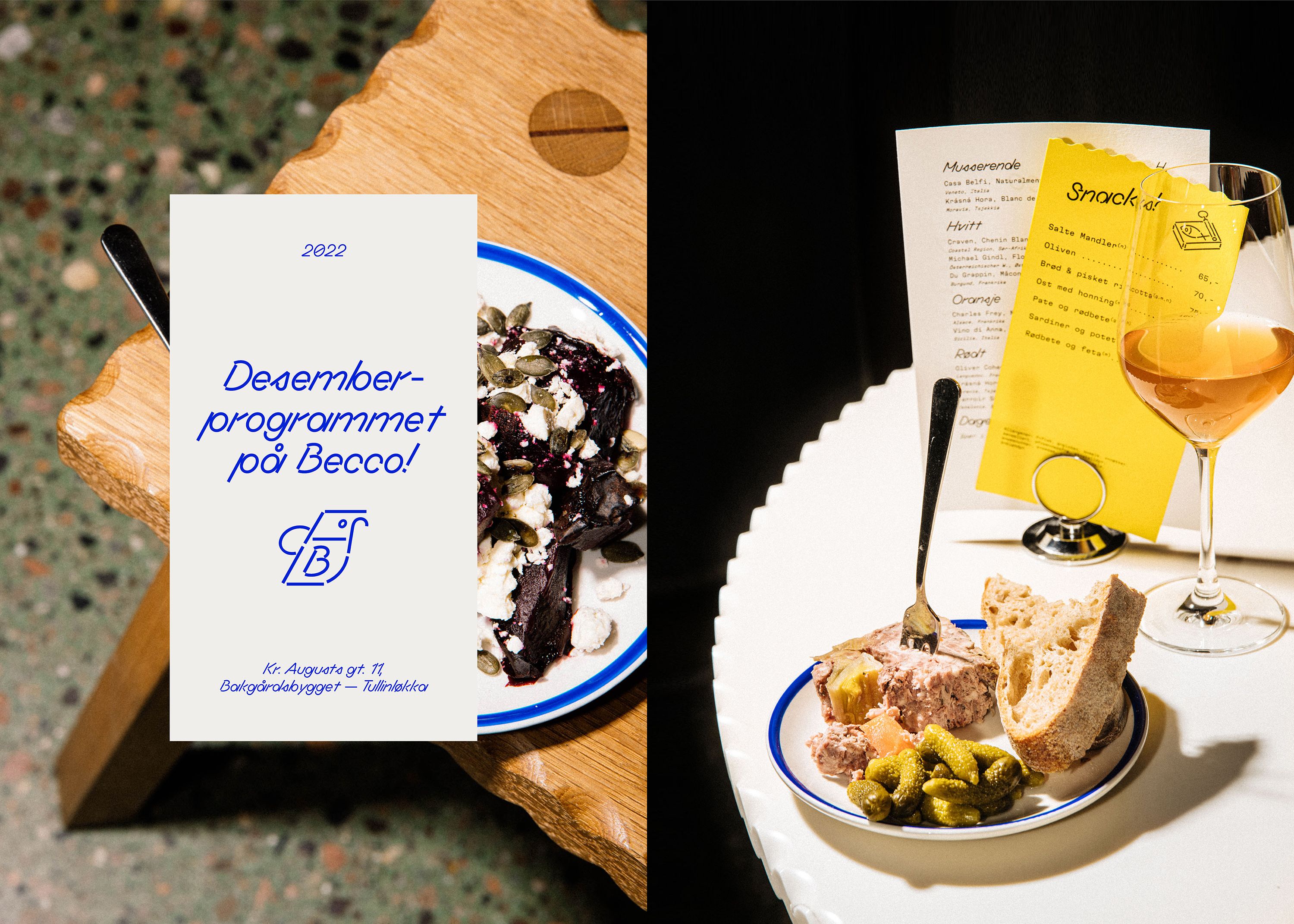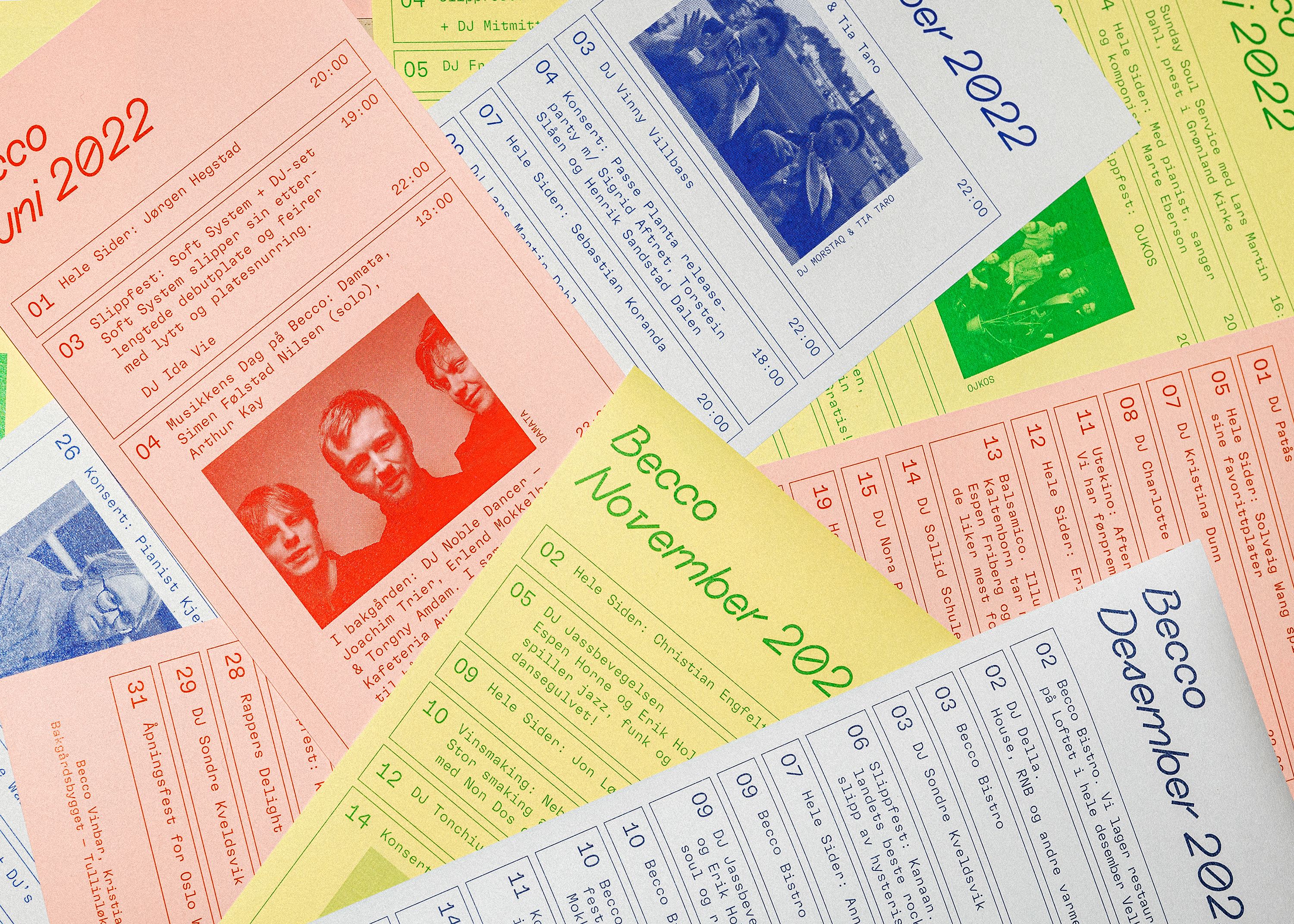 We also created micro-identities for different activities at Becco that needed their own look to be recognisable but feel part of the identity. Hele Sider is a weekly event with a black and white layout inspired by LP labels with a hole in the middle. For this and the Playlist cover we use photos while the monthly programs and Supper Club menus, use images in halftone to ensure a common image quality and look for everyone performing at Becco.