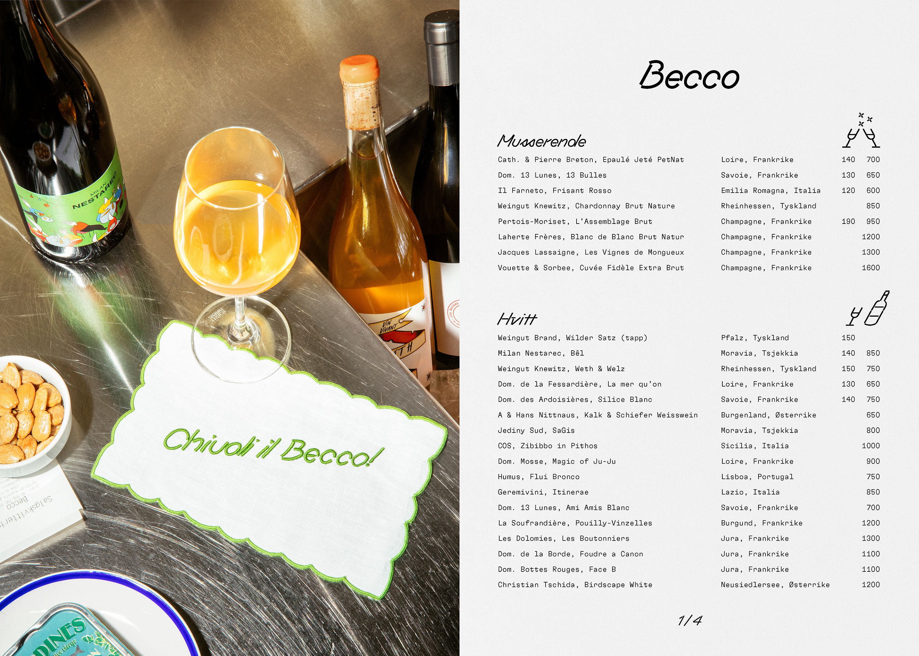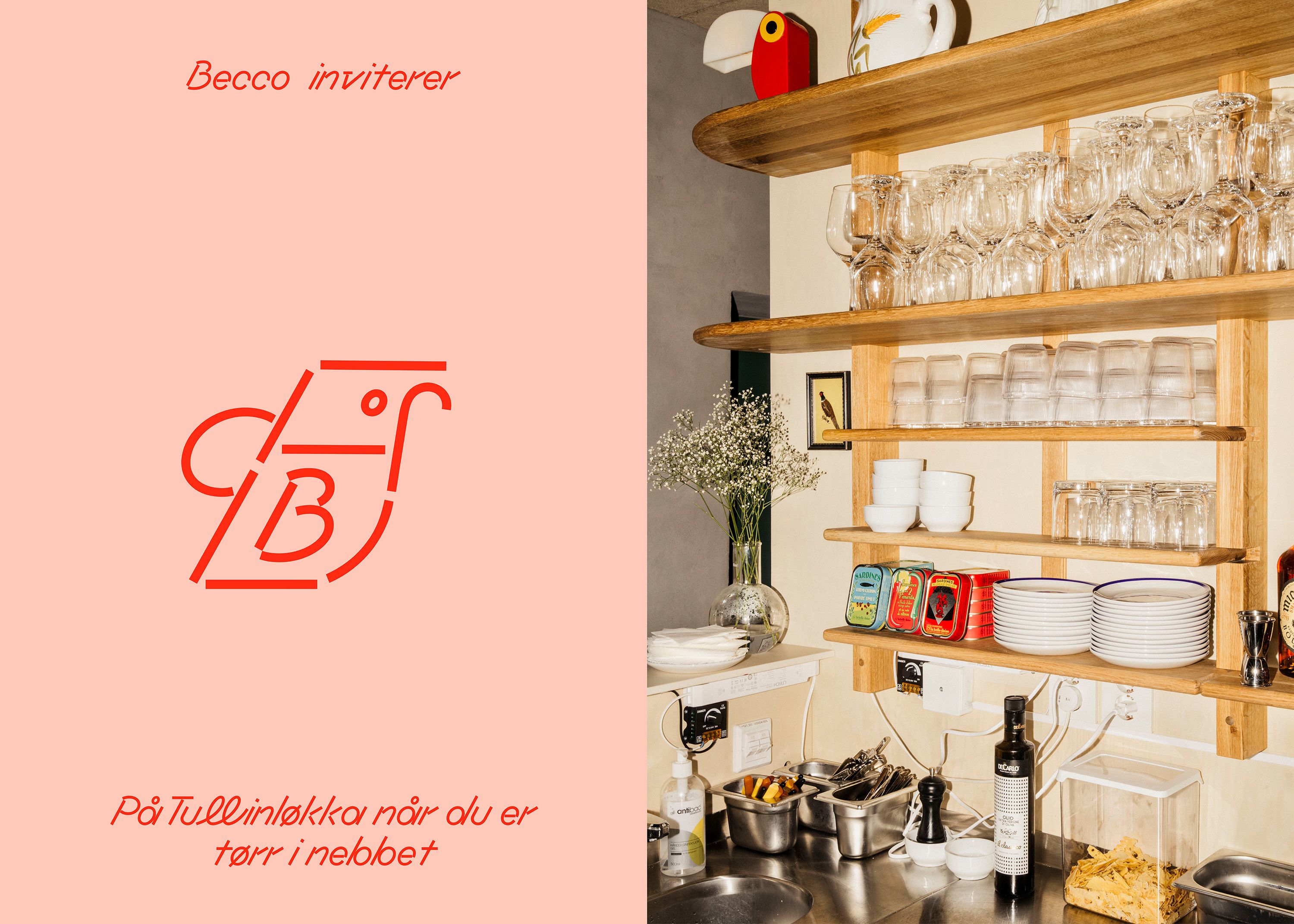 Becco, which in Italian means beak, creates associations with pouring and drinking. Several bird-shaped Jugs were collected from the beginning to decorate the bar, so a bird-shaped jug mark became the thing to do. In the spirit of re-purposing, we also developed a series of illustrations to be used across different applications, created only with elements and letters from the typography.