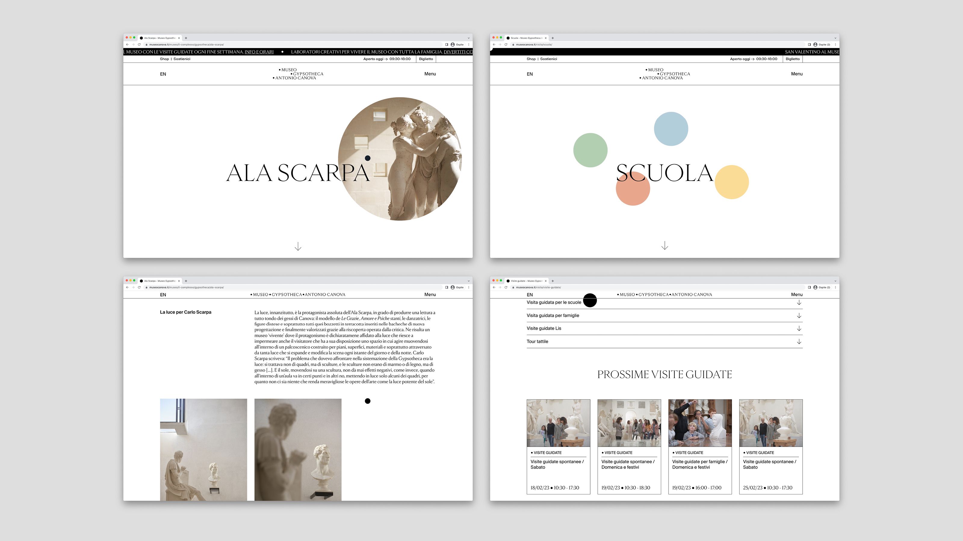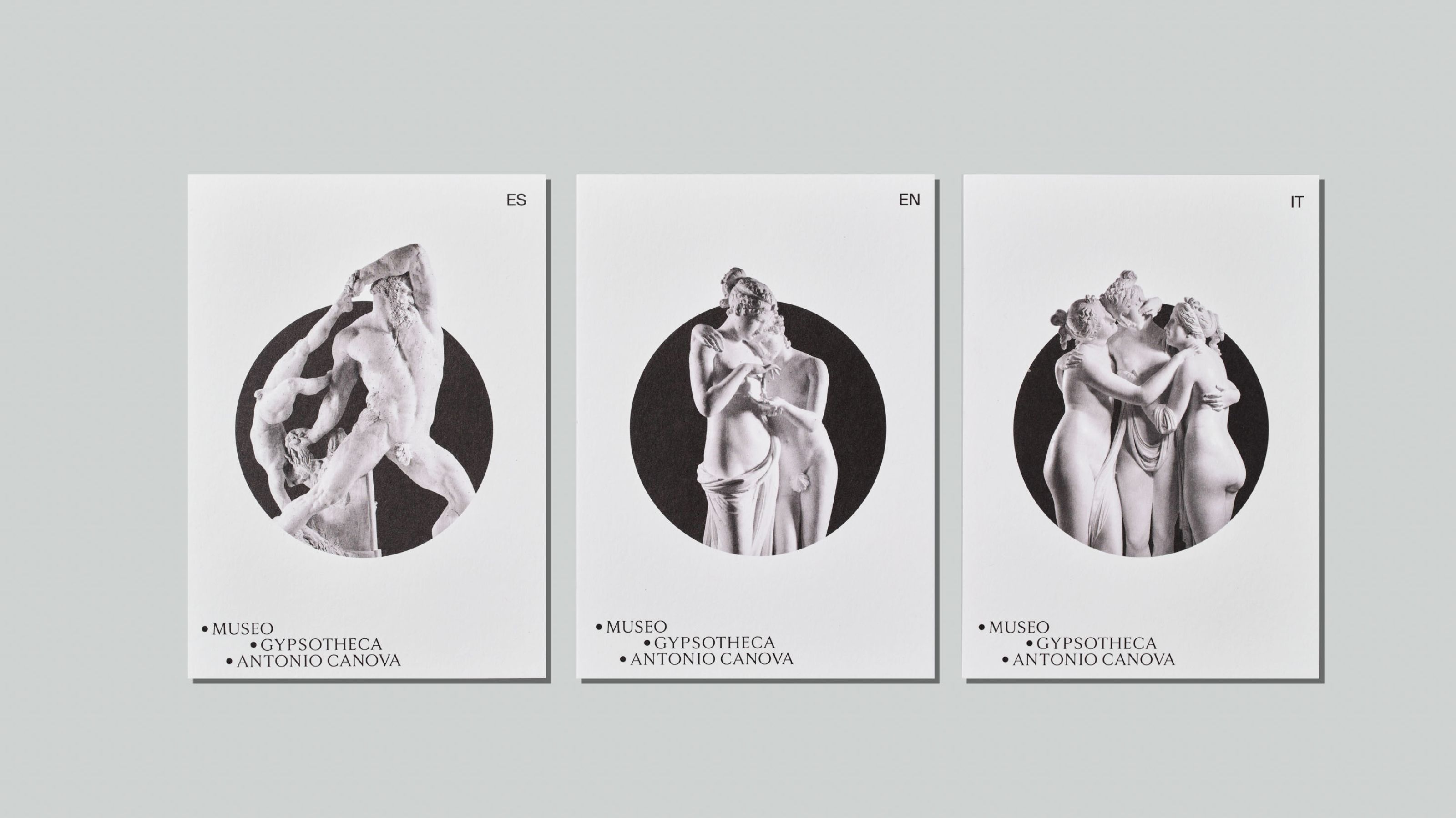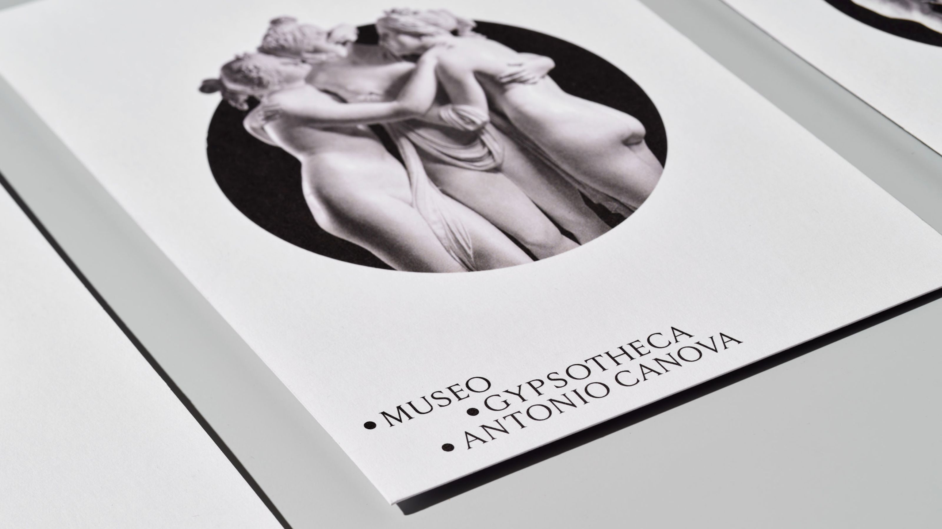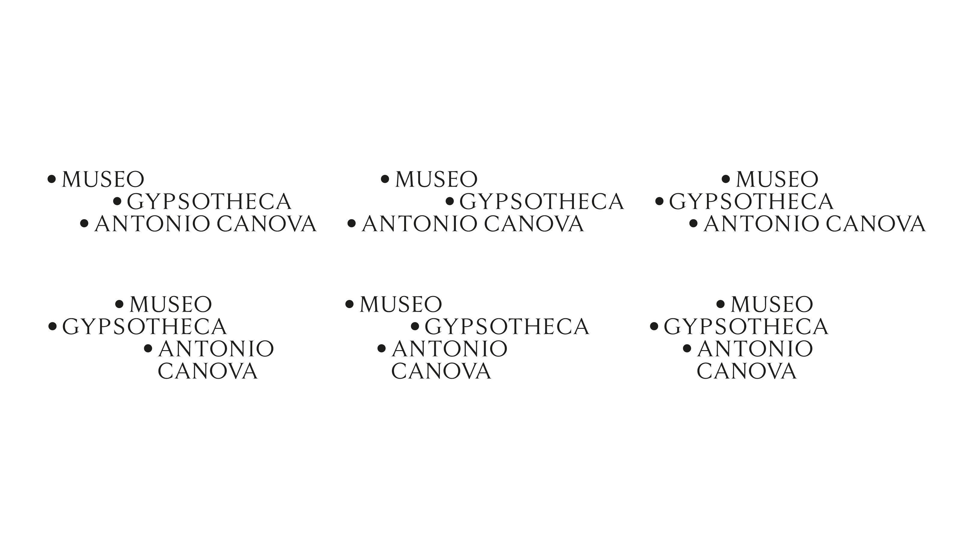 The Museum Gypsotheca Antonio Canova in Possagno - Italy - preserves the historical and artistic heritage of Antonio Canova, the greatest sculptor of Neoclassical period. On the occasion of the bicentenary of the artist's death in 2022, the new visual identity of the museum was presented in all the on and off-line communication media. The name of the museum is due to the fact that it preserves the gypsum models, the true original works by the artist. As a matter of fact, the sculptor used these gypsum models mapped with the "repere" (black dots) to carve the marble works, currently exhibited in the most important museums in the world. As the black pins of the repere are set in the white of the gypsum, so the new logo uses these circular shapes placed on a white background creating arrangements that underlie the geometric harmony inherent in the artist's work.