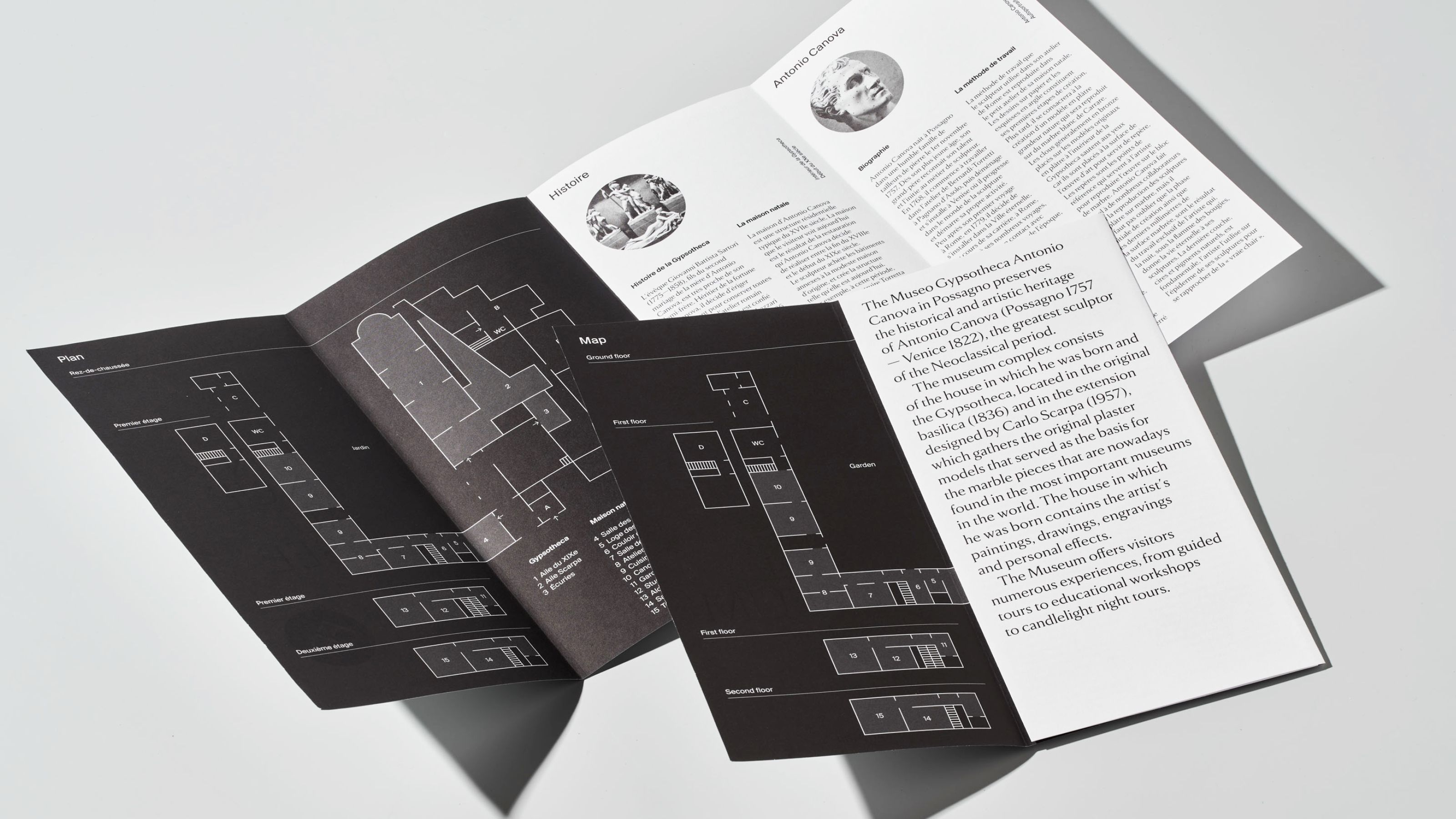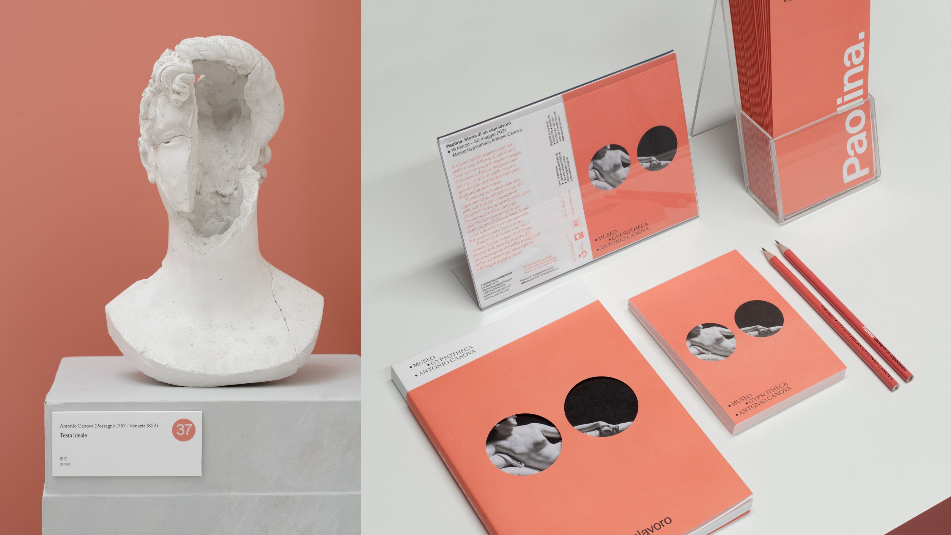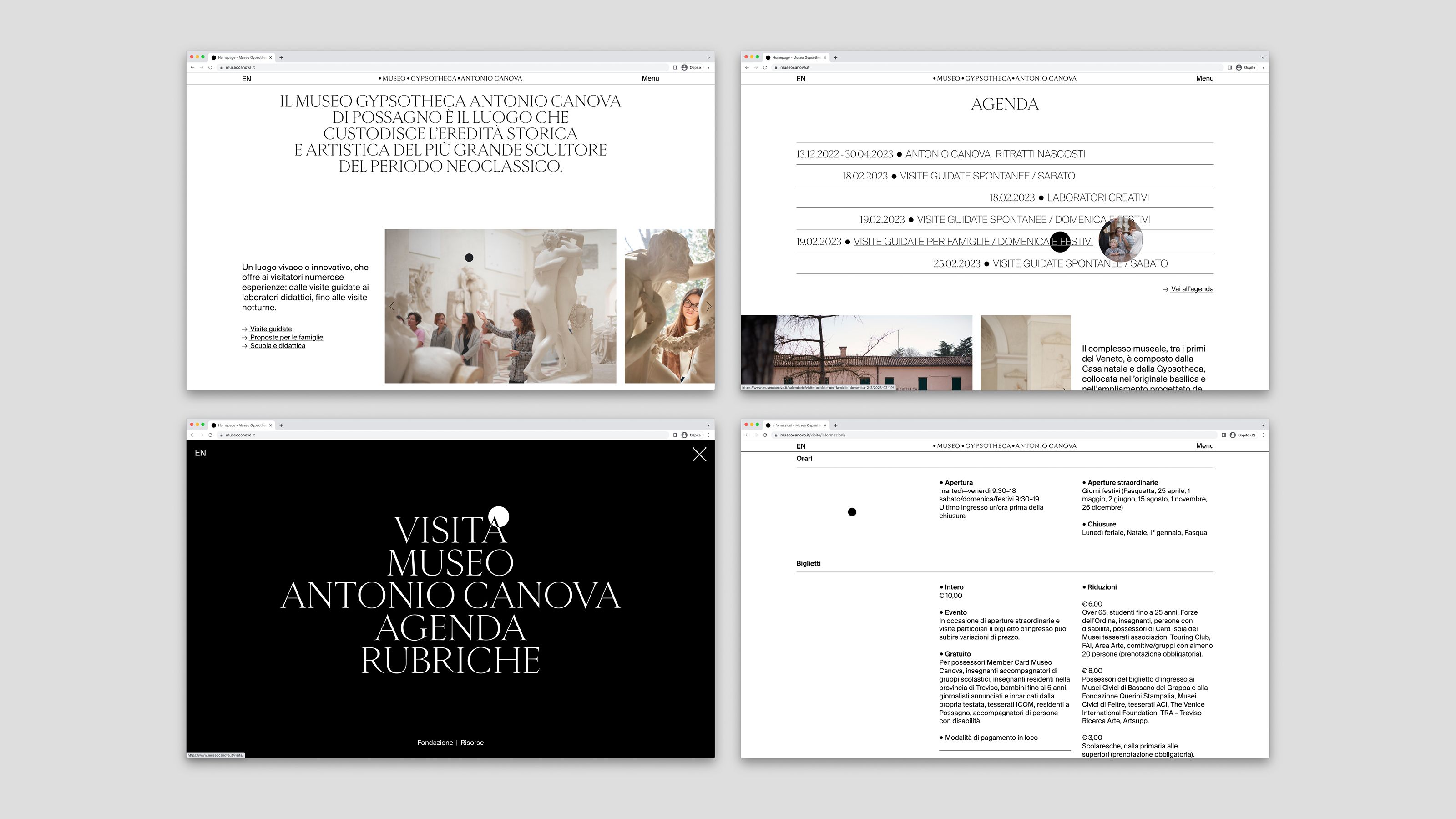The Museum Gypsotheca Antonio Canova in Possagno - Italy - preserves the historical and artistic heritage of Antonio Canova, the greatest sculptor of Neoclassical period. On the occasion of the bicentenary of the artist's death in 2022, the new visual identity of the museum was presented in all the on and off-line communication media. The name of the museum is due to the fact that it preserves the gypsum models, the true original works by the artist. As a matter of fact, the sculptor used these gypsum models mapped with the "repere" (black dots) to carve the marble works, currently exhibited in the most important museums in the world. As the black pins of the repere are set in the white of the gypsum, so the new logo uses these circular shapes placed on a white background creating arrangements that underlie the geometric harmony inherent in the artist's work.