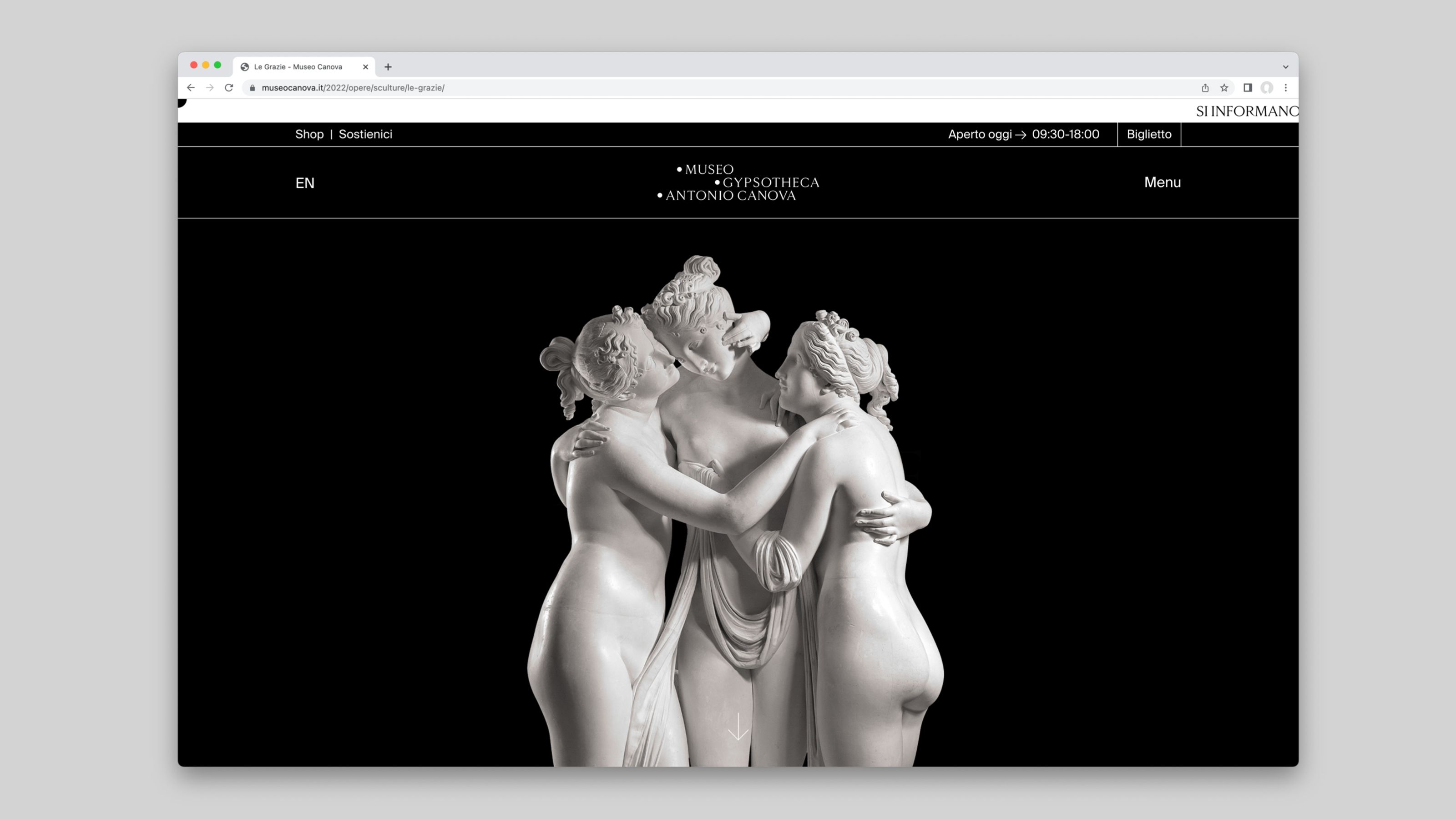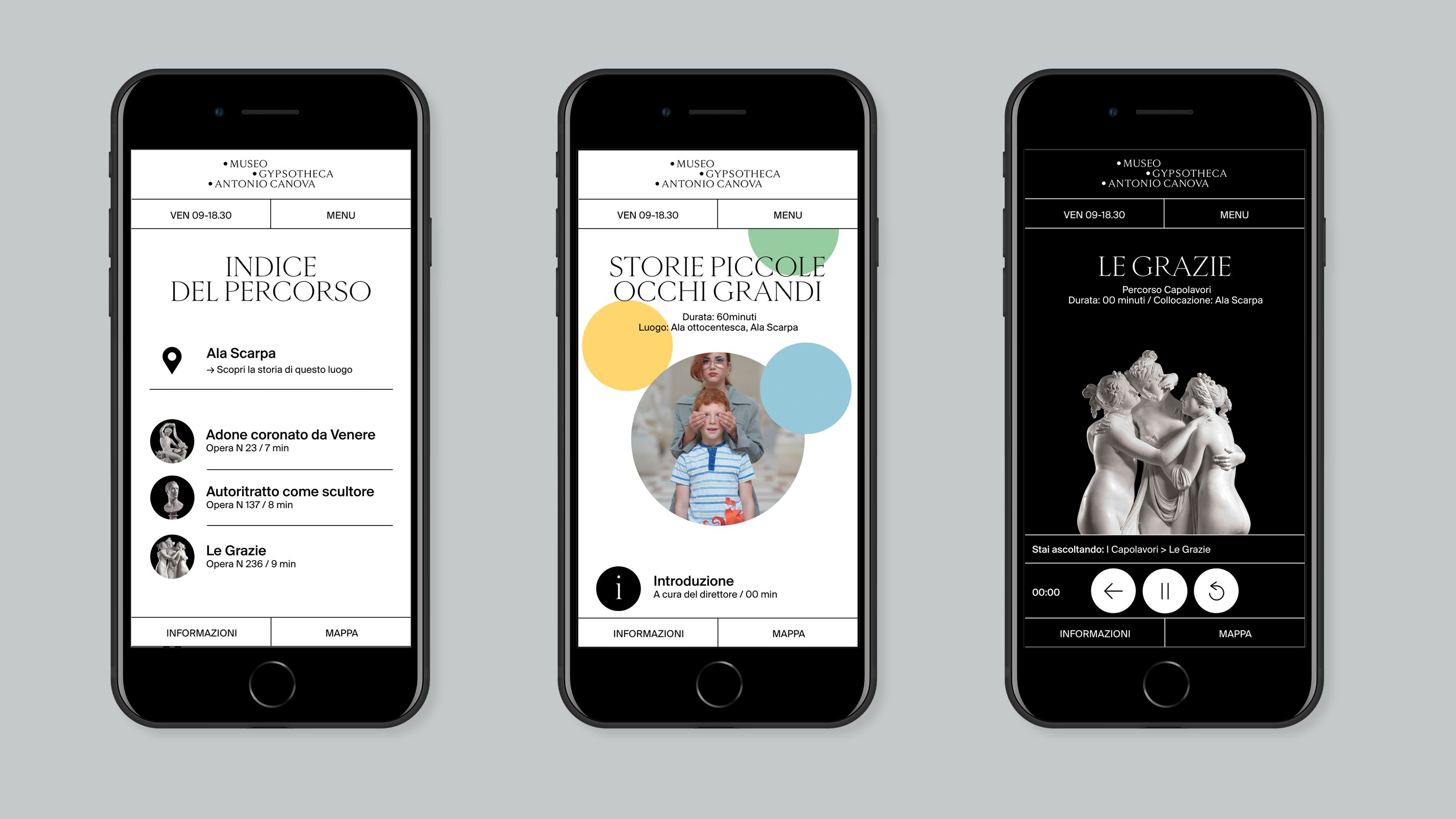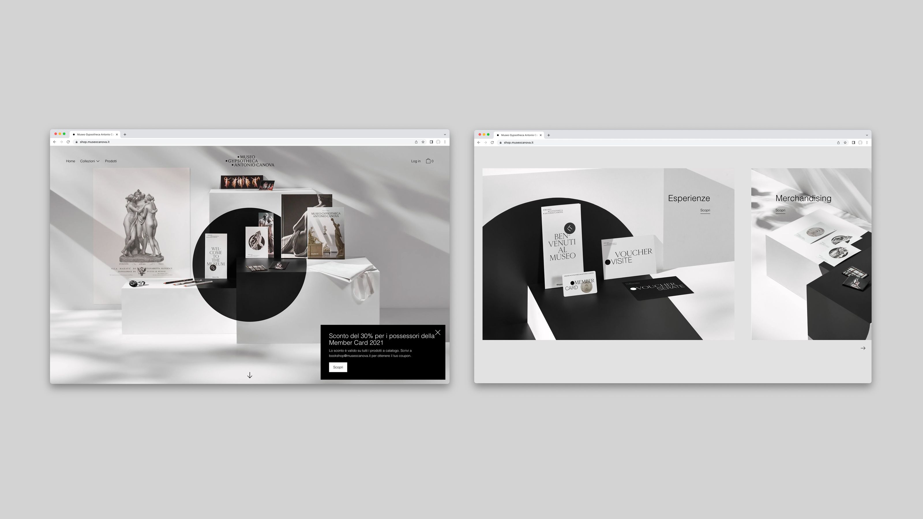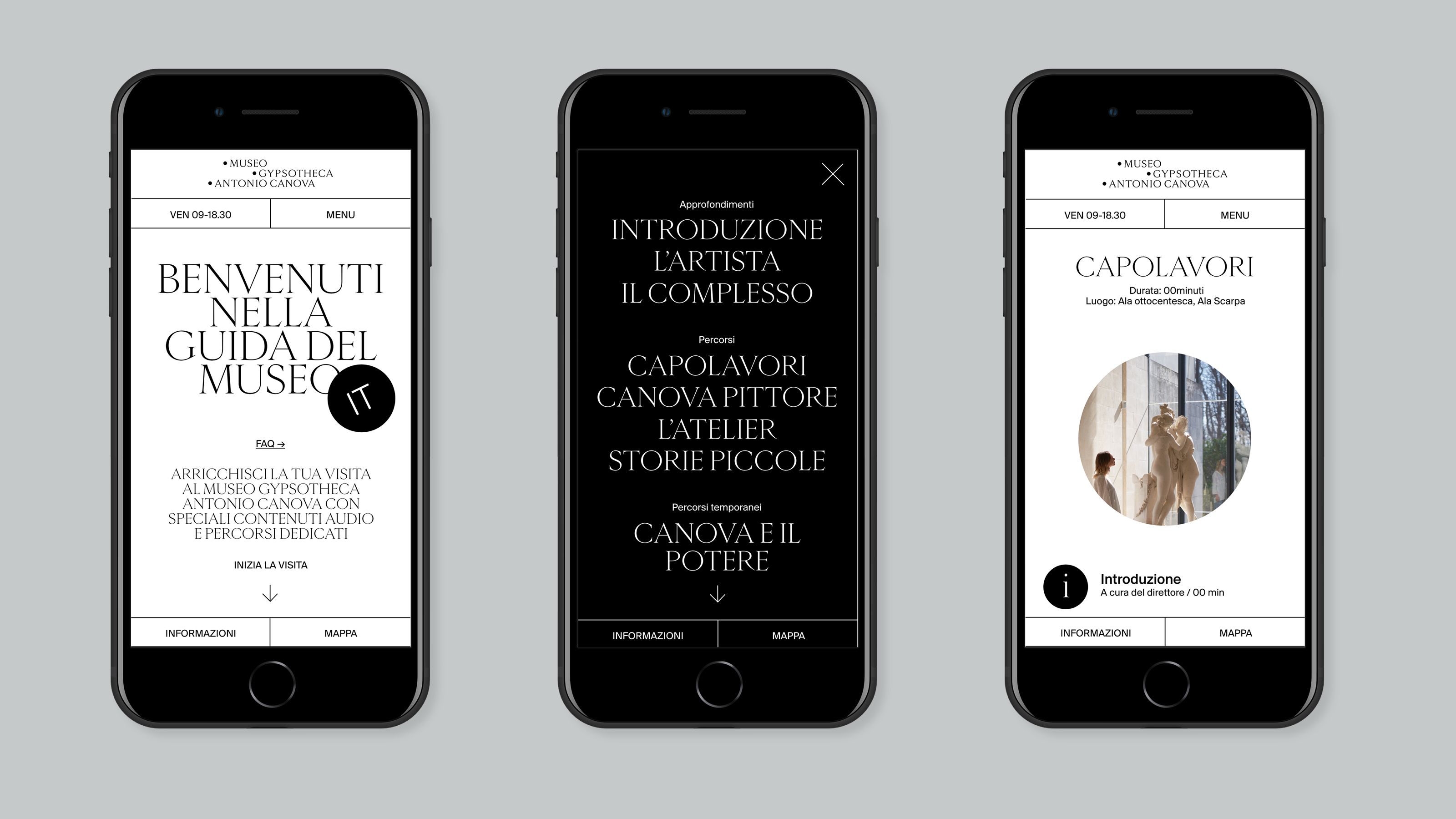 The Museum Gypsotheca Antonio Canova in Possagno - Italy - preserves the historical and artistic heritage of Antonio Canova, the greatest sculptor of Neoclassical period. On the occasion of the bicentenary of the artist's death in 2022, the new visual identity of the museum was presented in all the on and off-line communication media. The name of the museum is due to the fact that it preserves the gypsum models, the true original works by the artist. As a matter of fact, the sculptor used these gypsum models mapped with the "repere" (black dots) to carve the marble works, currently exhibited in the most important museums in the world. As the black pins of the repere are set in the white of the gypsum, so the new logo uses these circular shapes placed on a white background creating arrangements that underlie the geometric harmony inherent in the artist's work.