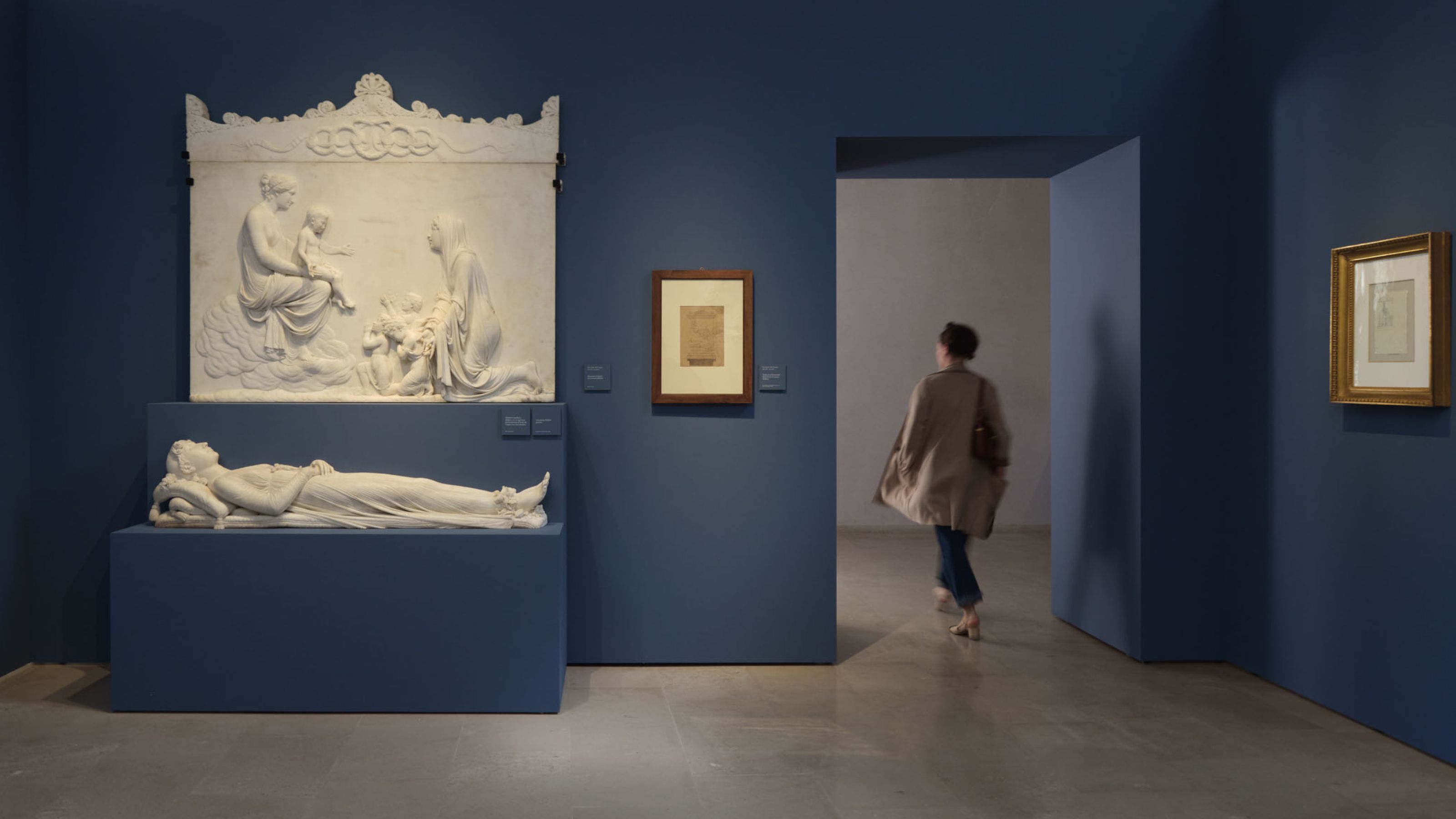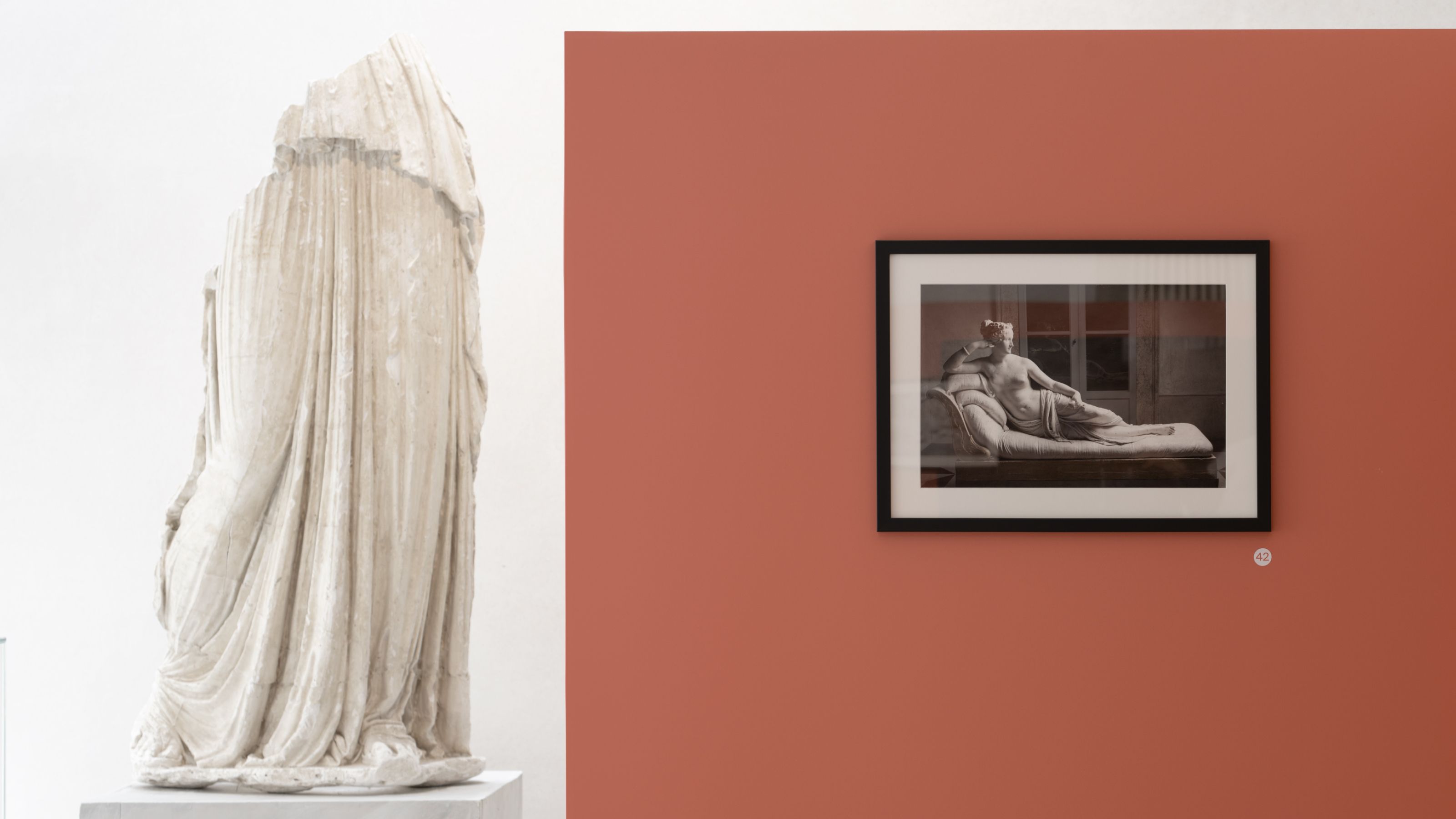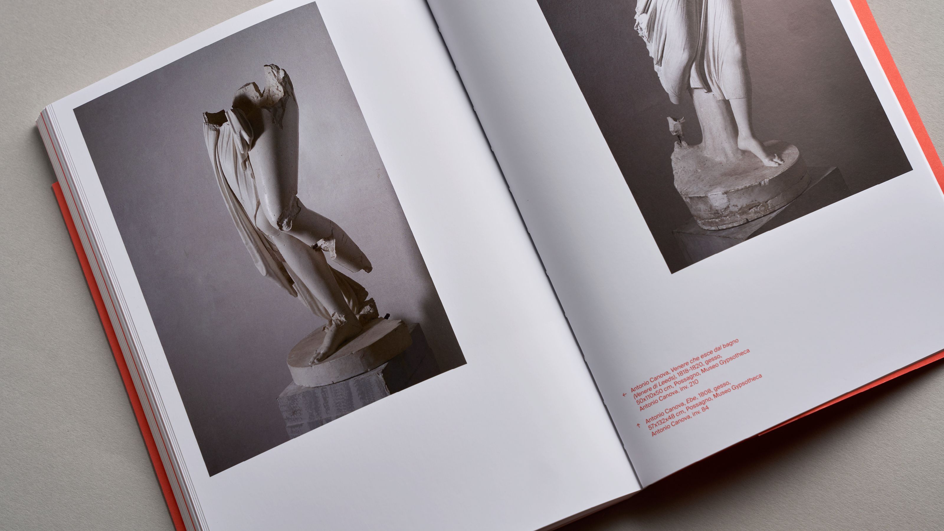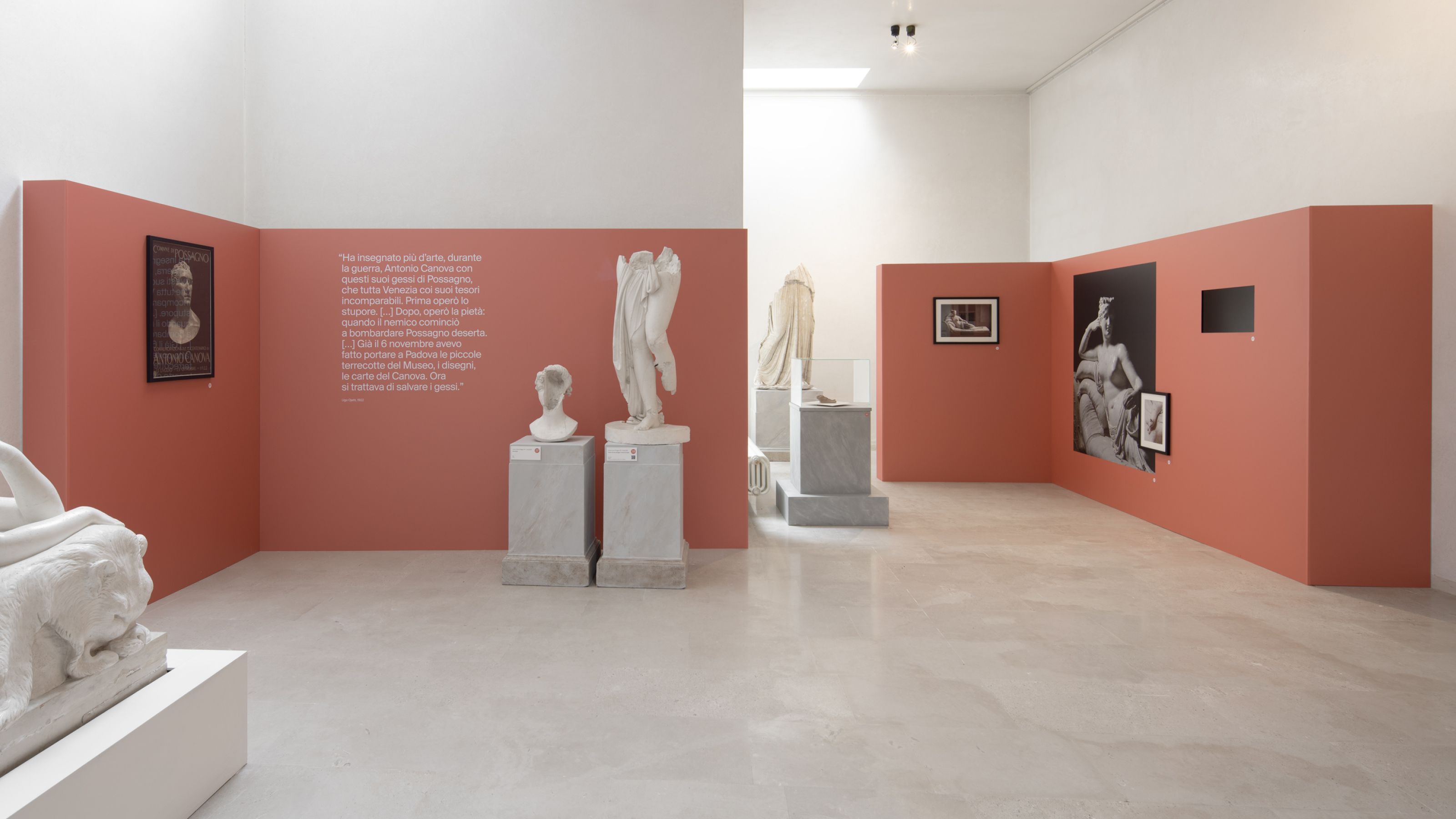 The entire communication system has also been adopted in the main temporary exhibitions created on site. From time to time, the graphic design, which basically represents the white of the gypsum and the black of the repere, is colored in order to transmit to the public the uniqueness of each single event by linking it to the symbolic meaning of each chosen colour.