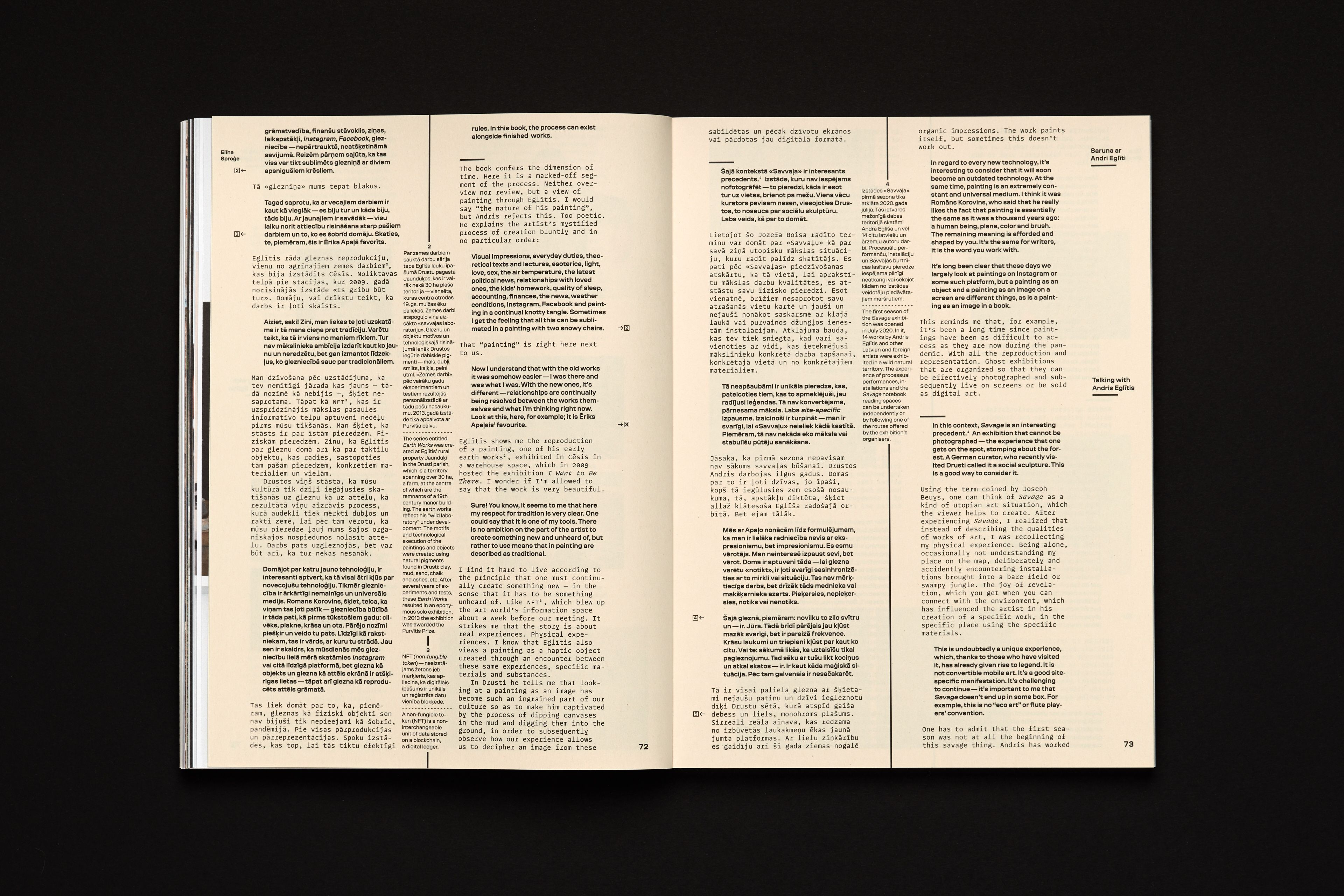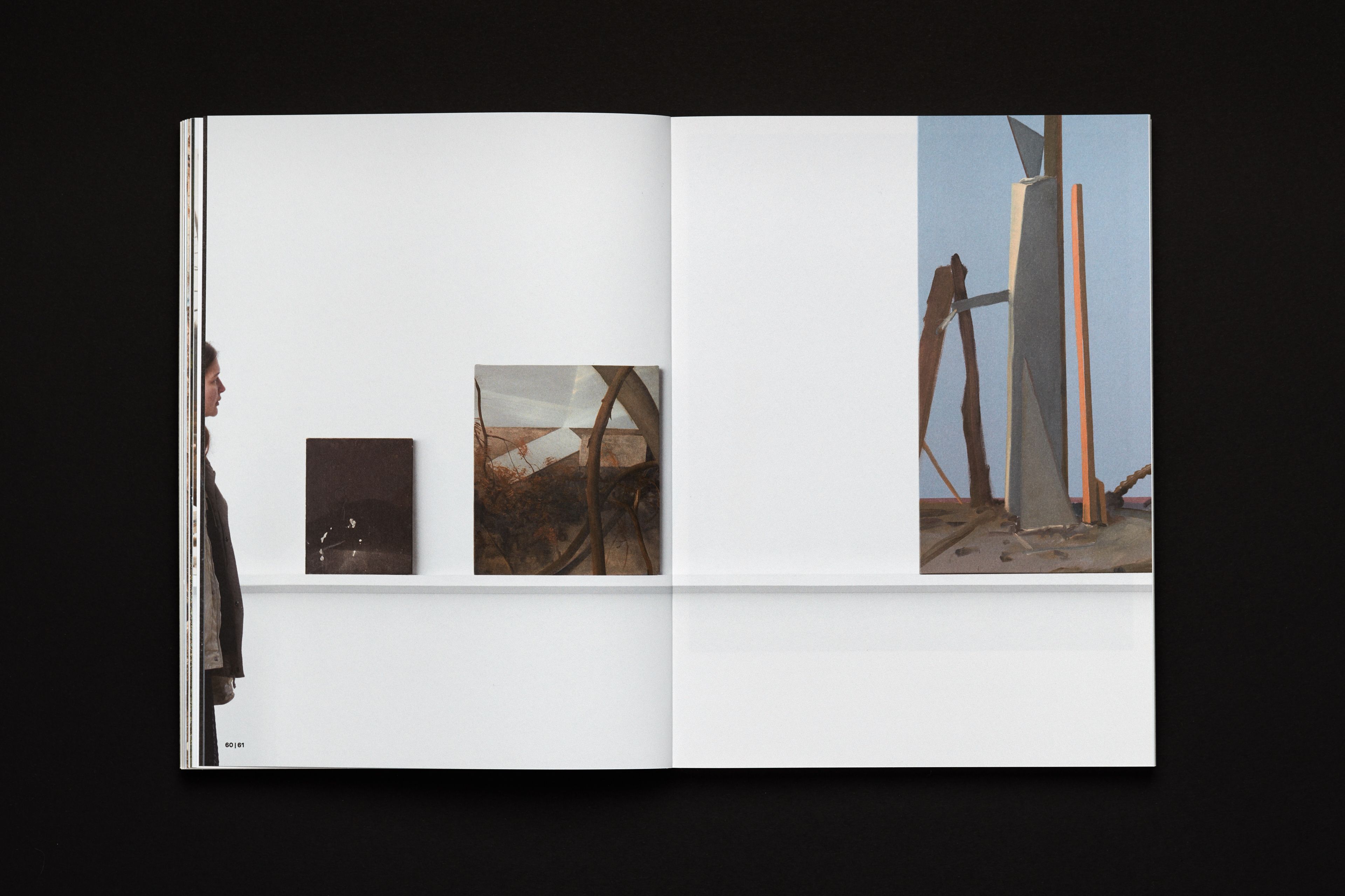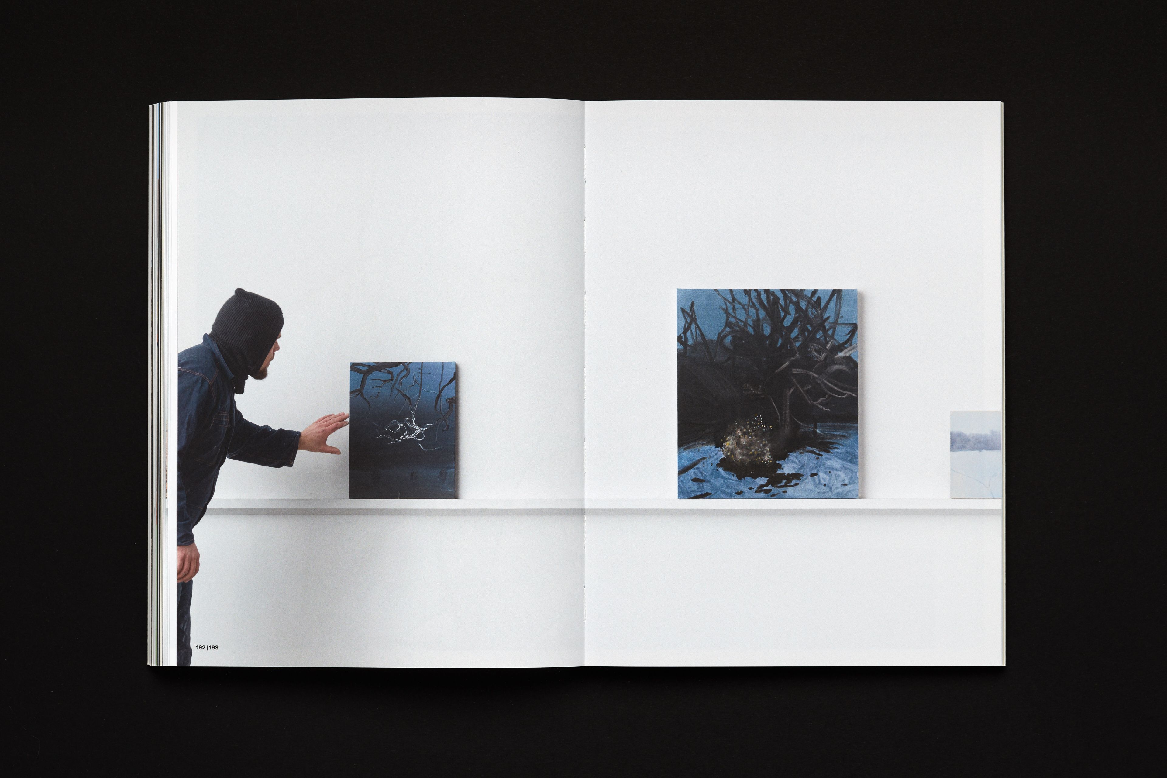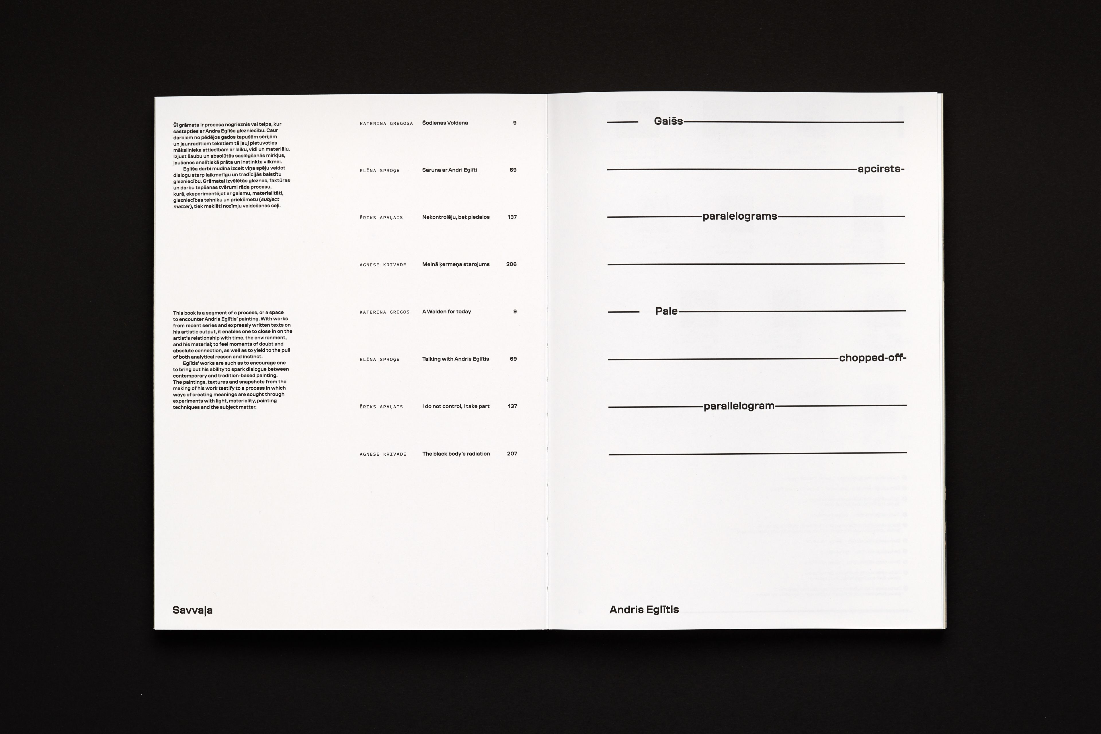Conceived and released during the pandemics (thus museums were closed), this catalogue of paintings by Andris Eglītis represents an imaginary gallery tour, which interrupts by approaching particular works, features documentary references and the context of creation of art pieces, as well as essays. The axis along which this virtual tour is moving is an almost infinite shelf on/by which all the featured paintings were placed. The shelf and the setting helps to reveal the physicality of the works and, most importantly, the scale. Editions starts with a section presenting the anatomy of his artistic technique.