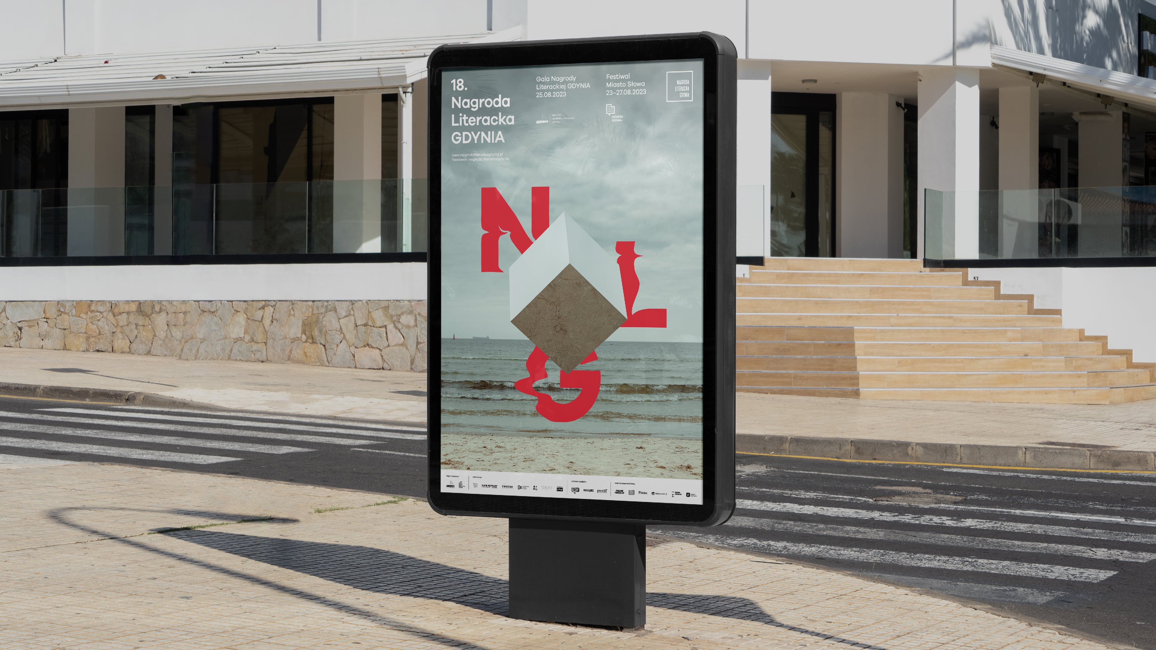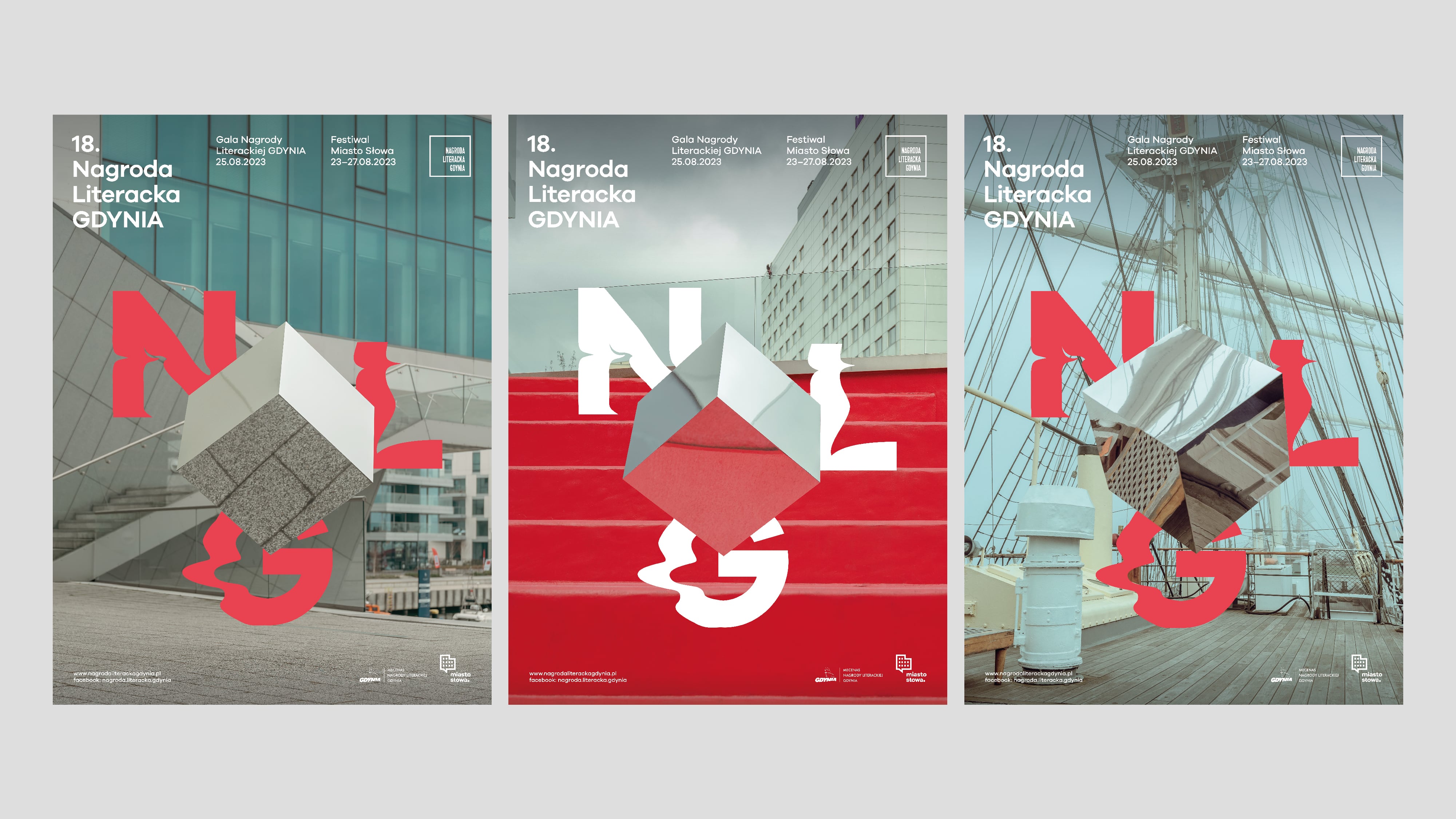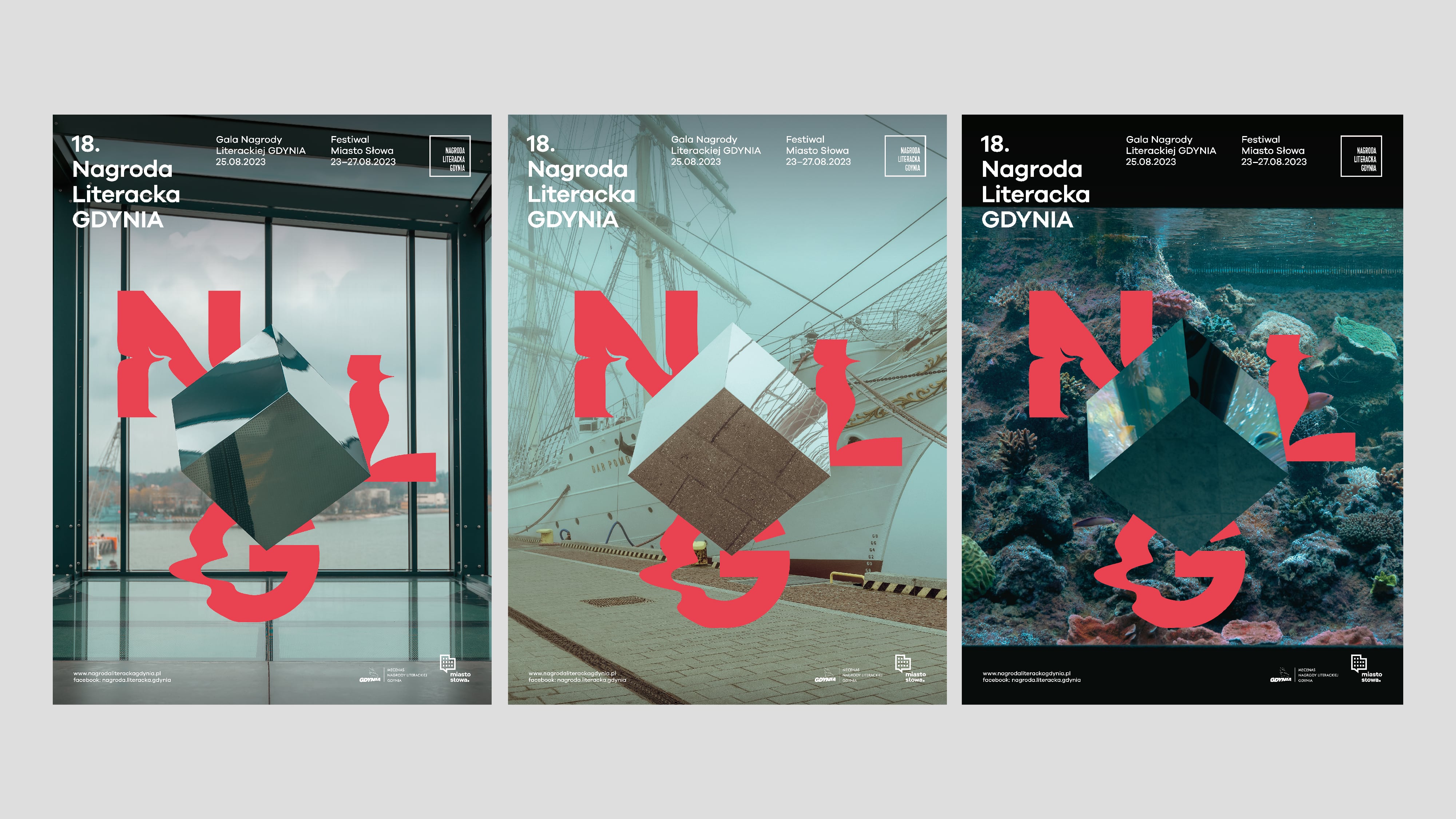 Our studio was asked again to prepare a complete image renewal of graphicidentity of the next edition for 2023, including all visual and promotional materials. This year, we decided to focus on the multidimensional nature of literature. The symbol of this idea became the cube shape, which also refers to the shape of the award/statuette itself. In addition to the graphic motif of the typographic cube, we also used photography to create and document ourinstallation in various spaces of the City of Gdynia. The concept of visual identity of this year's edition was largly based on photograpy. We created a physical object – a cube made of mirror steel material, which reflected the surroundings and created a multi-dimensional illusion of space. Next, we photographed the cube in recognizable, important spots of the city of Gdynia: City Beach, Gdynia Seaport, Sea Towers, Gdynia Film Centre, The Dar Pomorza Ship (En: Gift of Pomerania), Marina, EmigrationMuseum, Gdynia Aquarium. We wanted to expand our design with activities happening in real space, going beyond the sphere 3D modelling only.