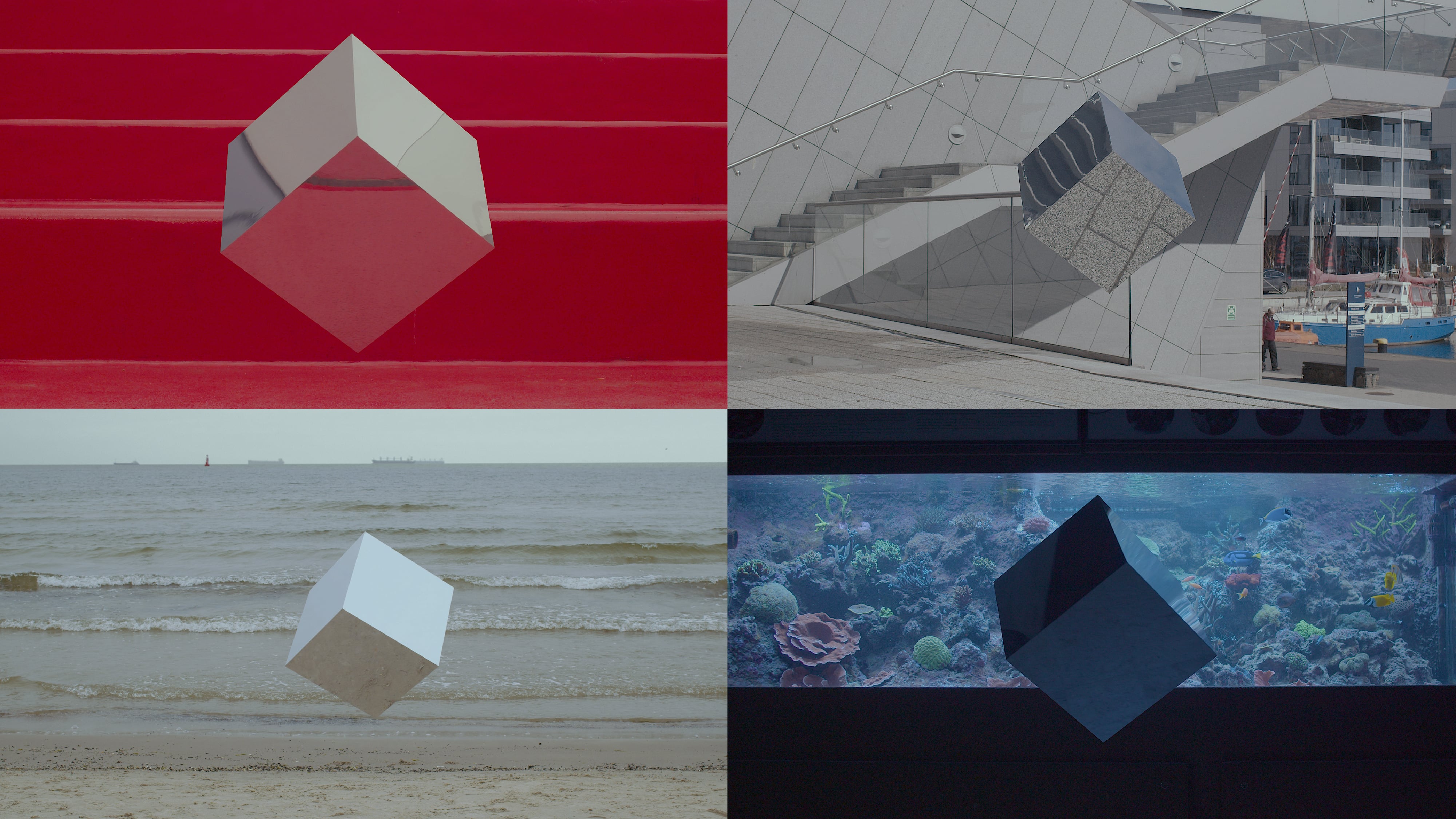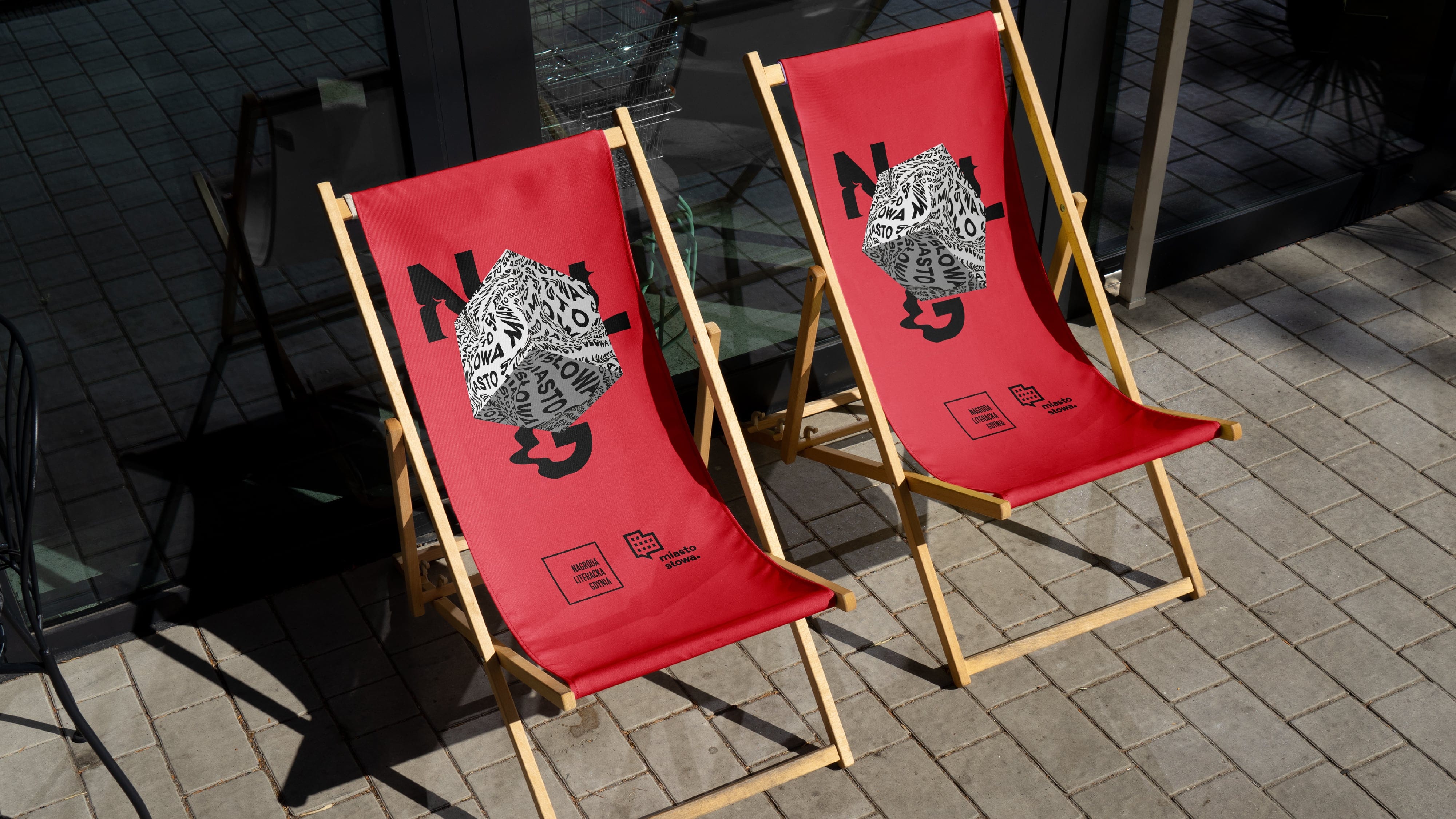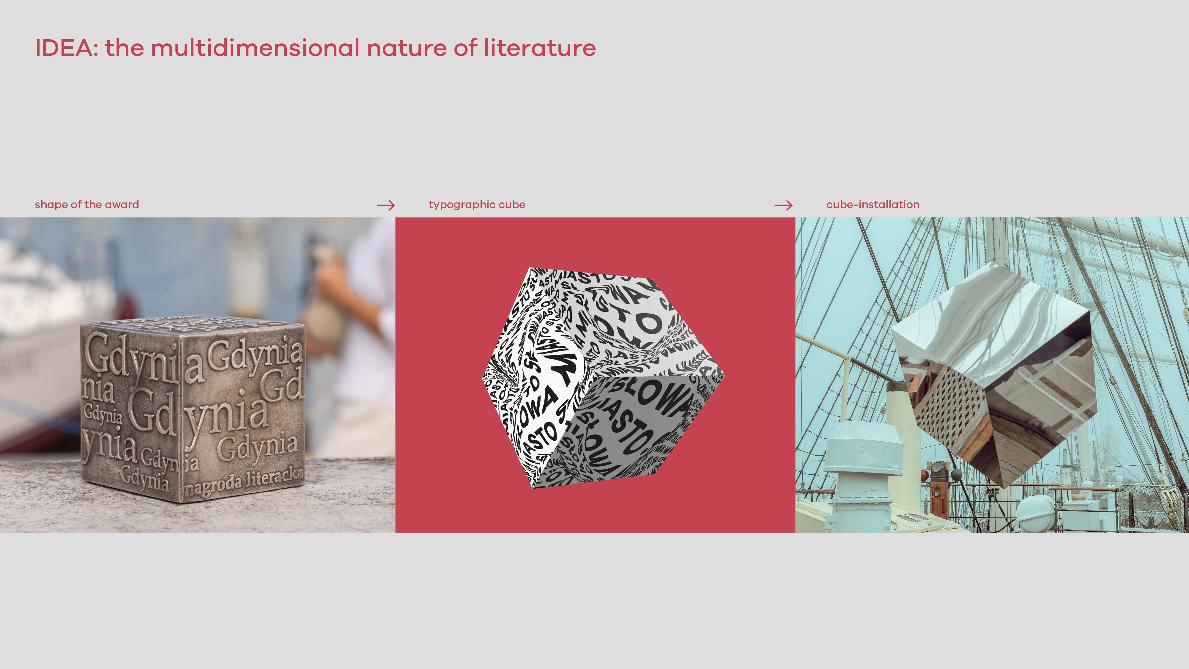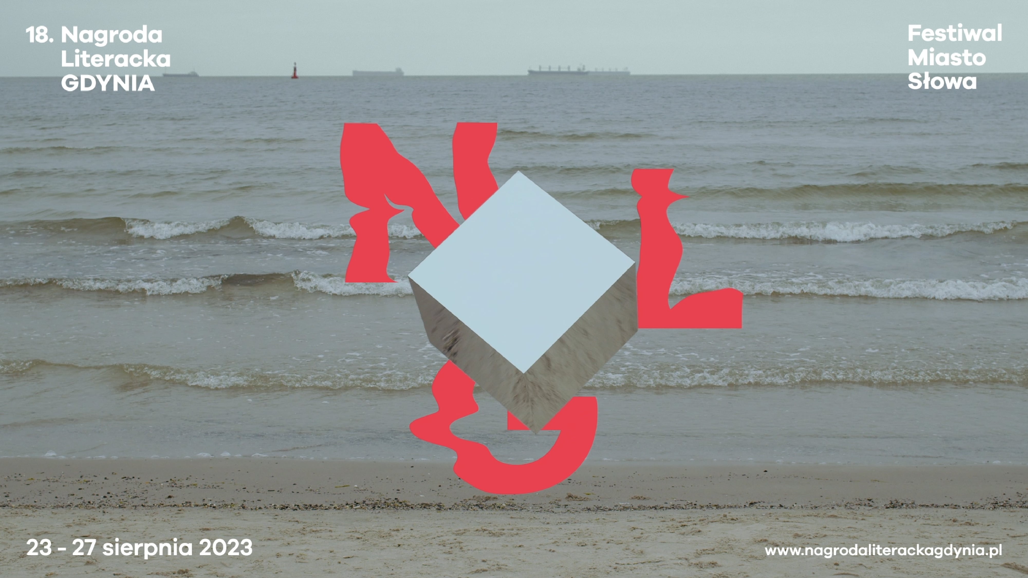 Our studio was asked again to prepare a complete image renewal of graphicidentity of the next edition for 2023, including all visual and promotional materials. This year, we decided to focus on the multidimensional nature of literature. The symbol of this idea became the cube shape, which also refers to the shape of the award/statuette itself. In addition to the graphic motif of the typographic cube, we also used photography to create and document ourinstallation in various spaces of the City of Gdynia. The concept of visual identity of this year's edition was largly based on photograpy. We created a physical object – a cube made of mirror steel material, which reflected the surroundings and created a multi-dimensional illusion of space. Next, we photographed the cube in recognizable, important spots of the city of Gdynia: City Beach, Gdynia Seaport, Sea Towers, Gdynia Film Centre, The Dar Pomorza Ship (En: Gift of Pomerania), Marina, EmigrationMuseum, Gdynia Aquarium. We wanted to expand our design with activities happening in real space, going beyond the sphere 3D modelling only.