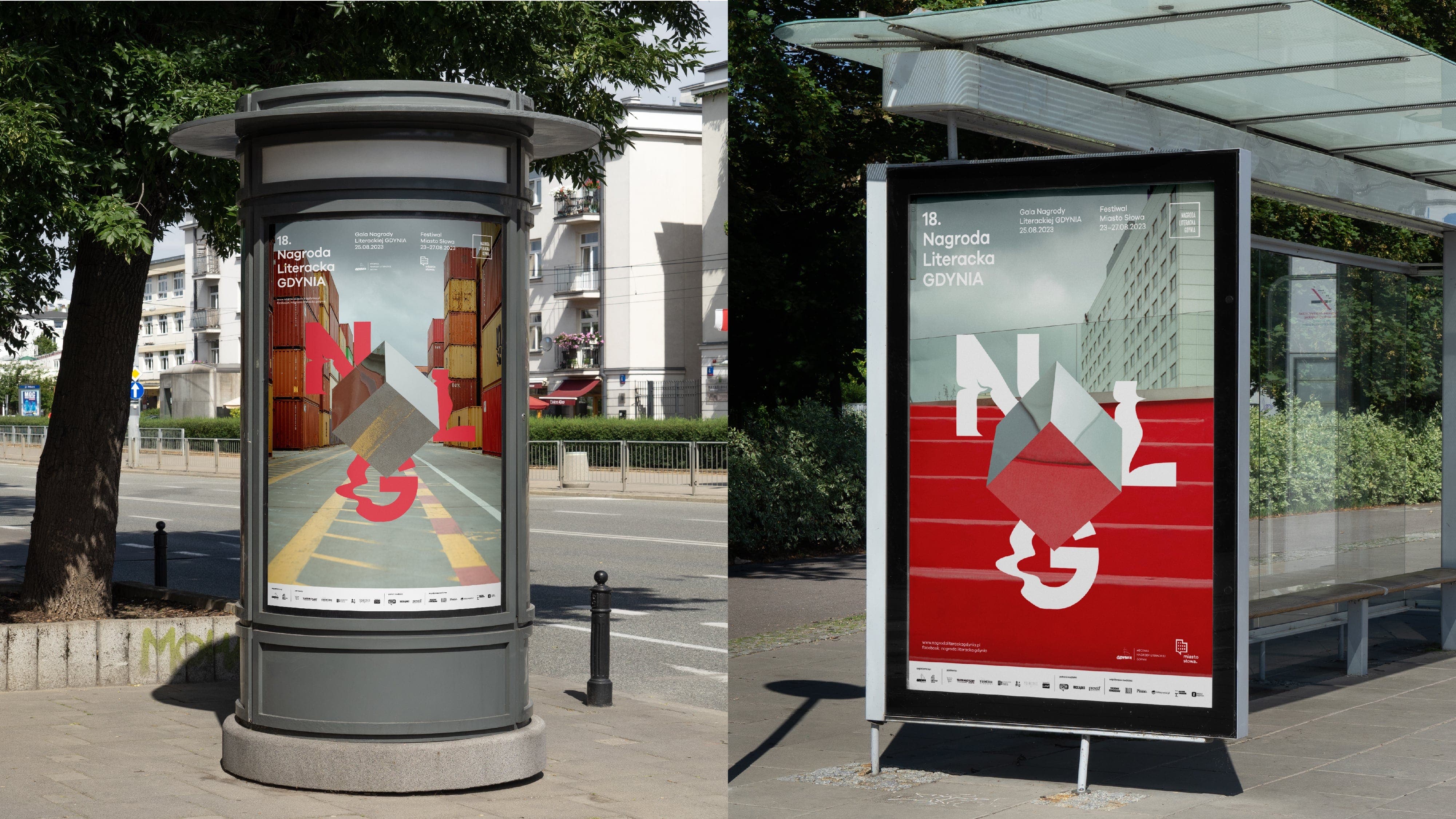 We wanted to expand our design with activities happening in real space, going beyond the sphere 3D modellingonly. We also created the NLG (En: Gdynia Literary Prize) promotional spot, showing the cube in different city locations. The visualidentity of the festival was also a significant visual element of the awards ceremony and author meetings.