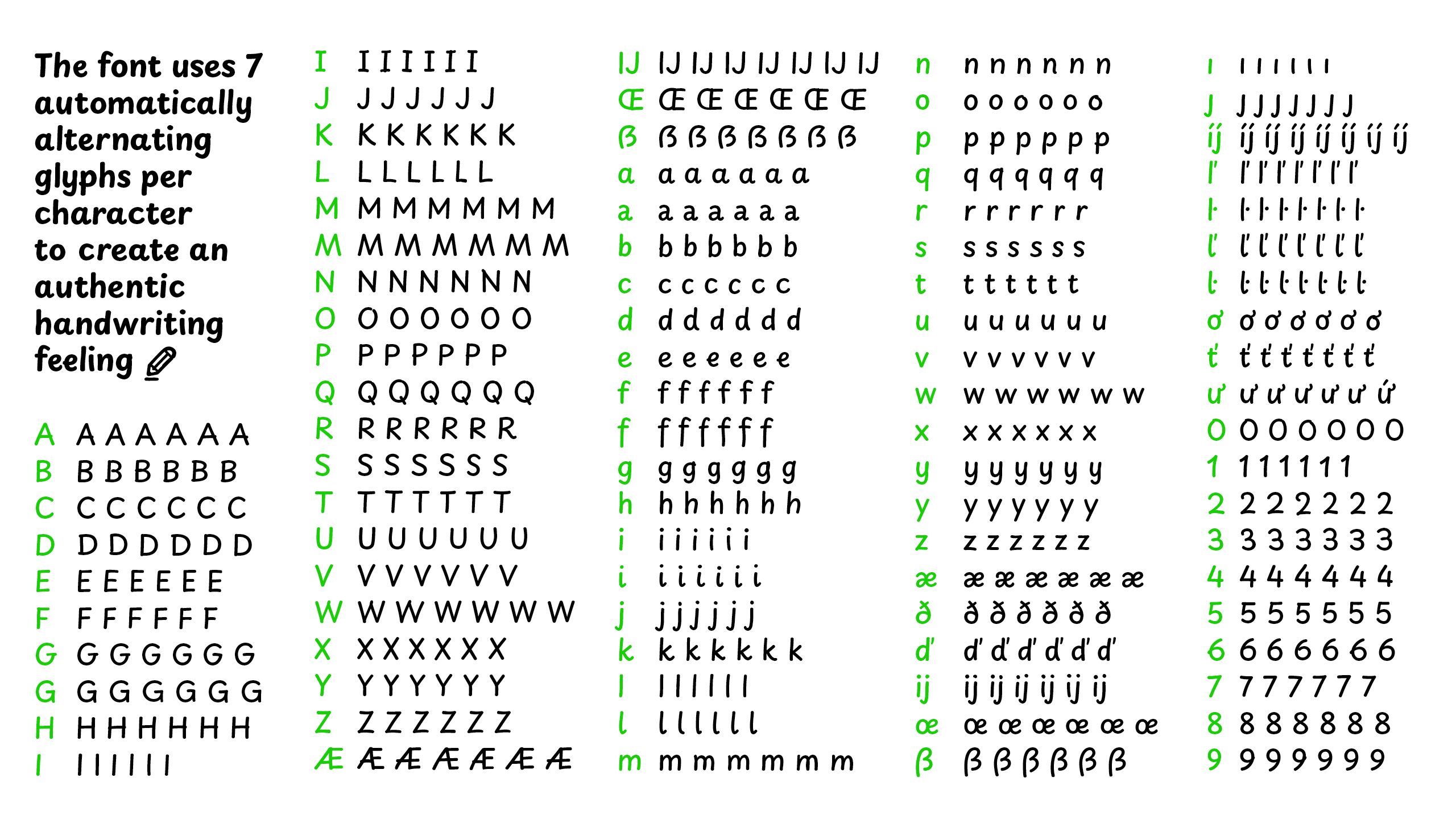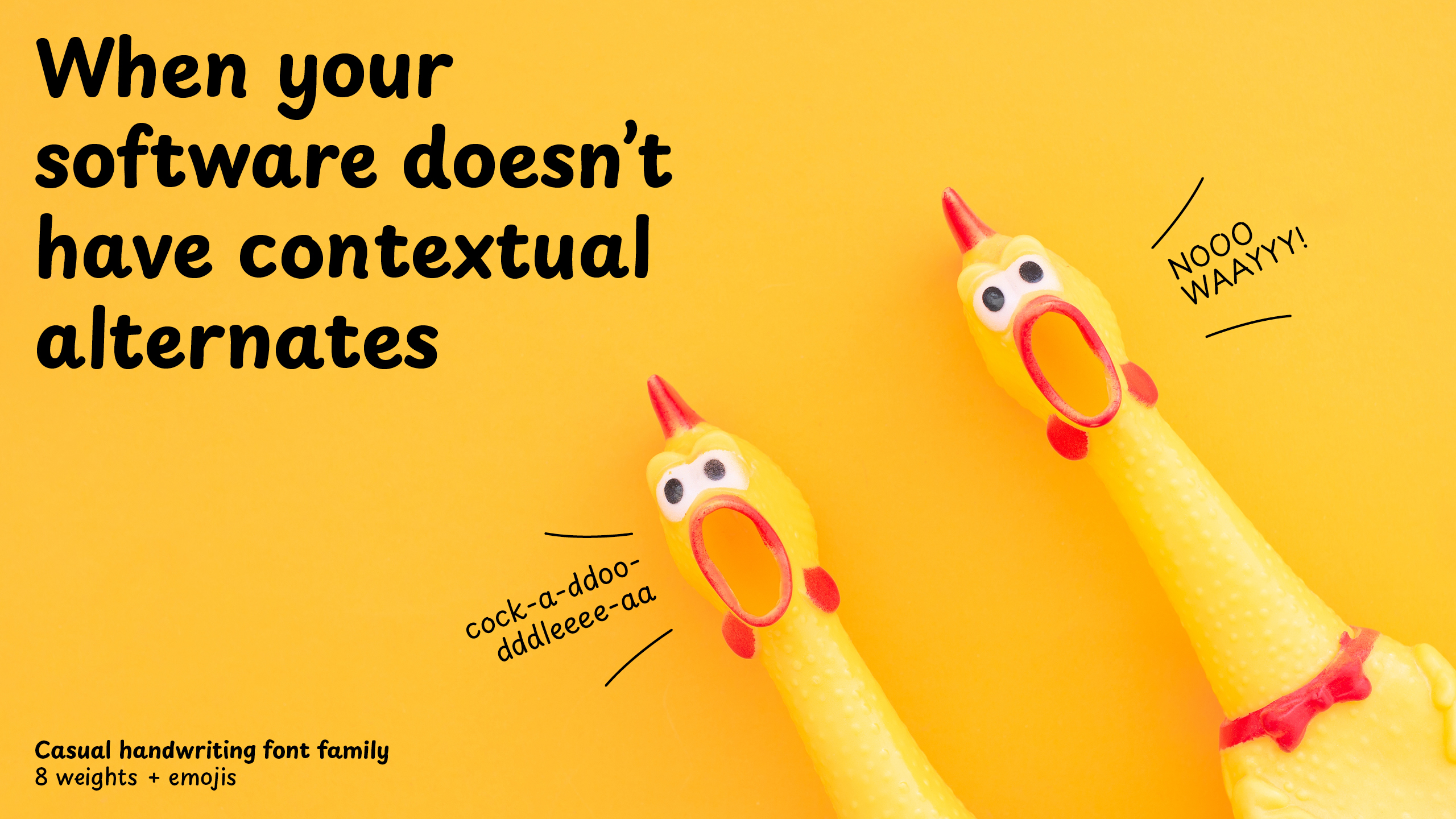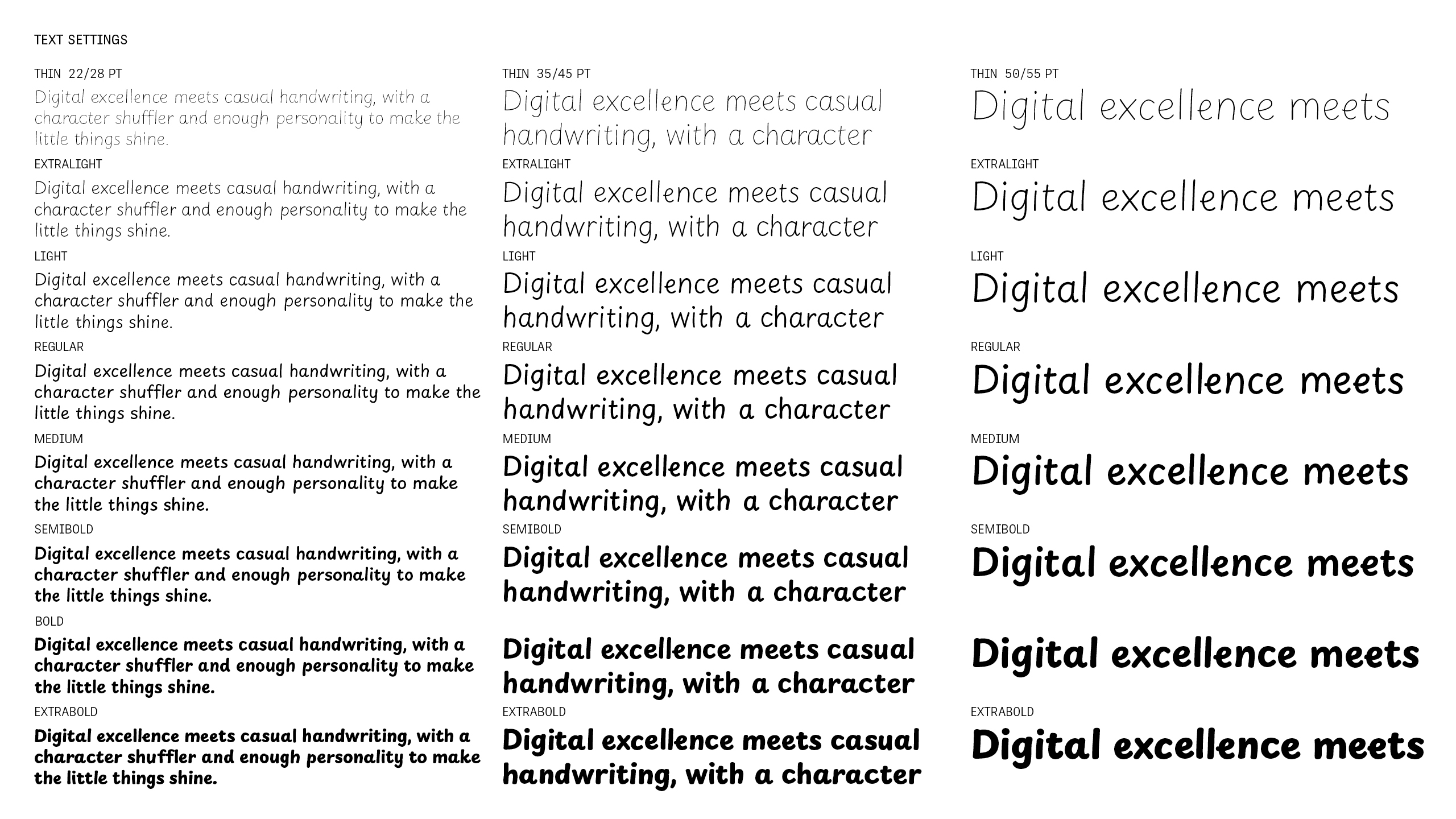 A general tension in the font world is that handwritten text should feel slightly inconsistent, while digital typefaces are intended to be uniform. So what’s the goal of a typeface that is both casual in look and digital in nature? To appear authentically spontaneous.
