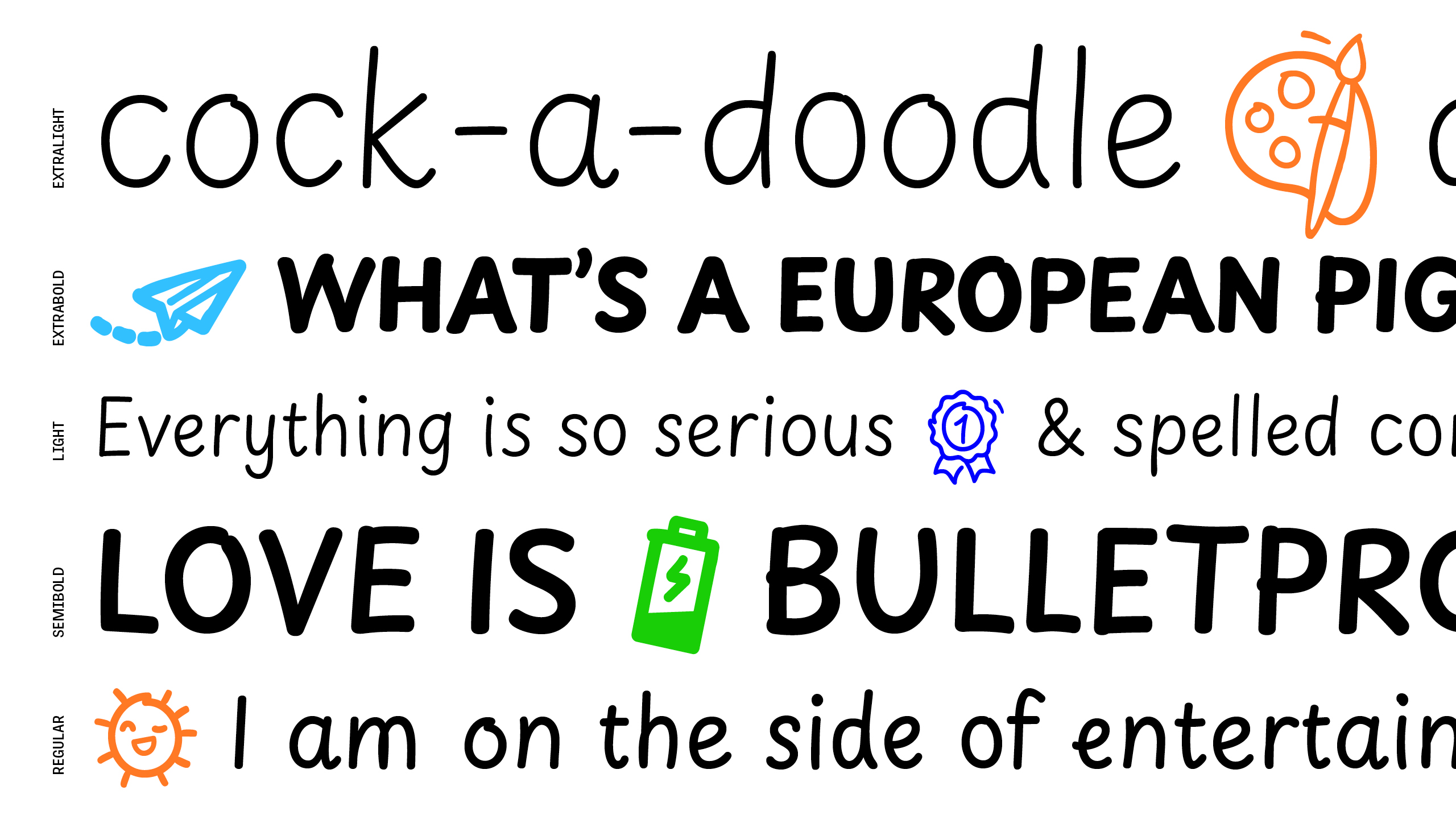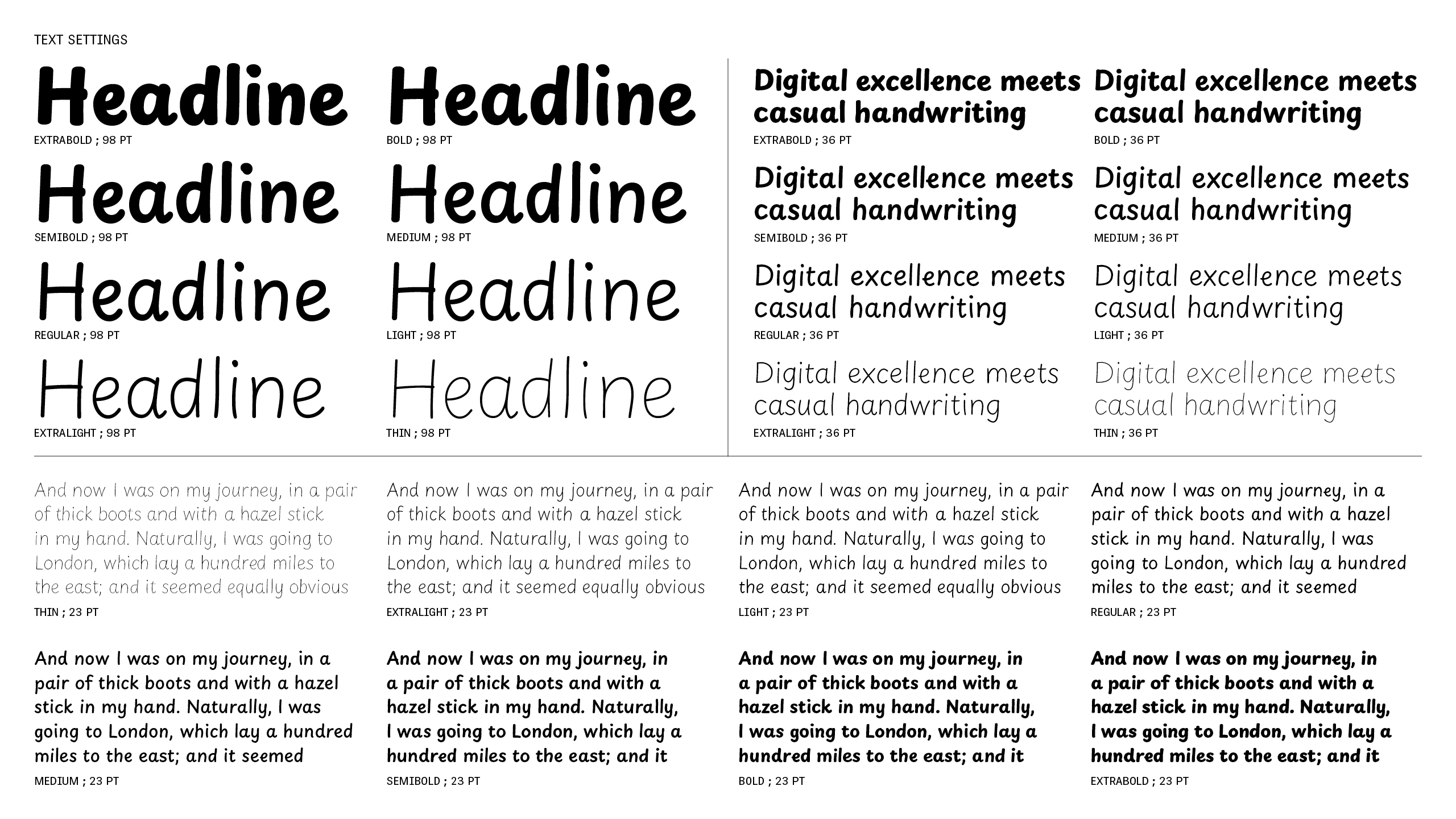 The family was made for all users and to shine within short, informal settings: greeting cards and invitations, casual signs and documents, and of course children’s books, educational materials, and graphic novels.