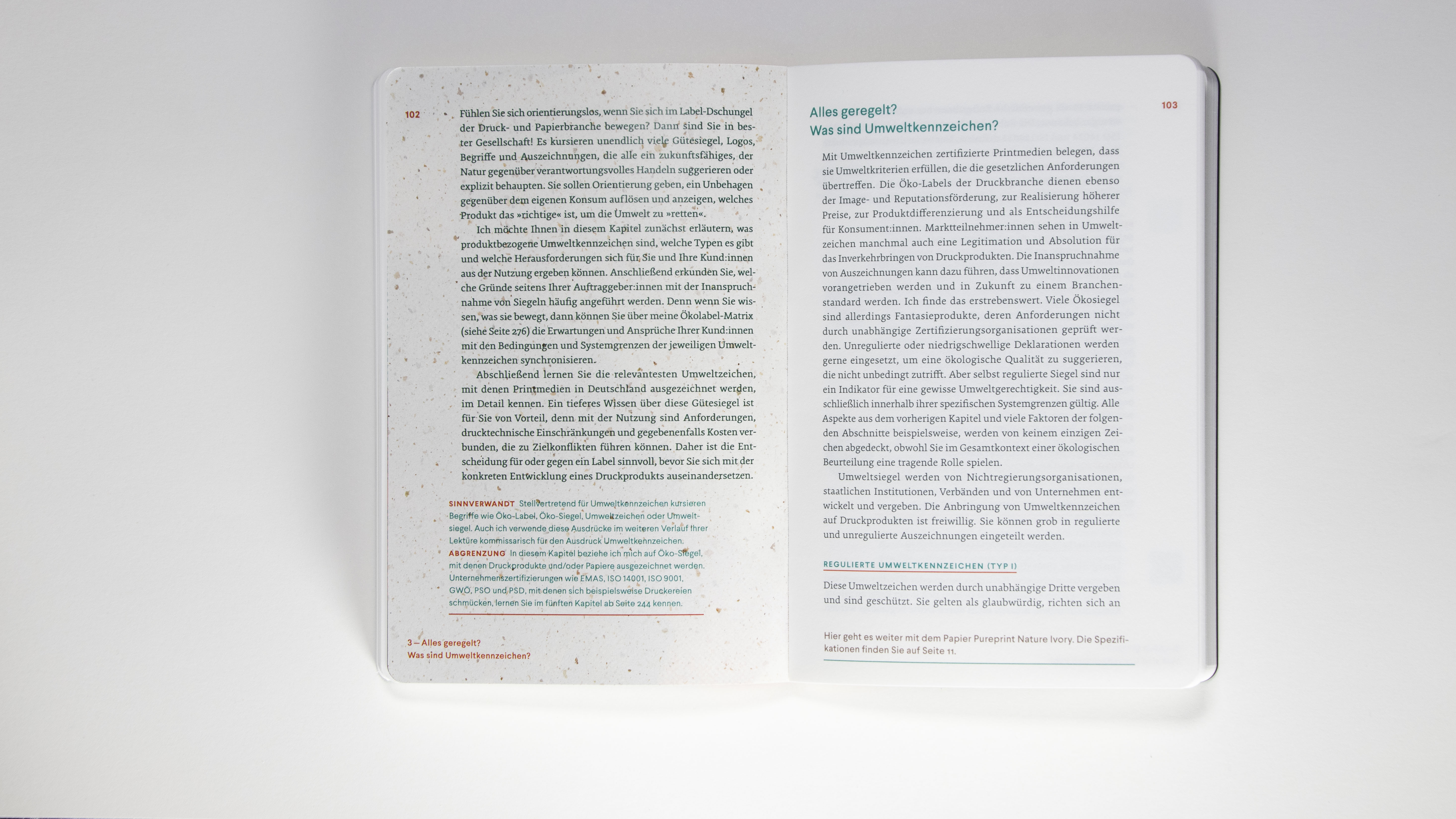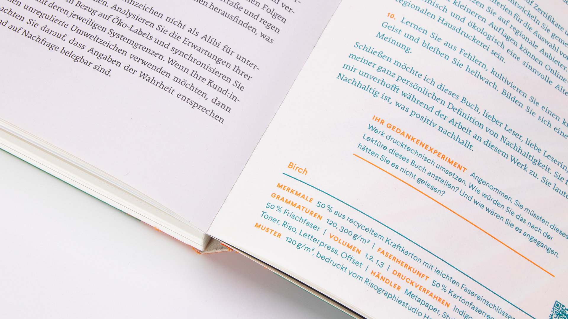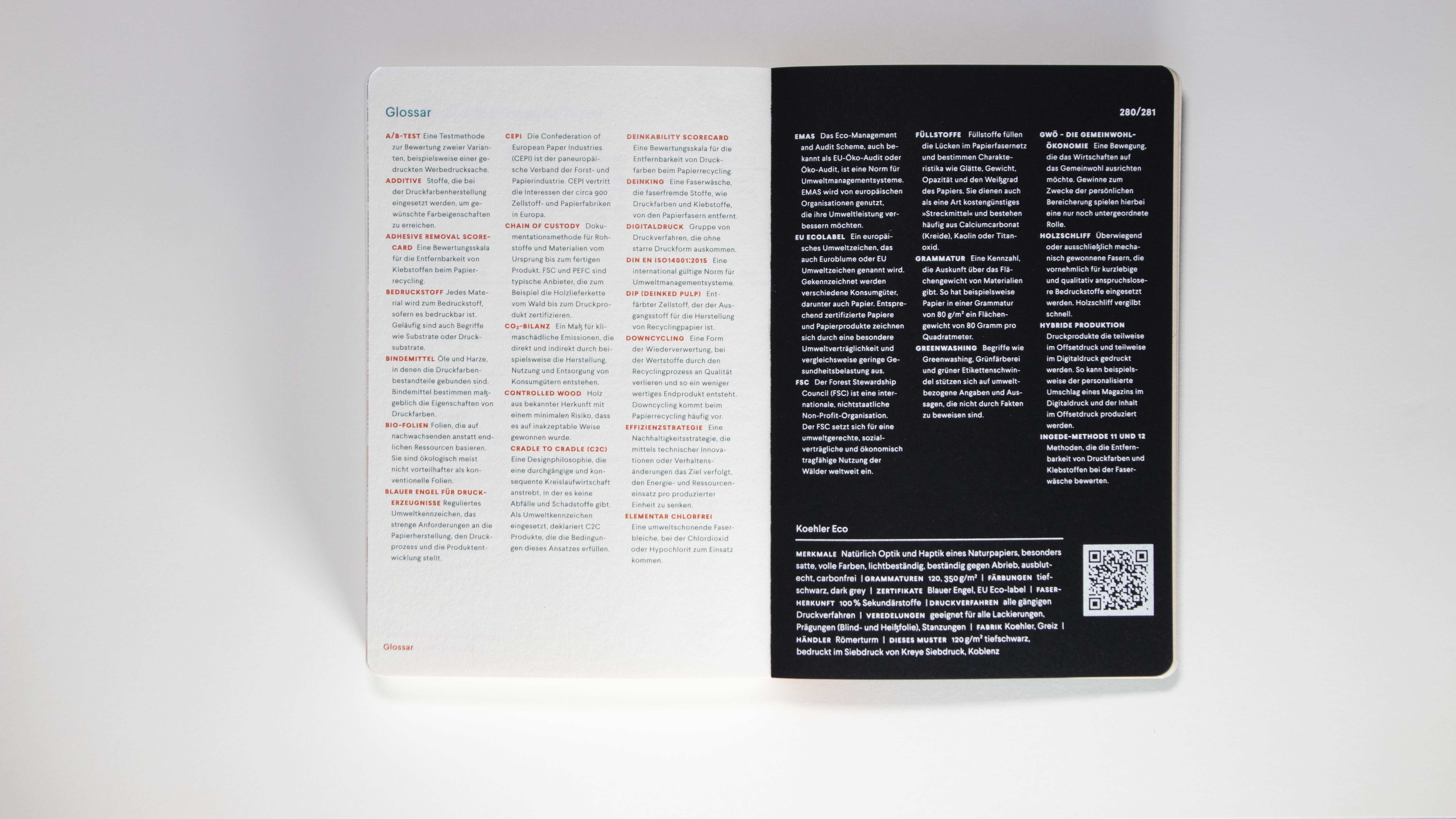 A laser-engraved bookmark made of grass cardboard adds the scent of hay and meadow to the reading pleasure. The round punched corners make the entire compendium more than just a book on sustainable printing but a hand-flattering multi-sensory experience.