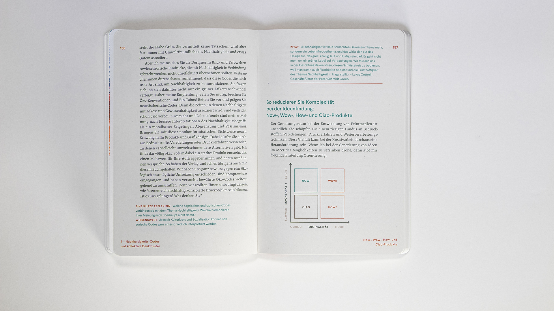 Form and content become a coherent unit and confirm the basic idea of the book: the most important course for sustainability is already set in the conception phase and a decision is made as to whether the work will have a "want-to-have" character. The cover is made with a vegan apple leather and FSC-certified cellulose linen. The format was chosen so that 50 pages fit on one printed sheet. Four different printing processes, four print finishes and 18 different sustainable papers inspire creativity and allow you to literally grasp what you have learnt.