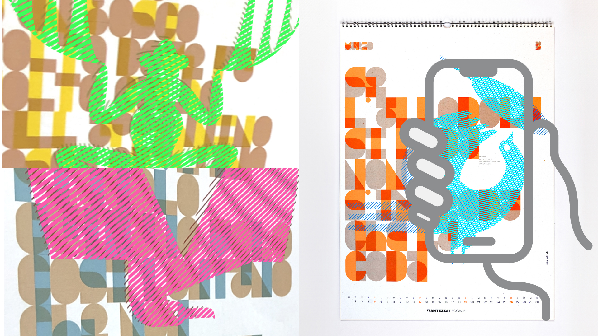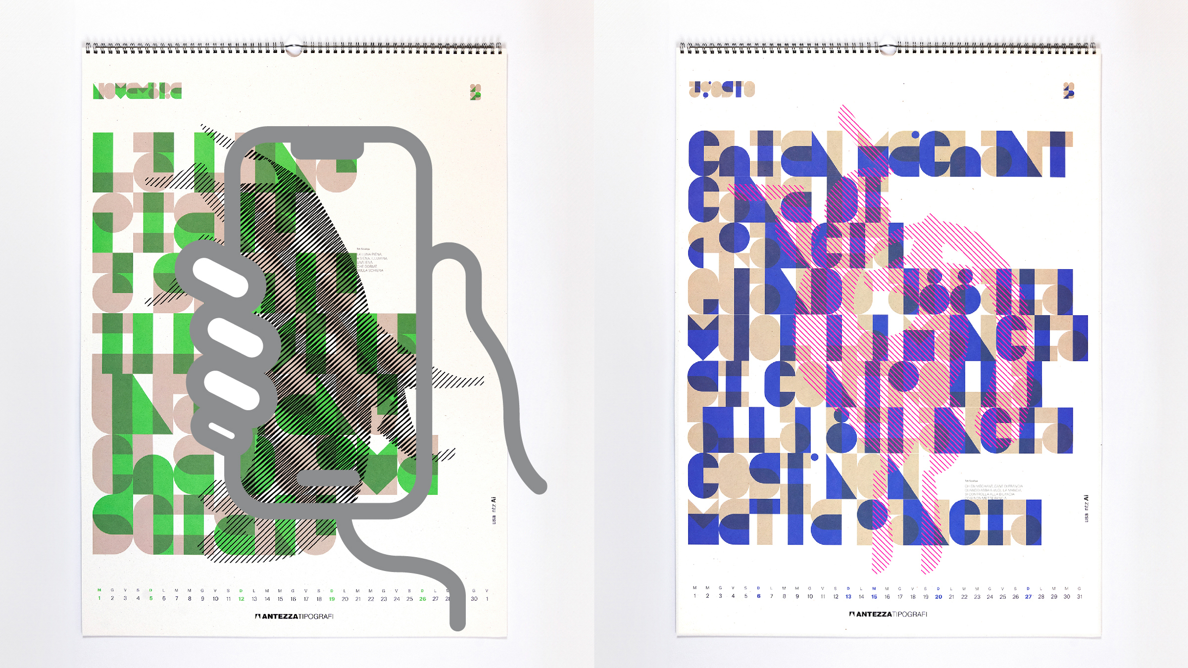 There are two ways and two times through which the new calendar can be decoded. A first traditional reading focuses on the static composition, on the expressive typography, while a second interactive one exploits a dynamic composition in augmented reality that, thanks to the free "ntz ai" application, allows the observer to discover the characters that are the protagonists of the stories.