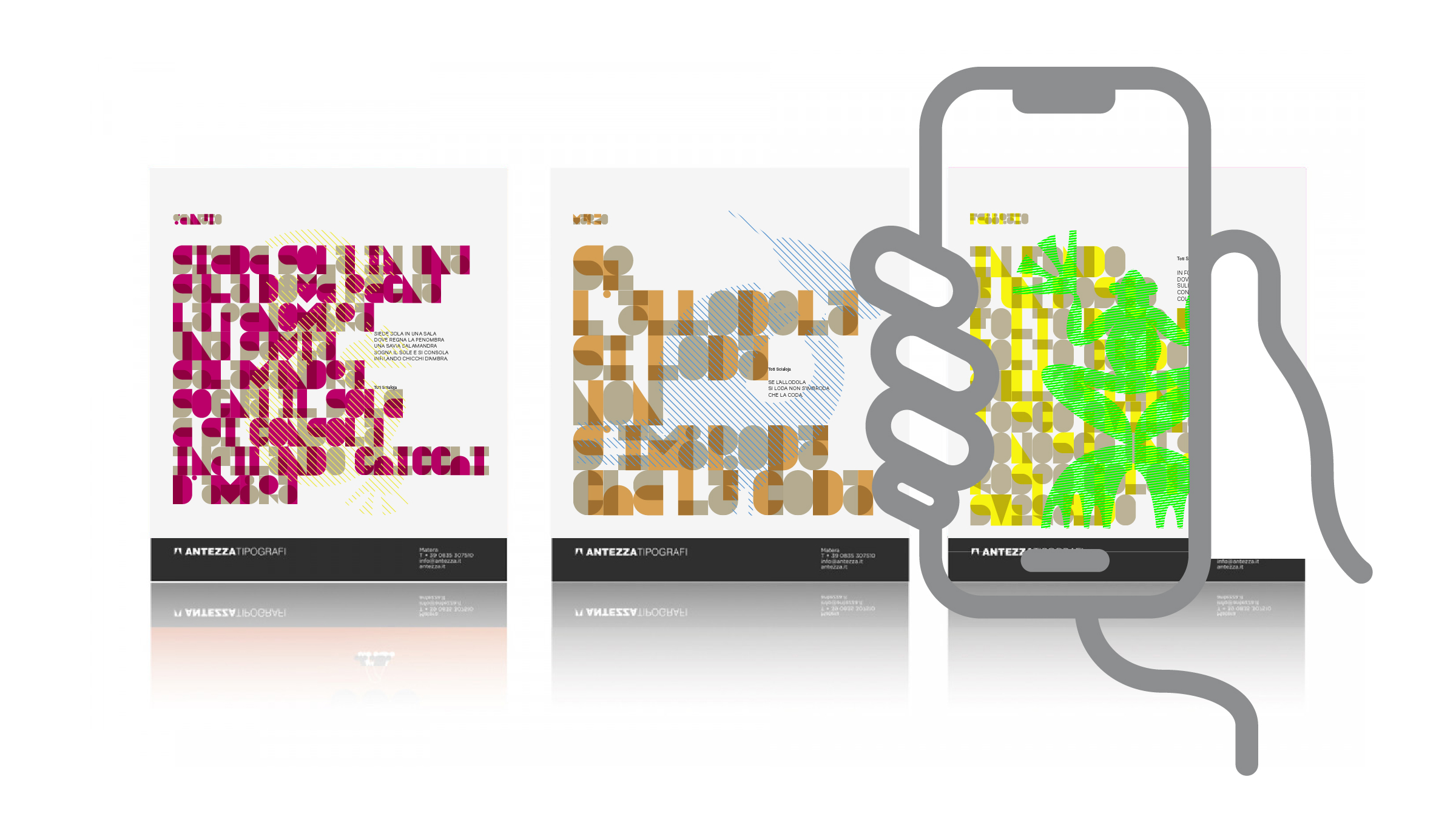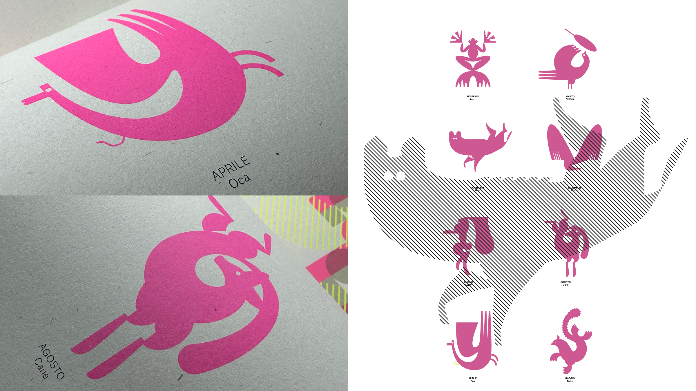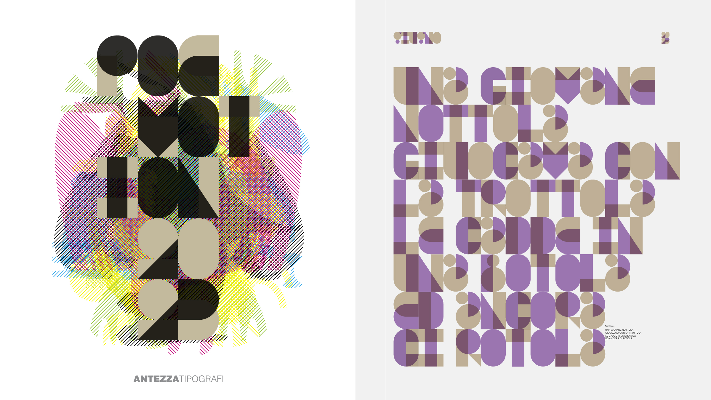 The shapes that determine a sequentially organised typographic glyph constantly mediate our relationship with reality and our ability to interpret or understand it, sometimes concealing, sometimes revealing apparently hidden meanings. With 'poemotion', the 2023 calendar designed for and with Antezza Tipografi, the intention was to pay homage to the literary work of Toti Scialoja, his extravagant nursery rhymes for adults, his linguistic games and his metrics promoting unpredictable juxtapositions that are always based on an animal, according to the traditional process of anthropomorphism of fairy tales. The strict linguistic rules underlying Scialoja's compositions are translated into a typographic language of radical, abstract, modular forms, symbolising how even behind a nursery rhyme it is actually possible to carefully glimpse a much deeper meaning.