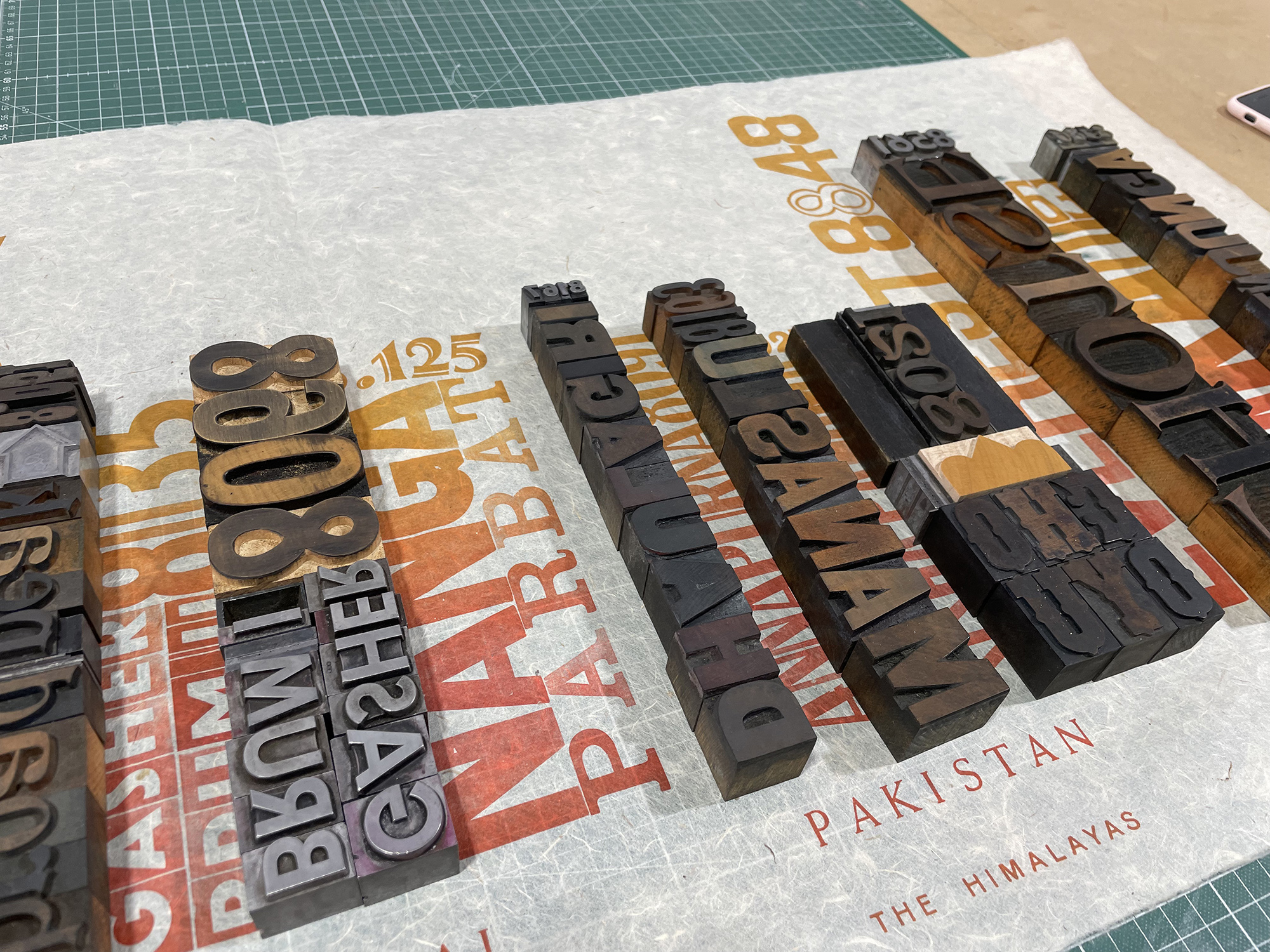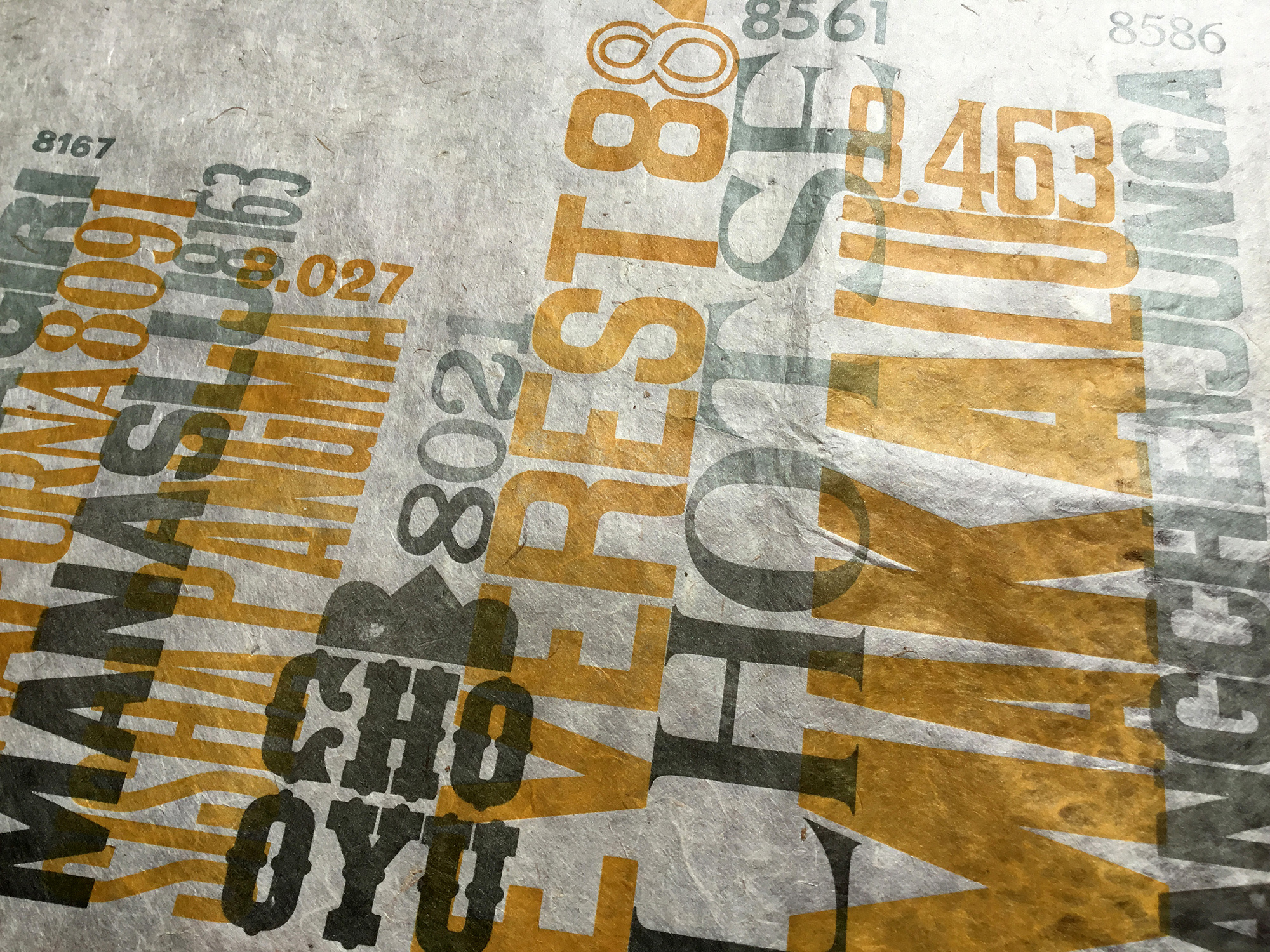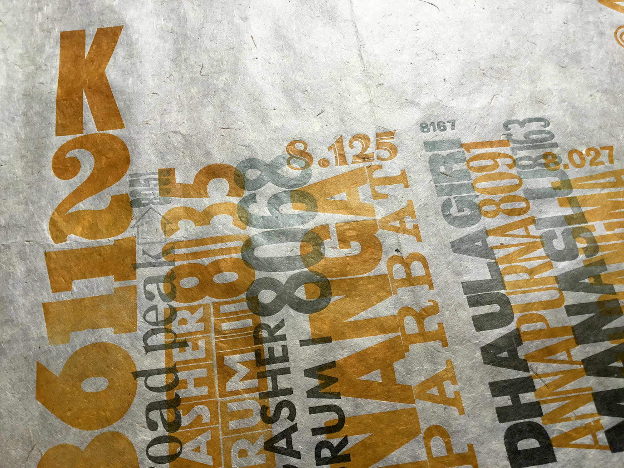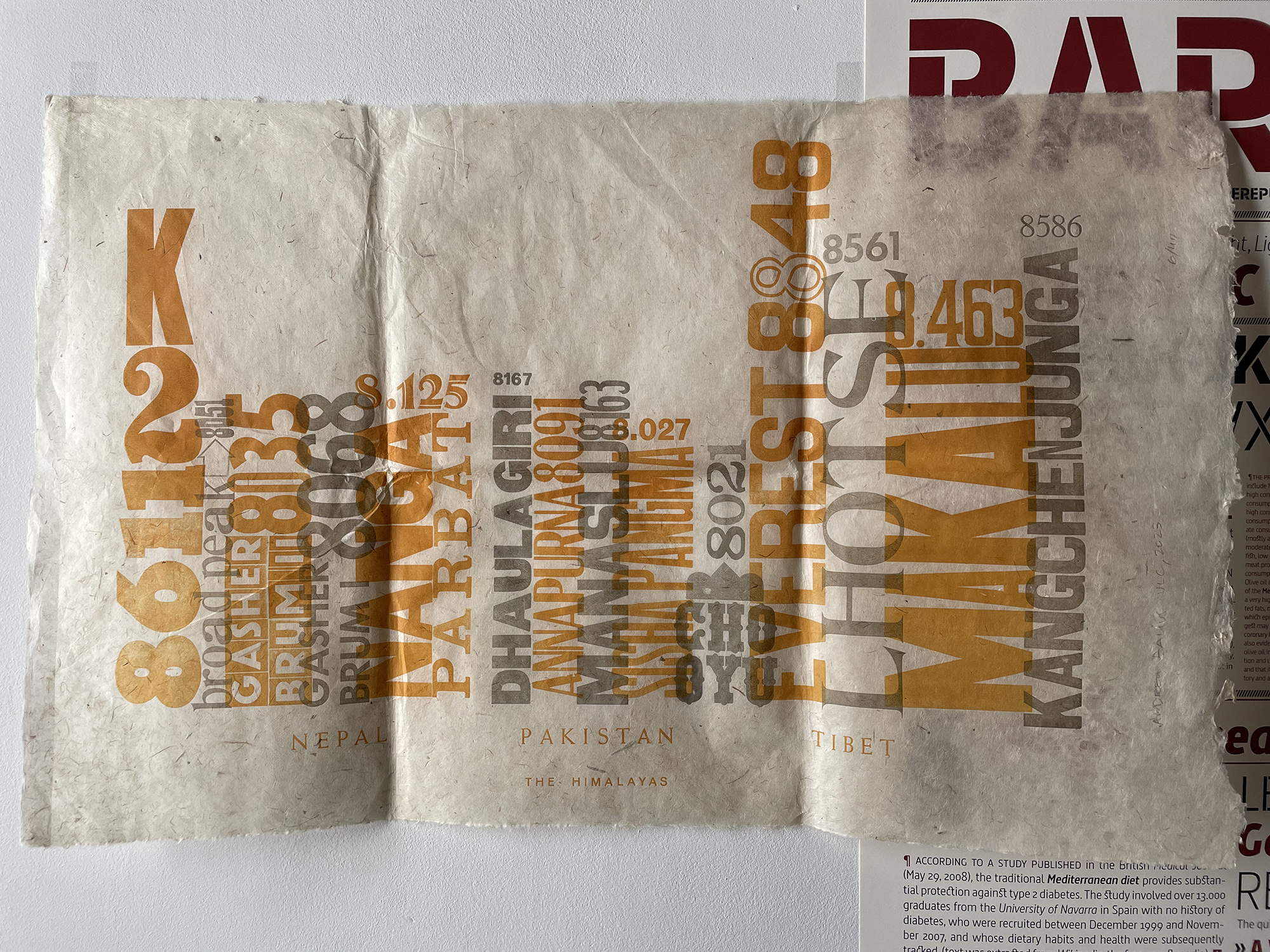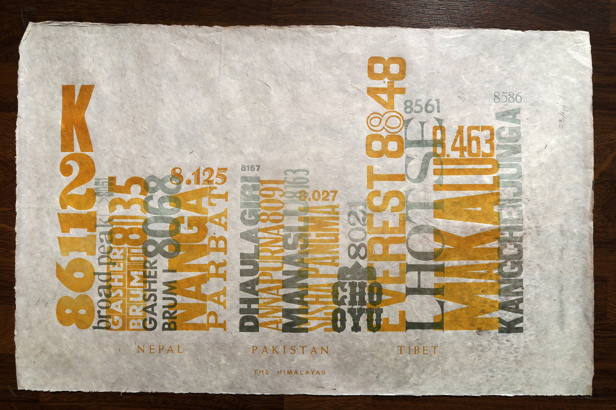 This is a Letterpress Poster displaying the highest 14 eight thousand summits in the Himalayas range according to their position and altitude. The poster was printed on natural rice paper handmade in Nepal. The work has been printed using both wood types (primarily) and metal lead types.