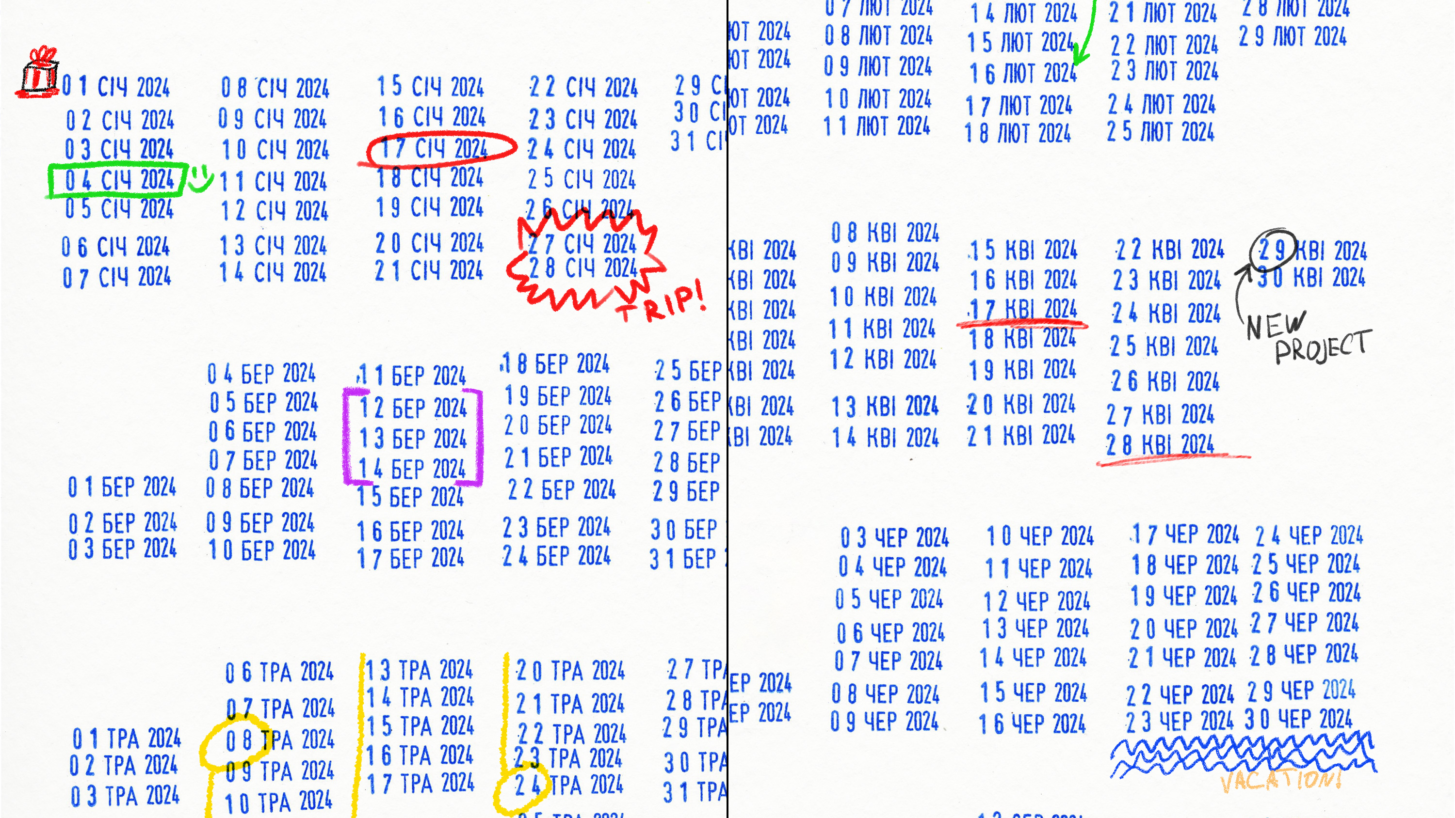 I also encourage other calendar owners not to put it on the wall in a frame and under glass. Instead, use it more like a planner notebook, marking certain dates or making notes. So, when a year passes, this calendar will become not only my graphic work, but a new one - co-authored by me, the author, and the owner, the co-author, who will have the right to put his signature next to mine. This invisible but real collaboration is also something I value: both in my work as a designer and in the support that people give each other in difficult times.
