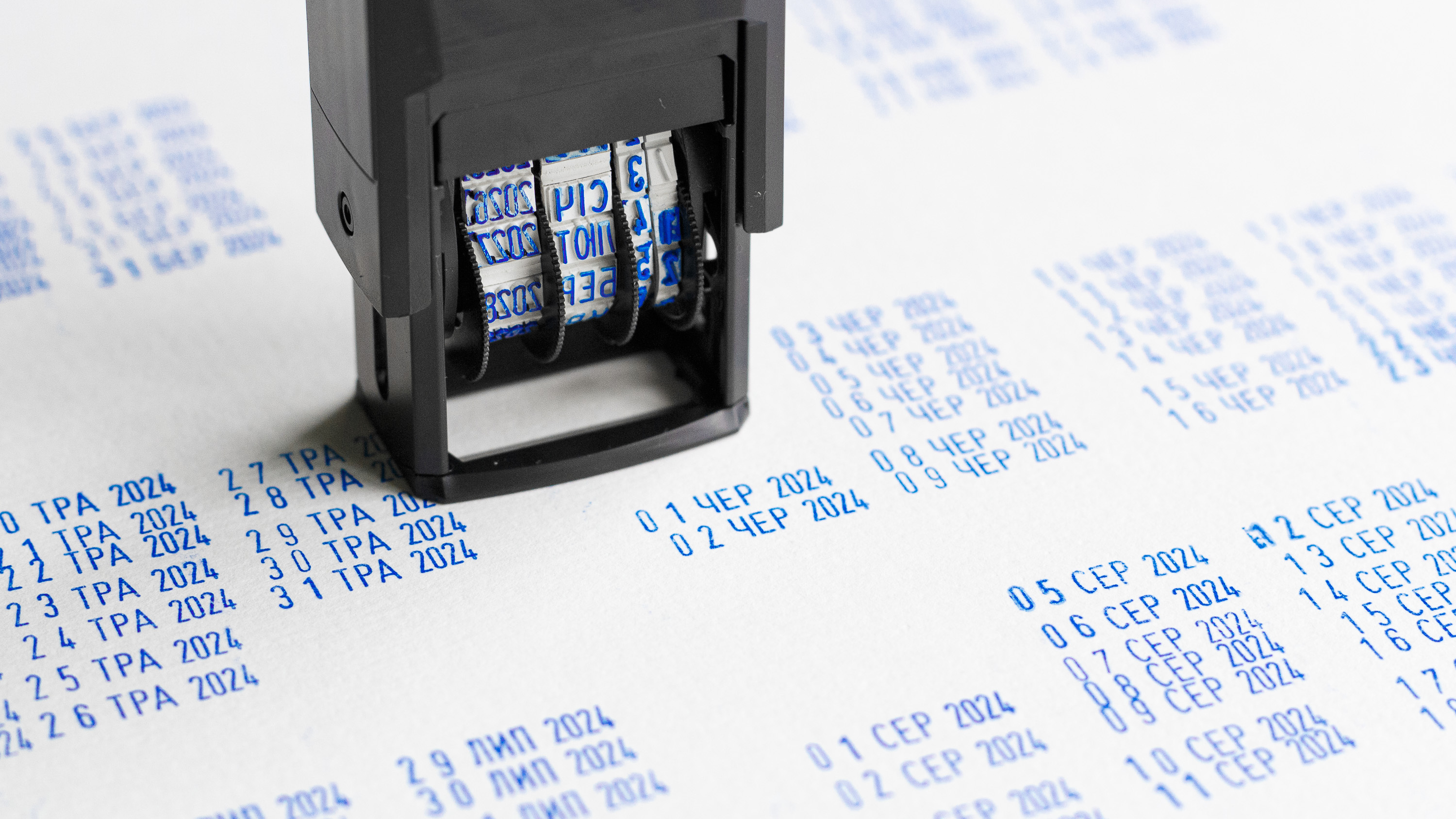 The calendar is printed with a standard office date stamp used to mark office documents. Each stamp movement sets one date, after which you need to scroll the wheels to set a new date and put it back on the paper and leave the next mark. Repeat this for each day of the year, changing the day and month each time.