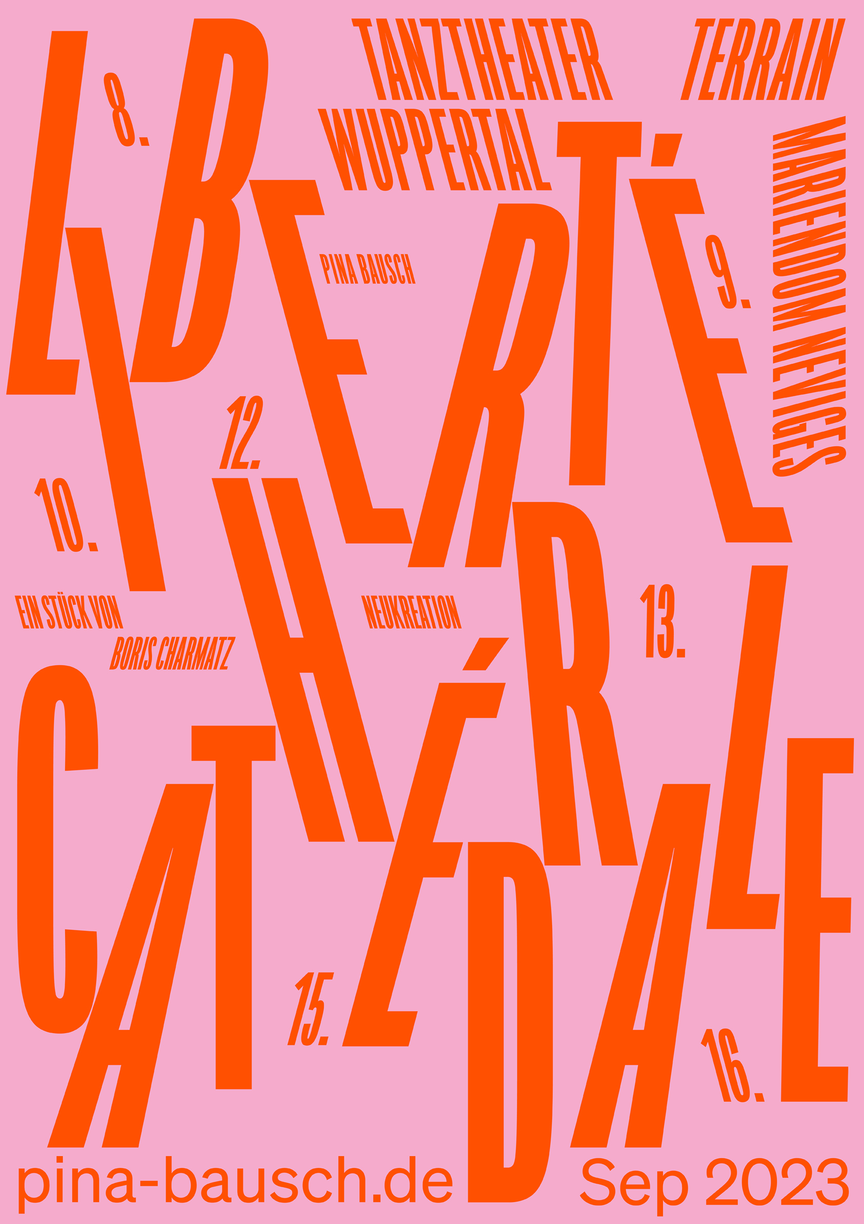"Liberté Cathédrale" was the debut choreography of Tanztheater Wuppertal's new director Boris Charmatz. The piece featured over 30 dancers performing up close to the audience in a dramatic and angular church architecture known as the "Mariendom". The typographic poster was created as a special edition and showcases the close encounters between the performers, the audience, and the unique setting.