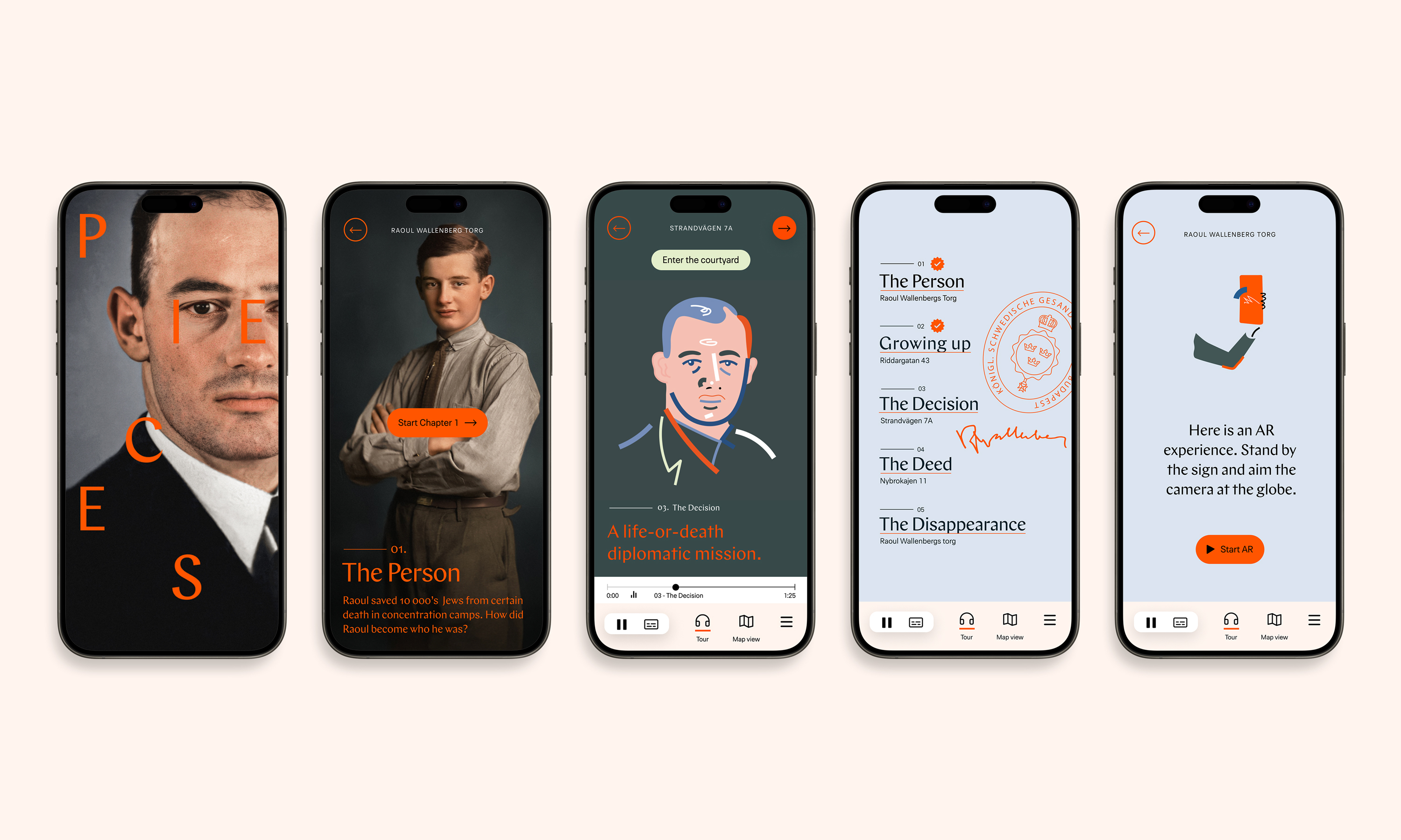"Pieces," an AR app that blends an interactive city walk and museum in one, lets users walk in Raoul's footsteps, listen, interact, and reflect. By experiencing his story like never before, we spark the realisation that individual actions, like puzzle pieces, can create a powerful collective impact. The concept of different pieces working together also makes the foundation for the identity.