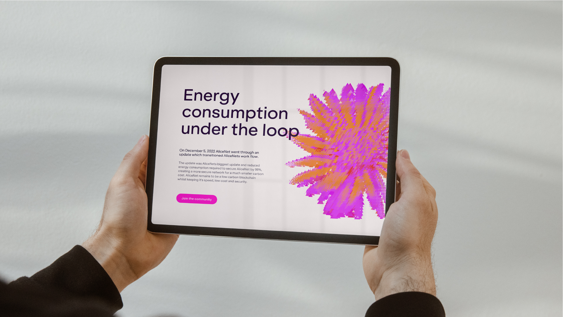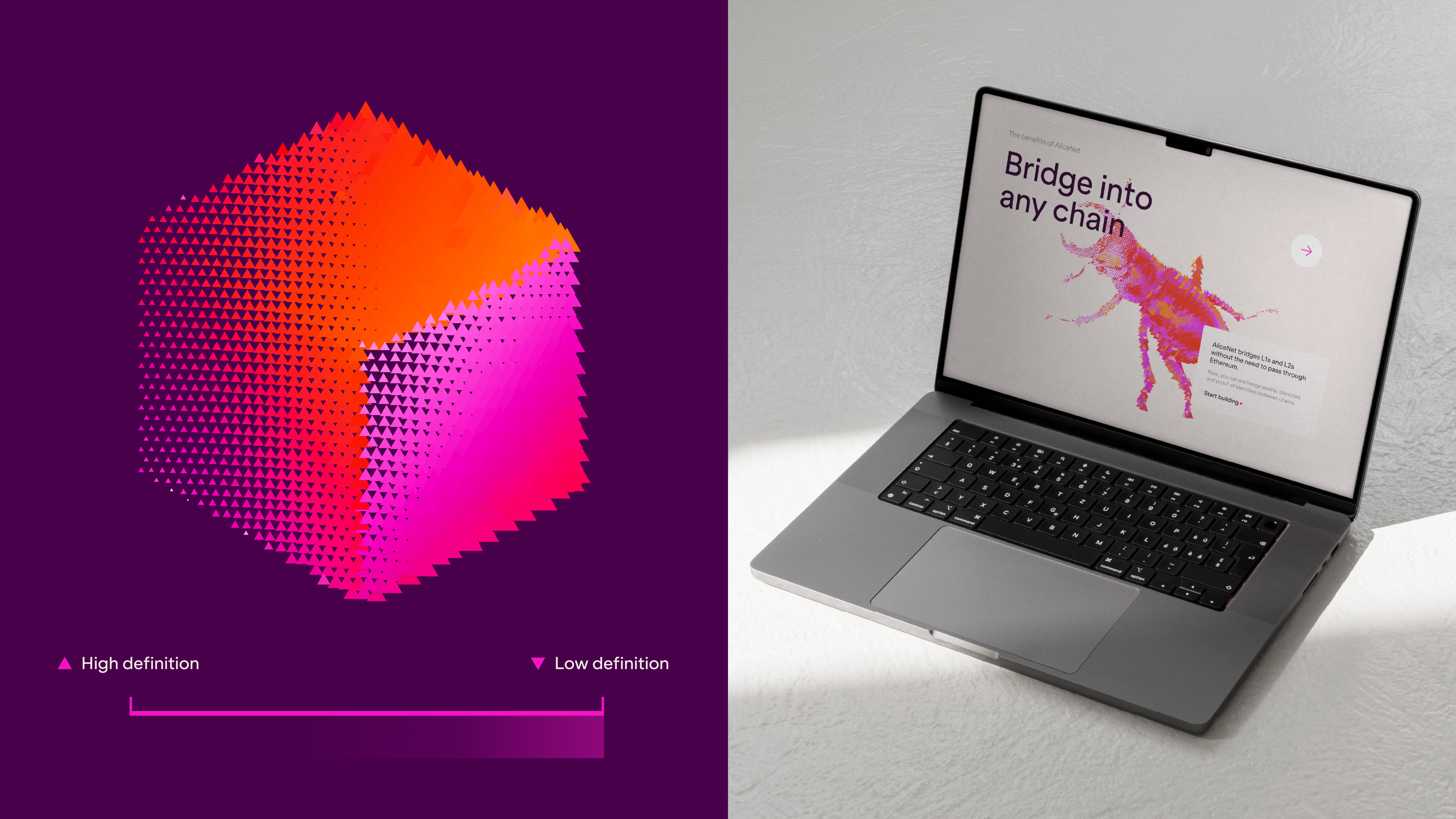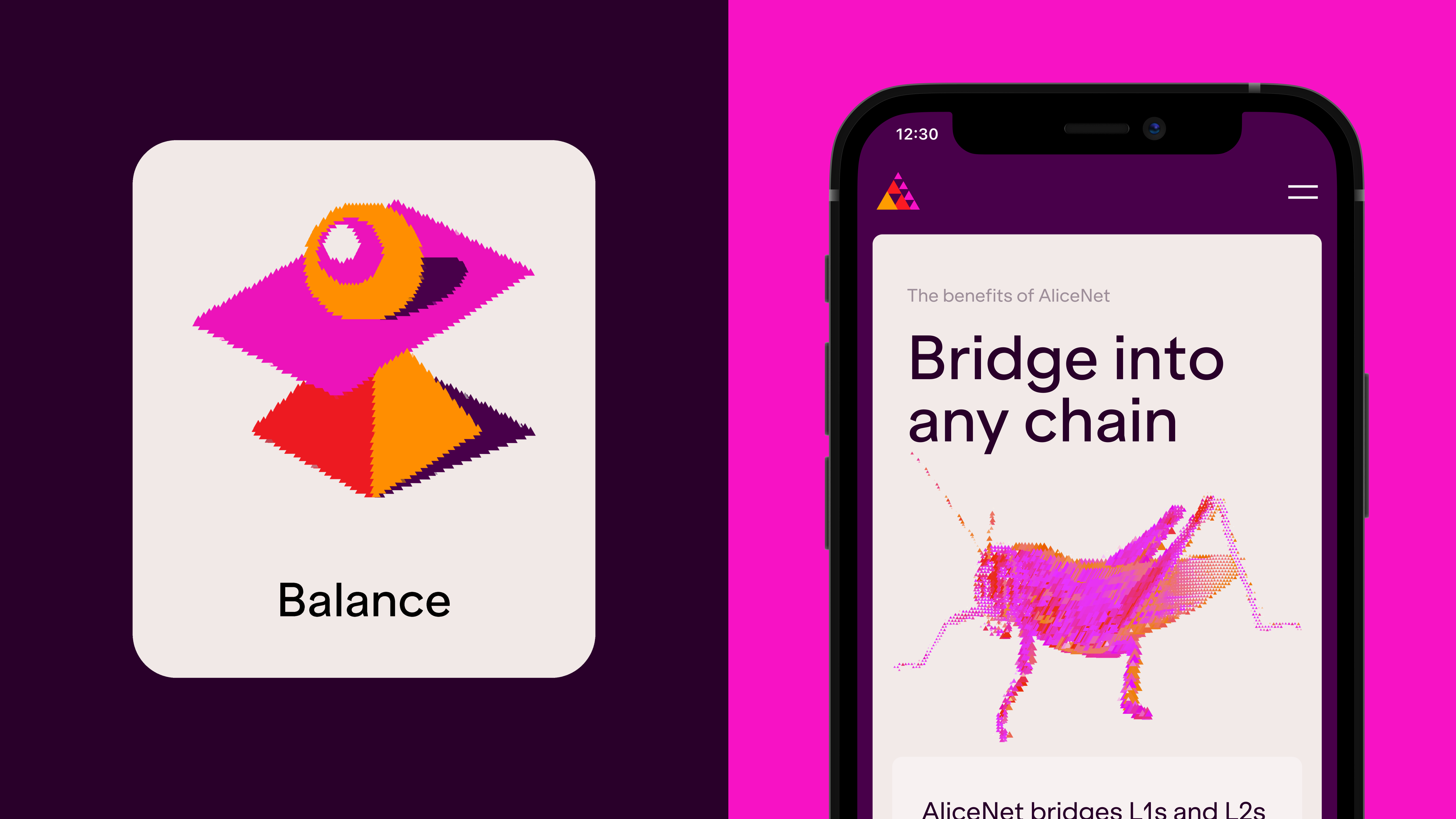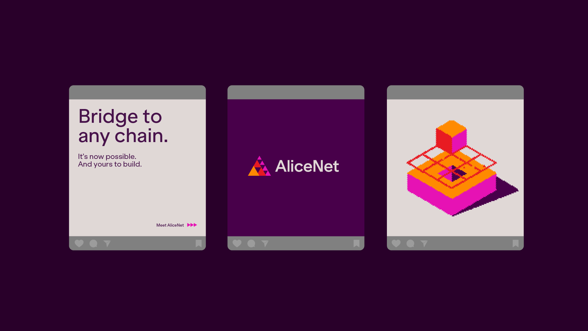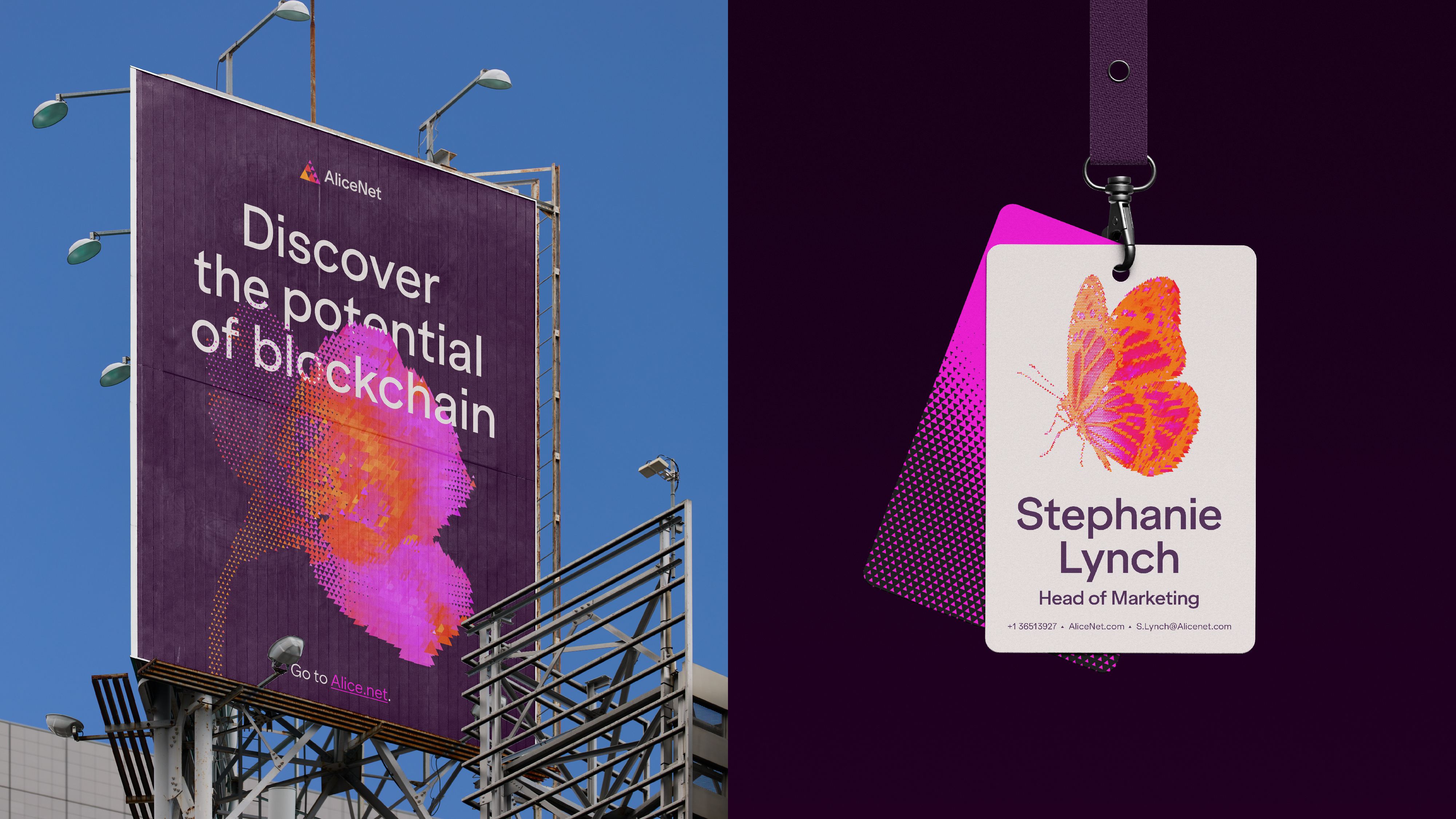 The conversation about blockchain is dominated by NFTs and Crypto cowboys. The space is teeming with sci-fi imagery, data visualisations and is all about profit and performance. AliceNet steers away from these motifs by embracing both natural imagery and high-tech symbolism. Sure, it has a technical core, but it is human in its appearance. AliceNet solved the impossible triangle, so we grounded their visual identity on a triangle - the strongest shape in engineering. We developed a digital image generator tool that allows AliceNet to create branded visuals fast and easy.