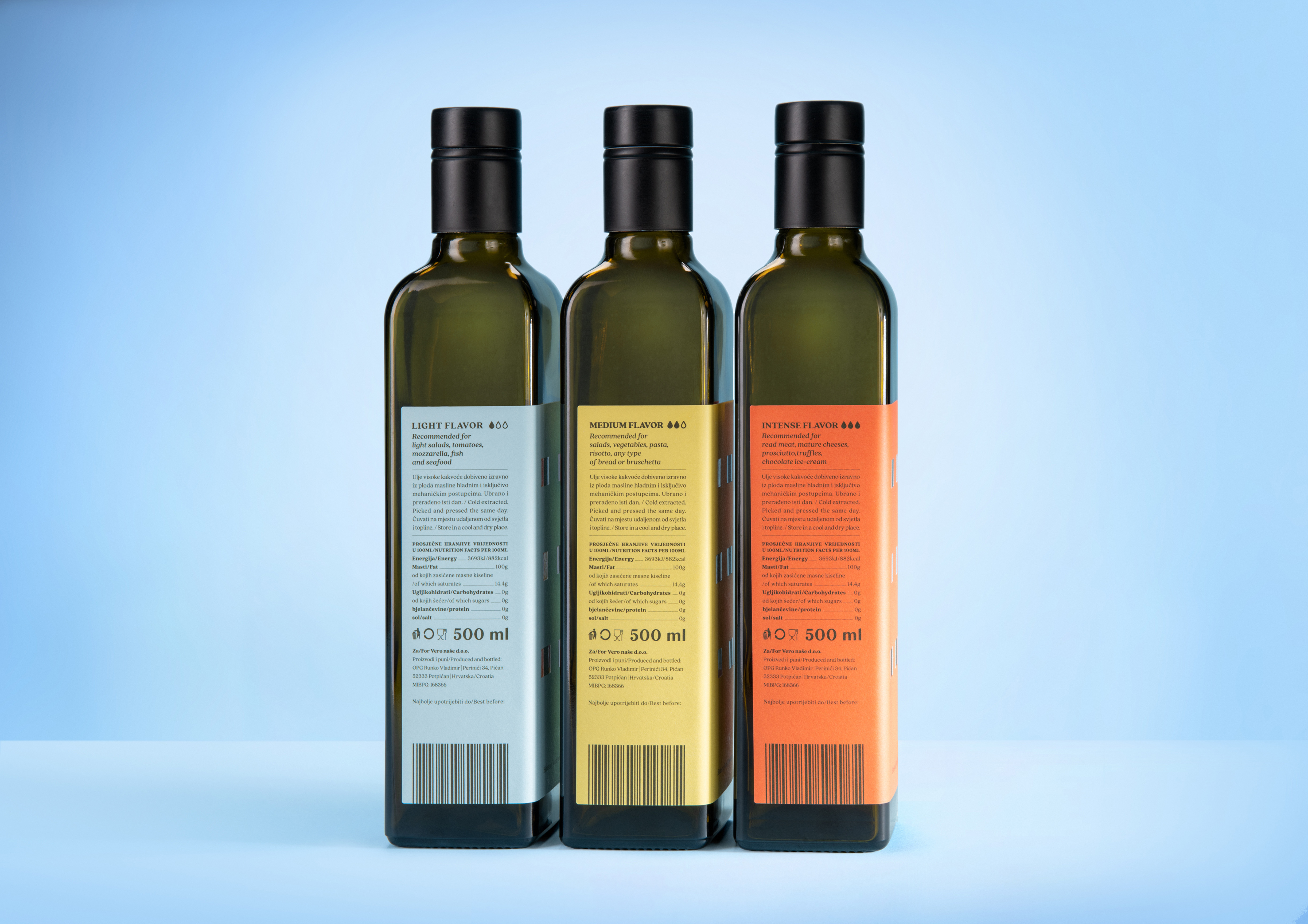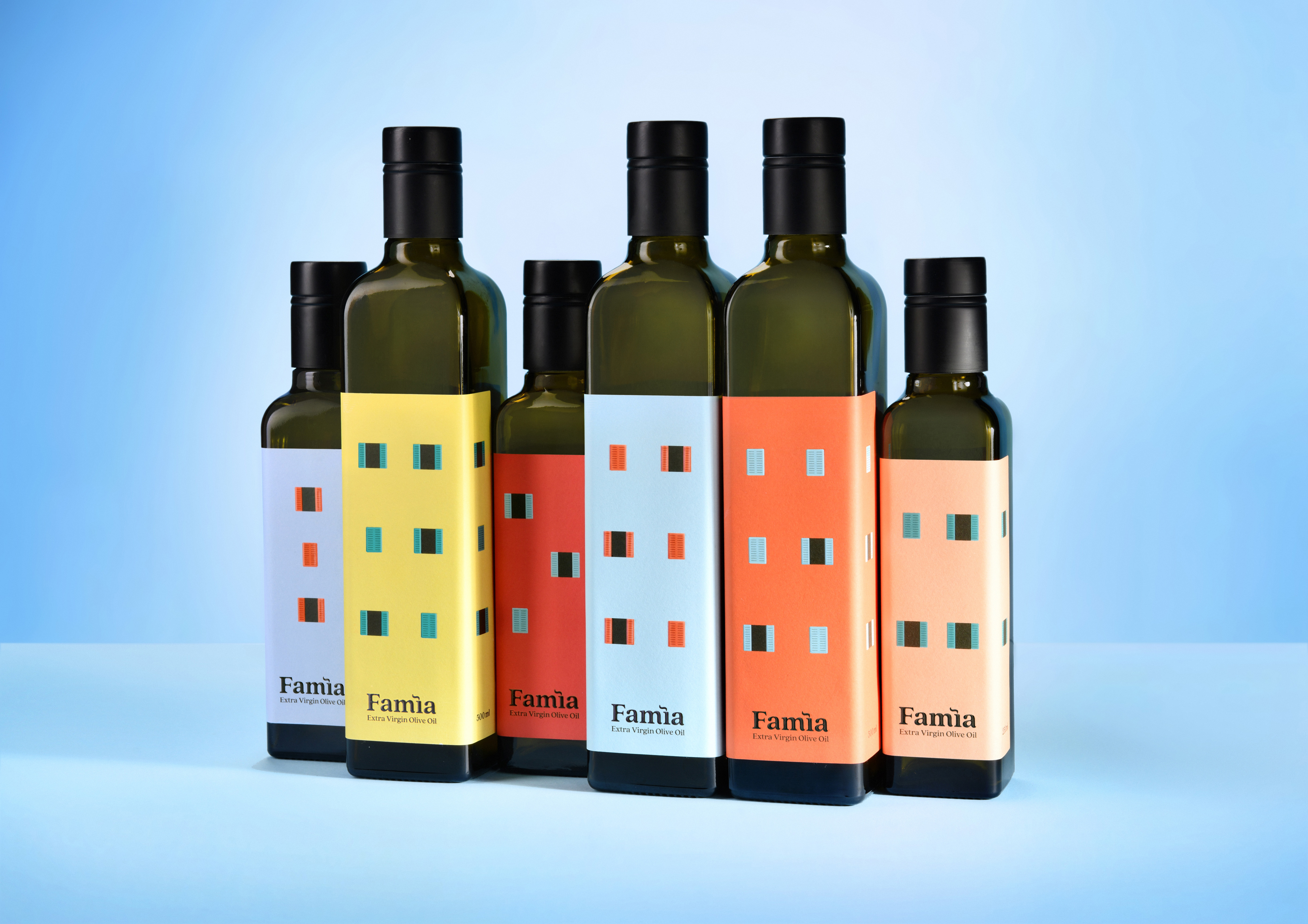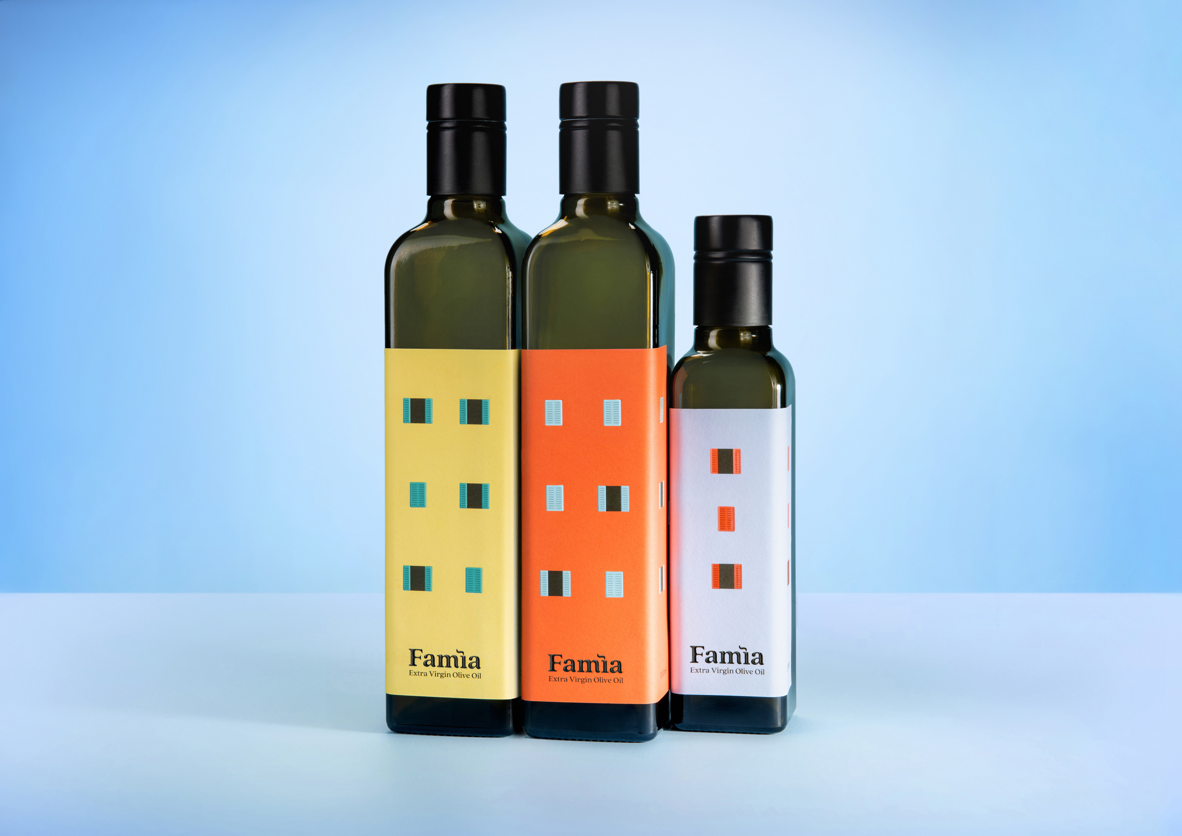 A simple label has transformed the bottle into a small family home, with its colors representing different intensities of the oil, tailored to 0.5 L bottles and smaller ones of 0.25 L.