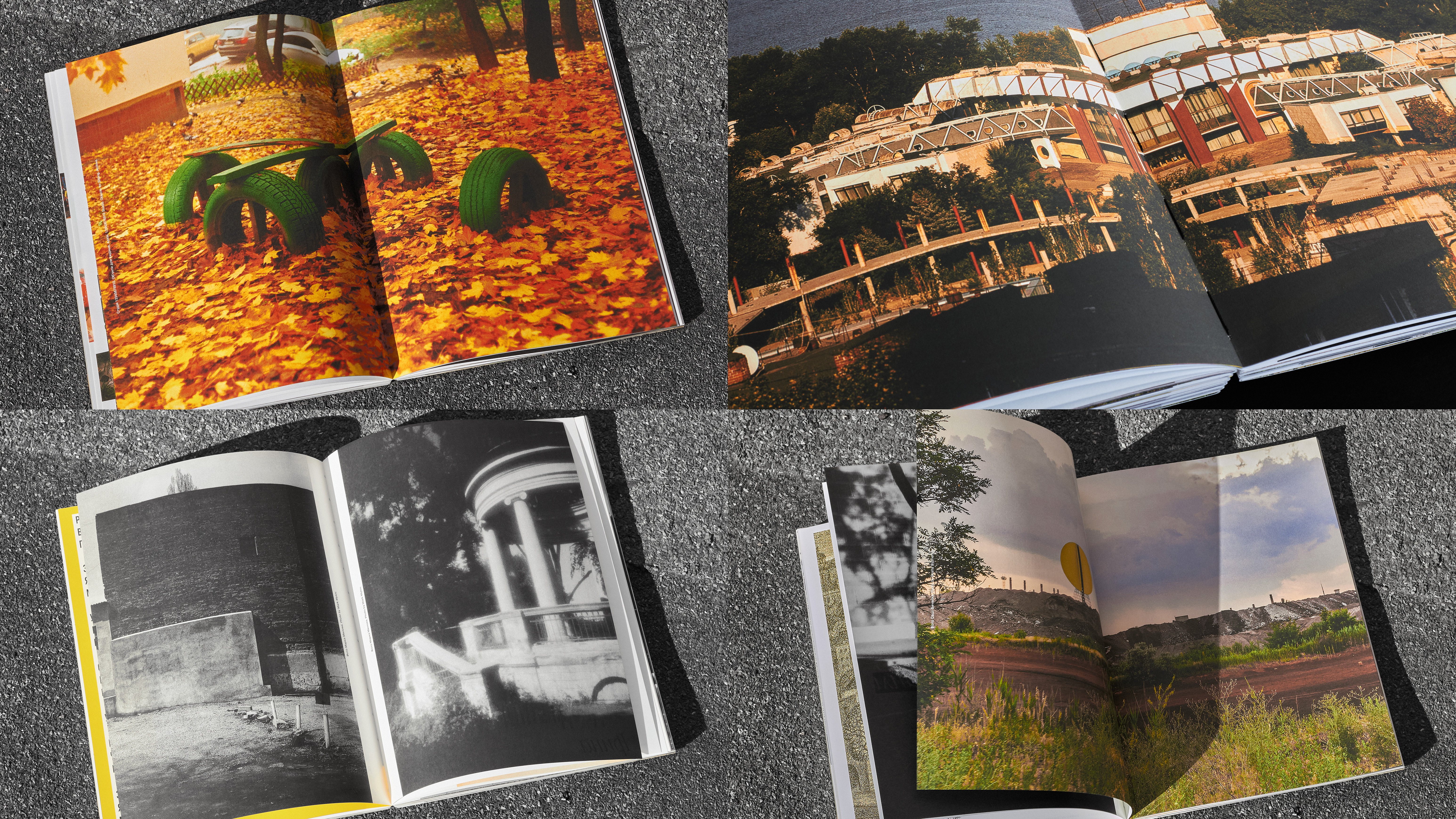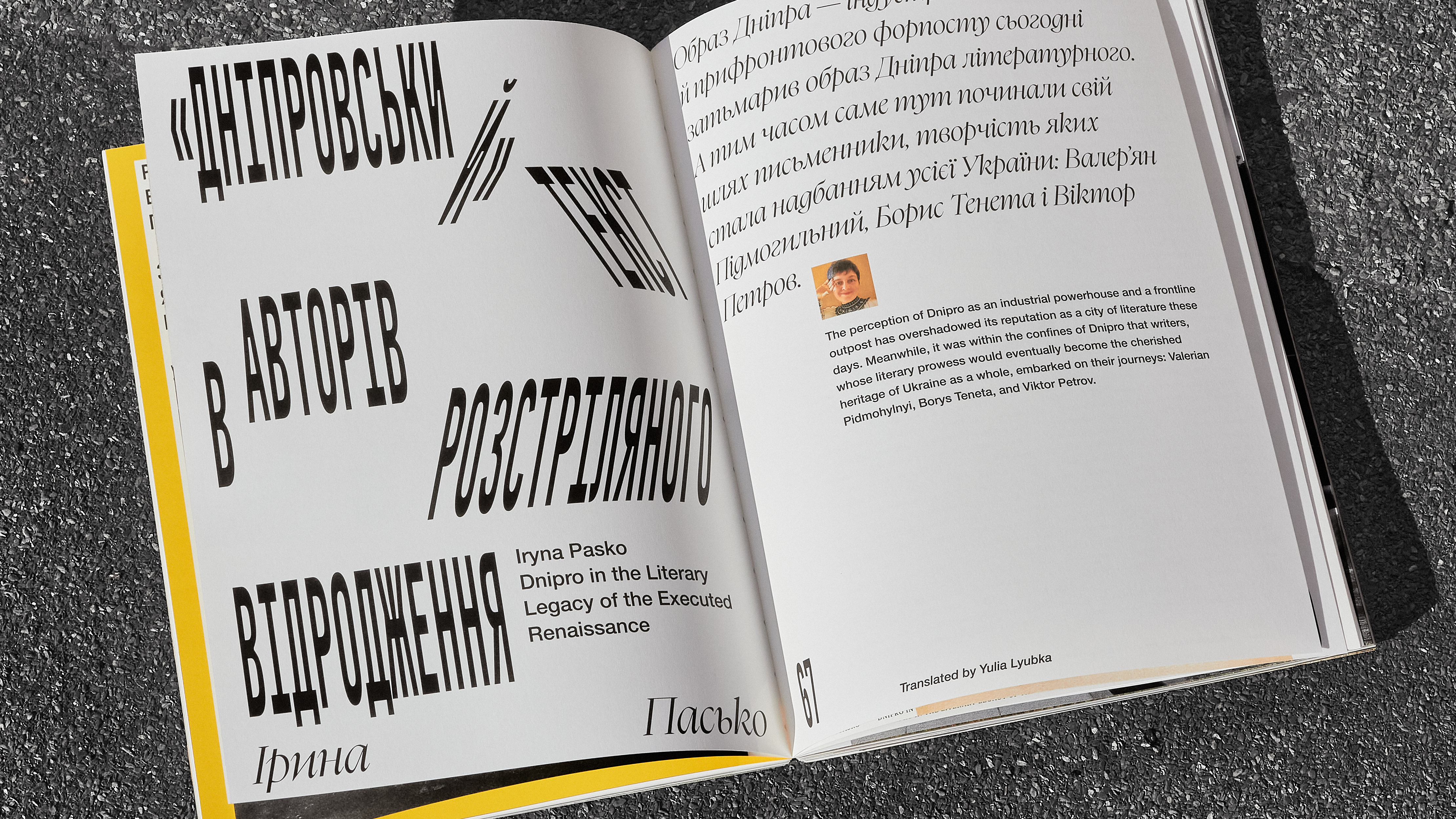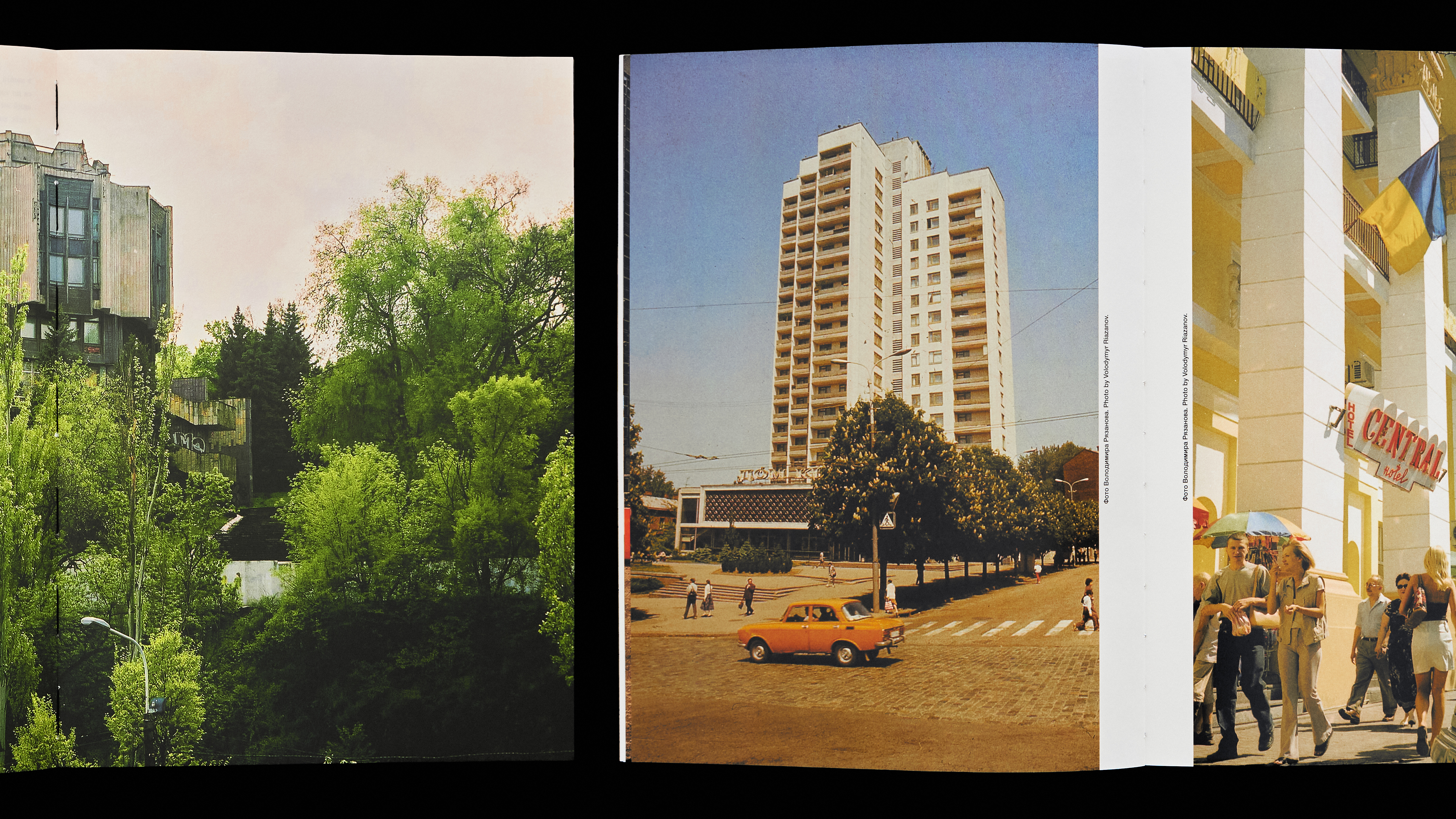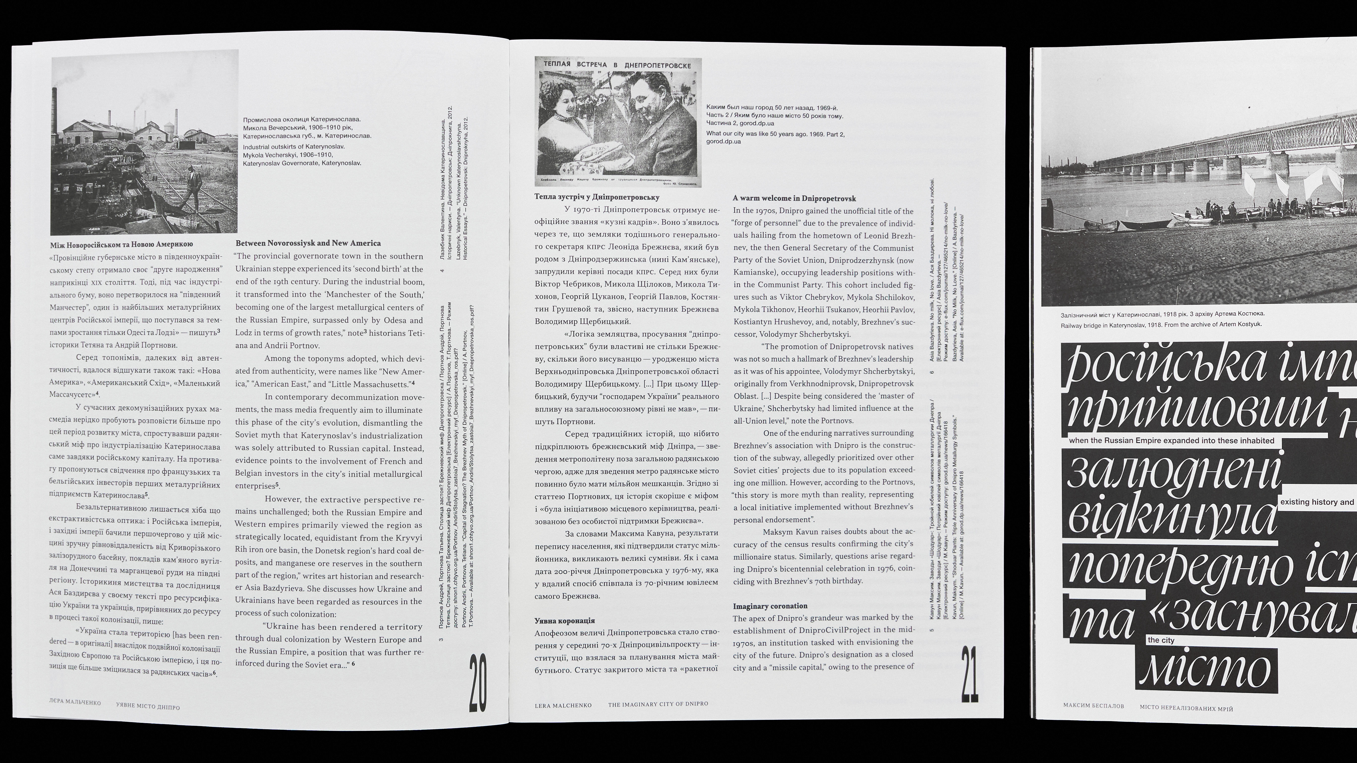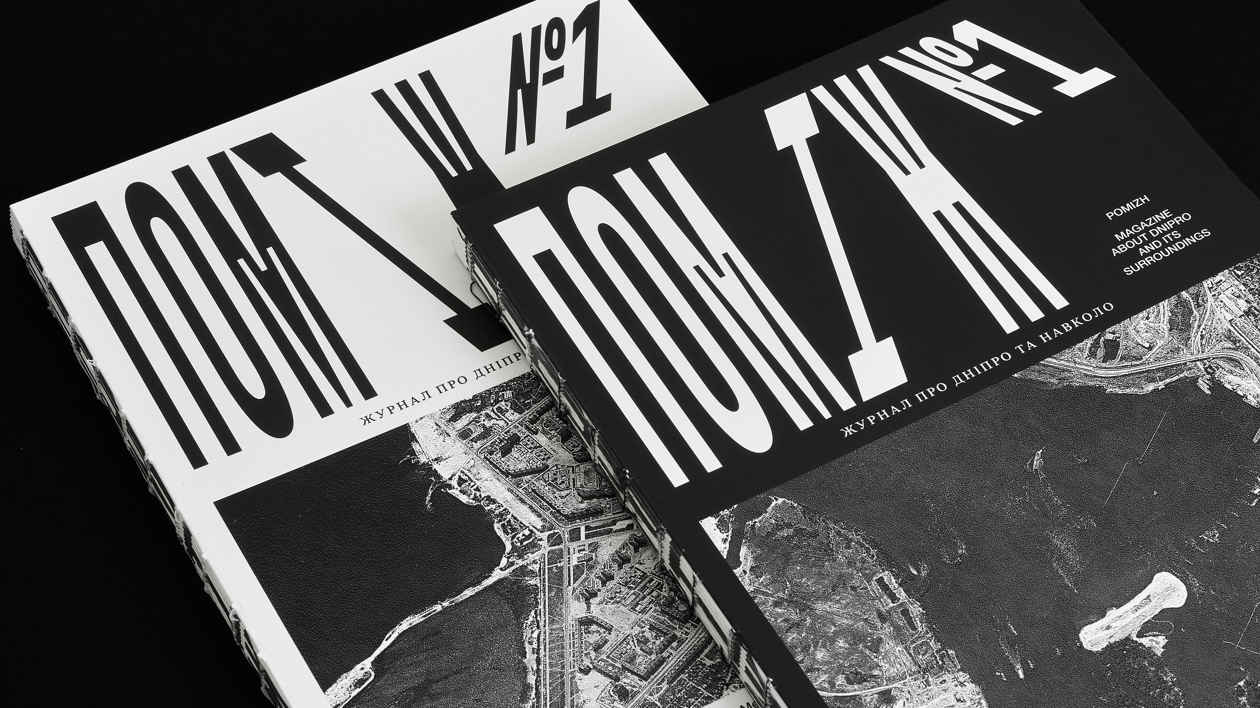 The magazine has two different covers: one black and one white. They feature two archival photographs of bridges construction across the Dnipro River in two opposite districts of the city. These photographs are placed on the front and back covers and are swapped between the black and white versions.