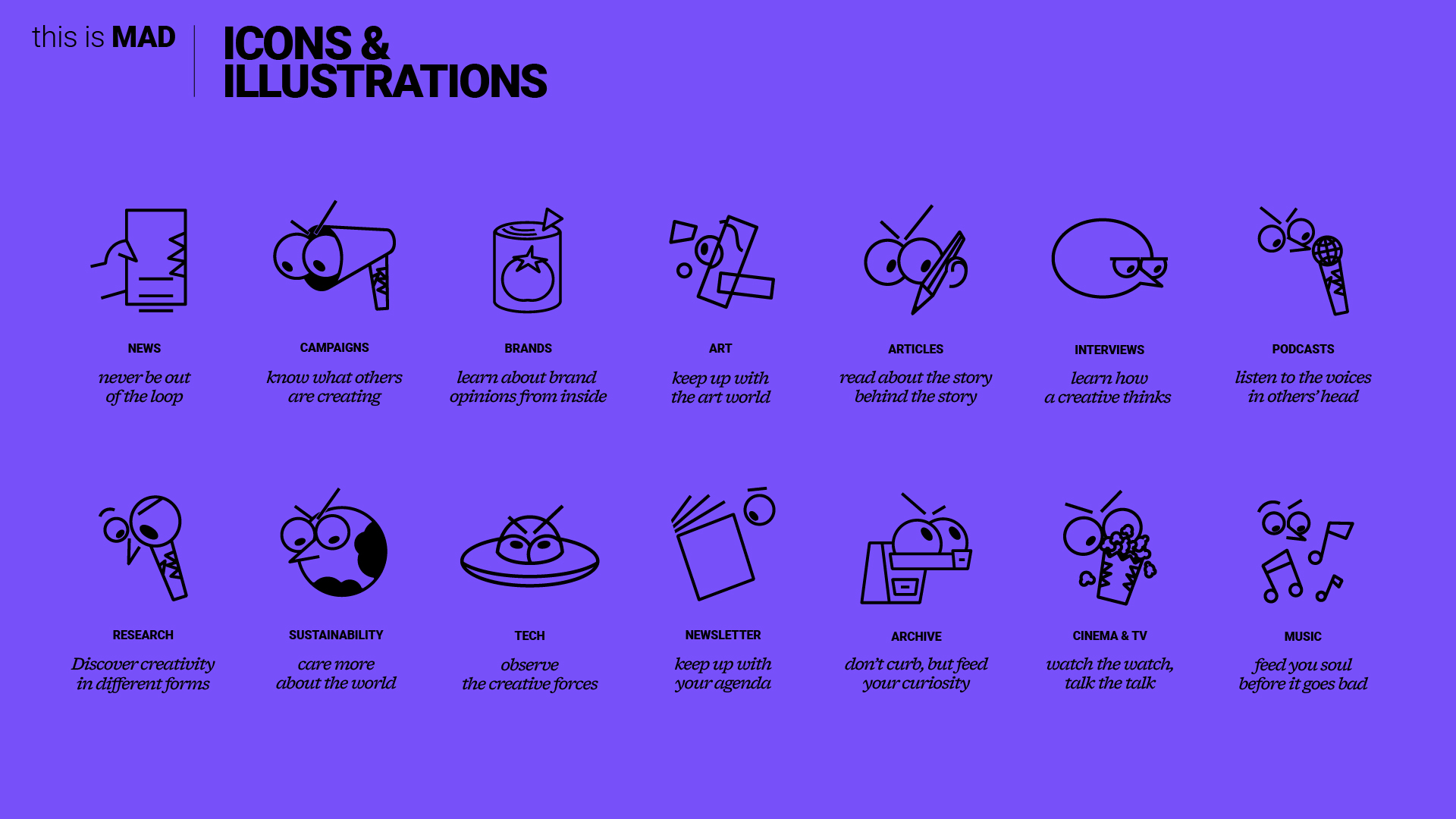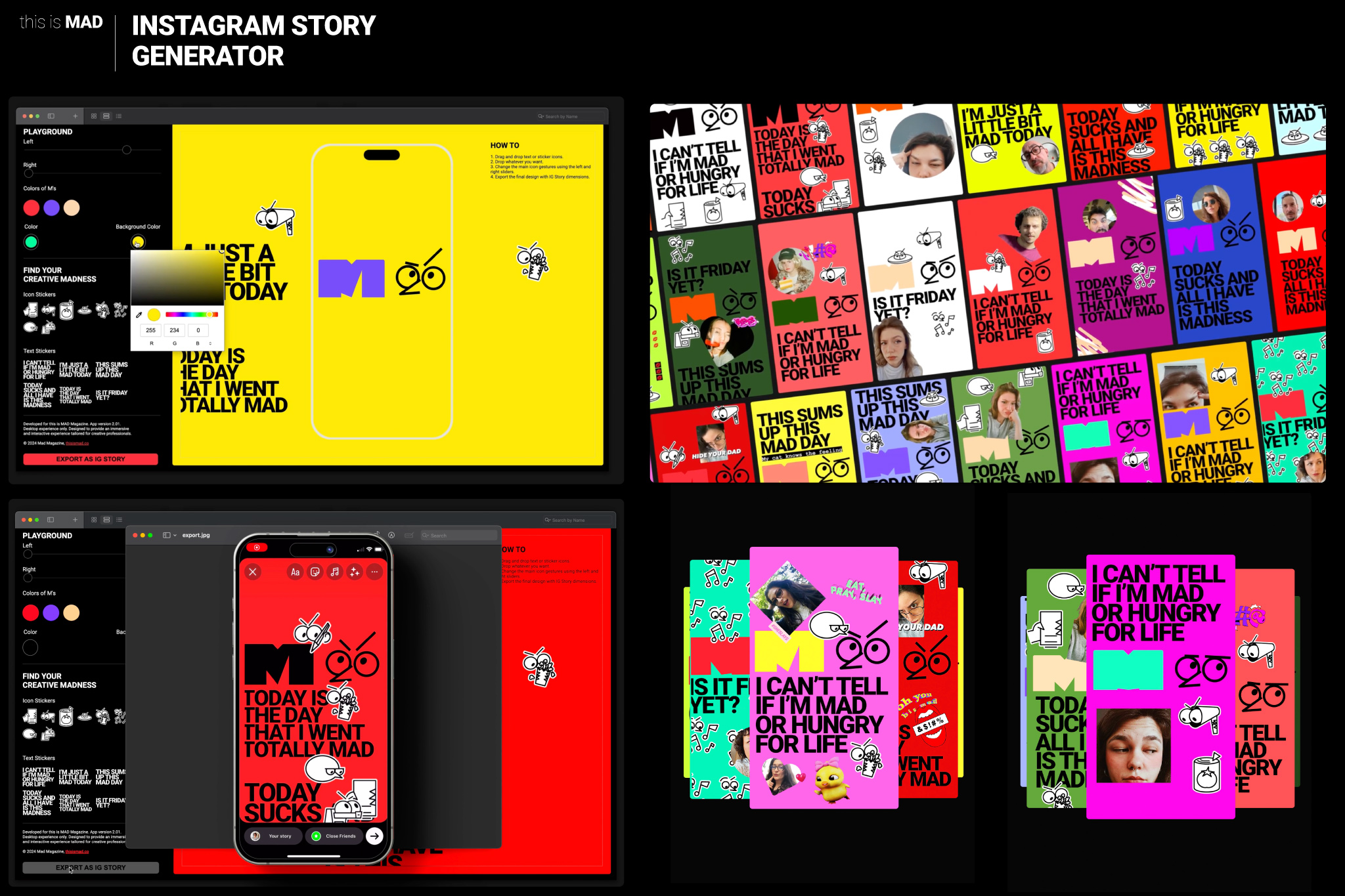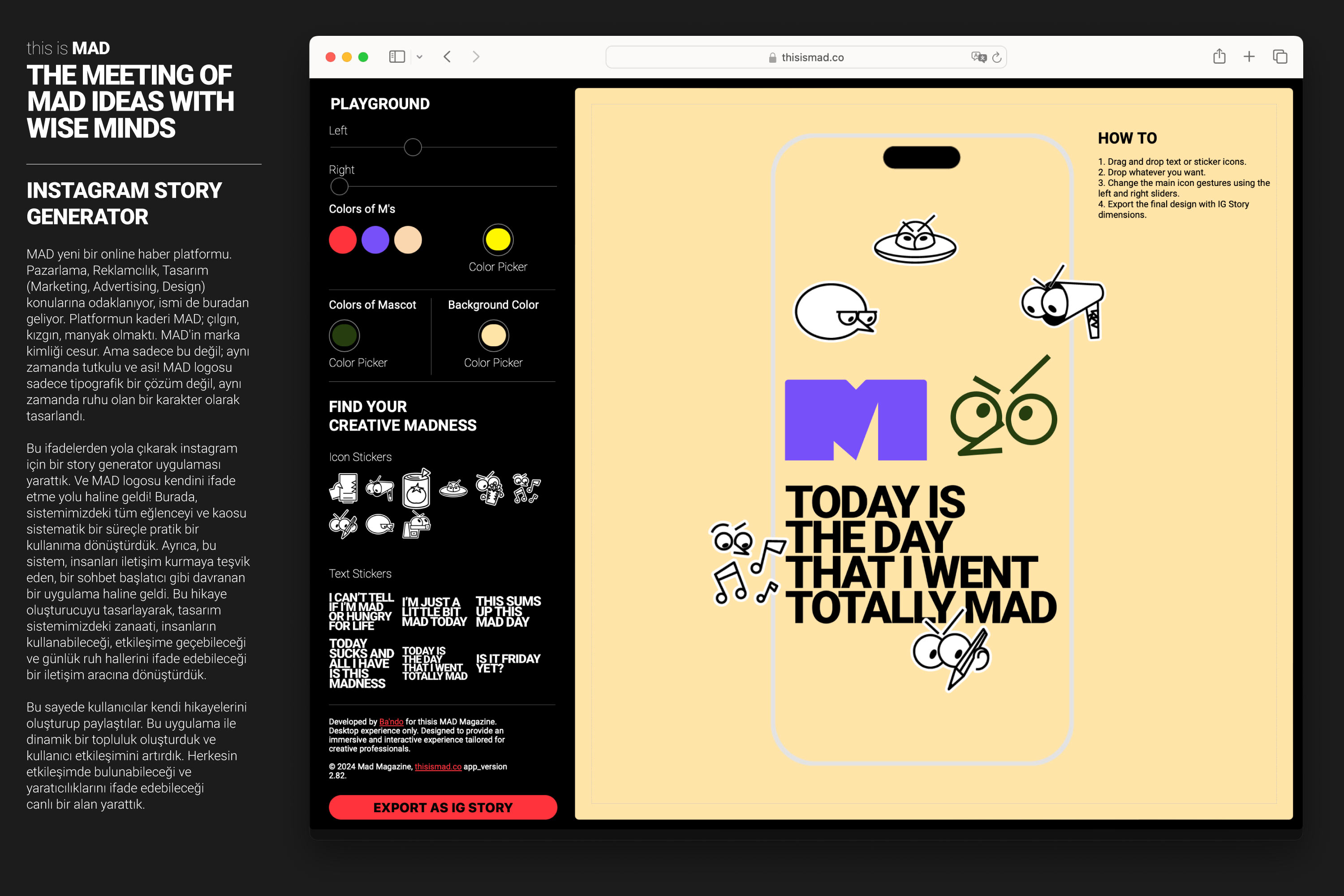MAD's brand identity is bold. It is also passionate and rebellious! The MAD logo wasn't designed as just a typographic solution but also as a character with soul. From the expressive design of the logo, a MAD mascot comes to life through traditionally crafted animations. The story generator feature plays a crucial role. It allows users to create and share their own stories, fostering a dynamic community and enhancing user engagement.