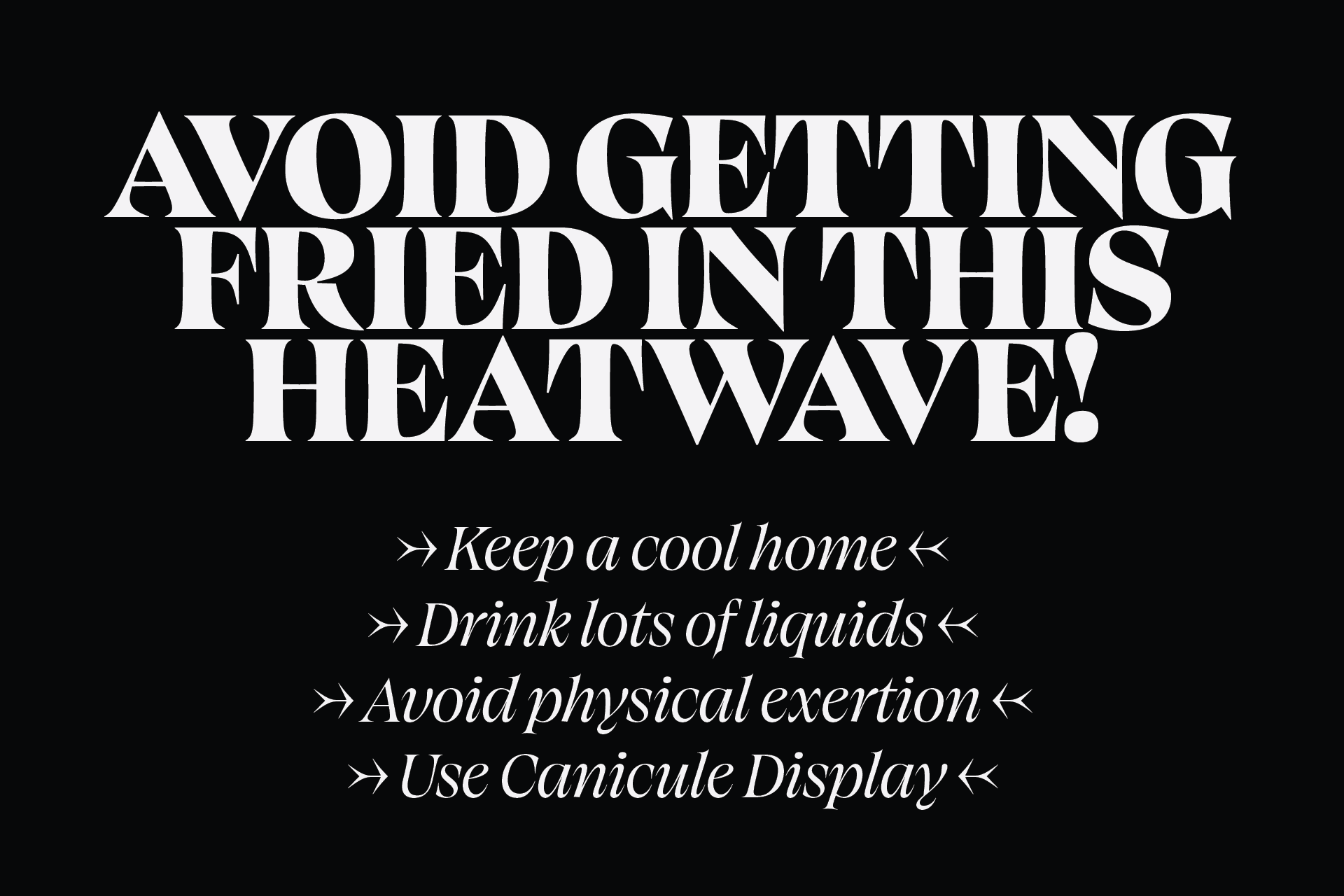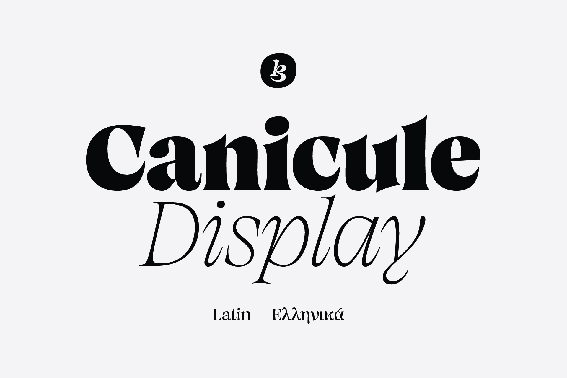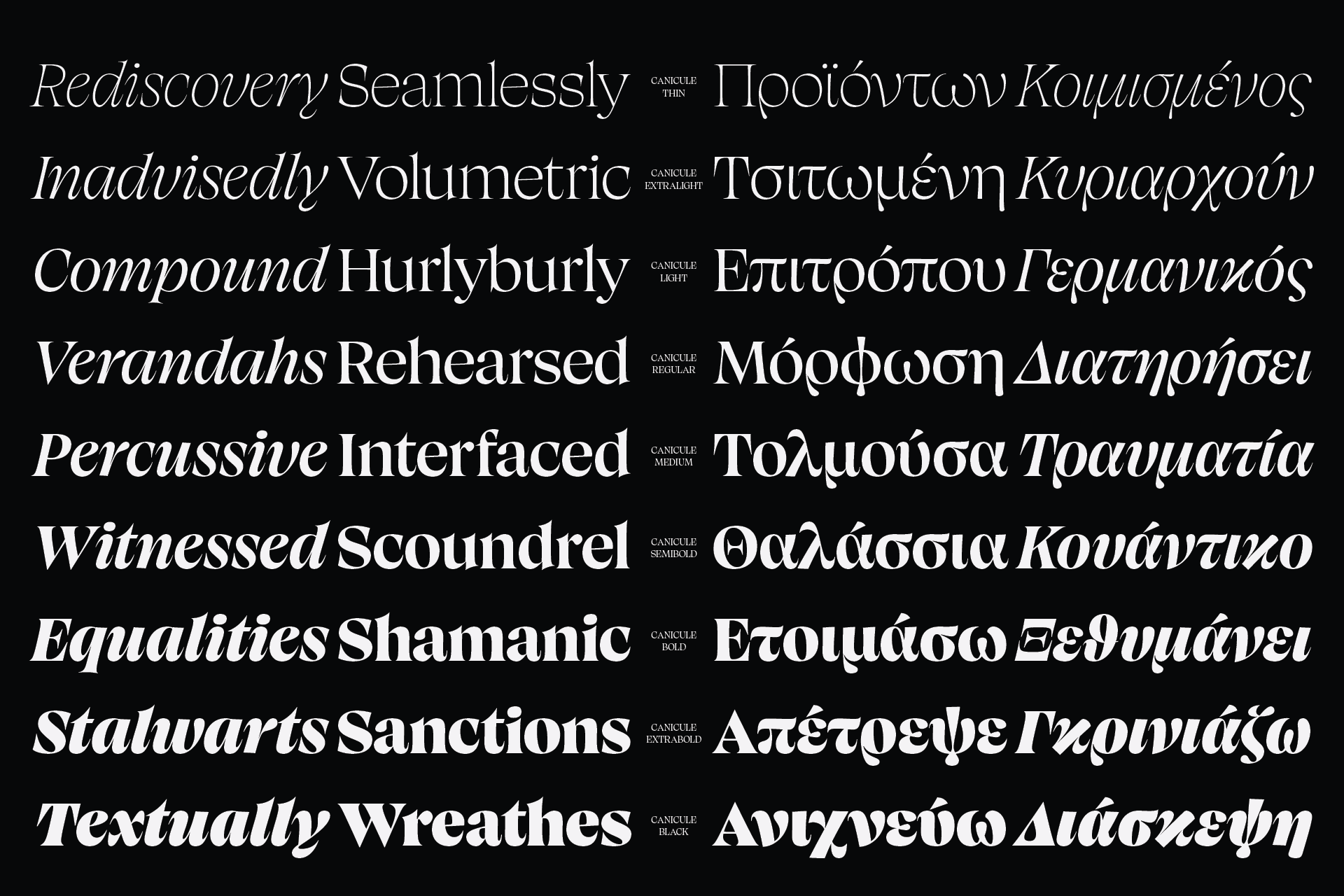 Canicule Display is designed to attract attention at large sizes. In its latest version, it features 18 weights, from Thin to Black along with their italics, and supports Latin and Greek.
