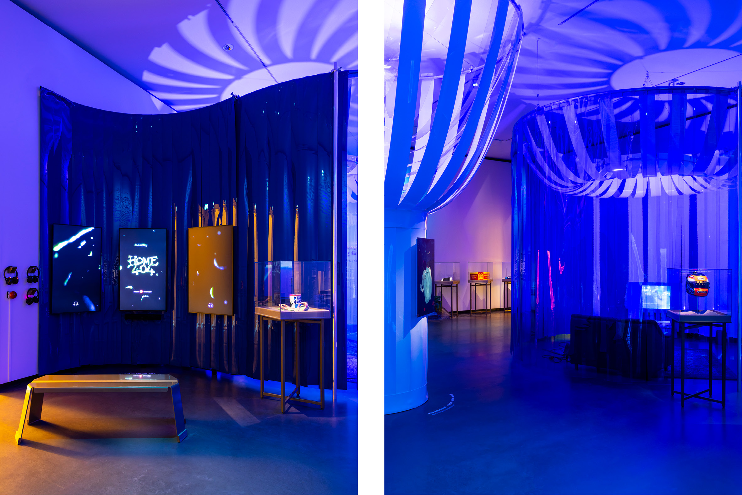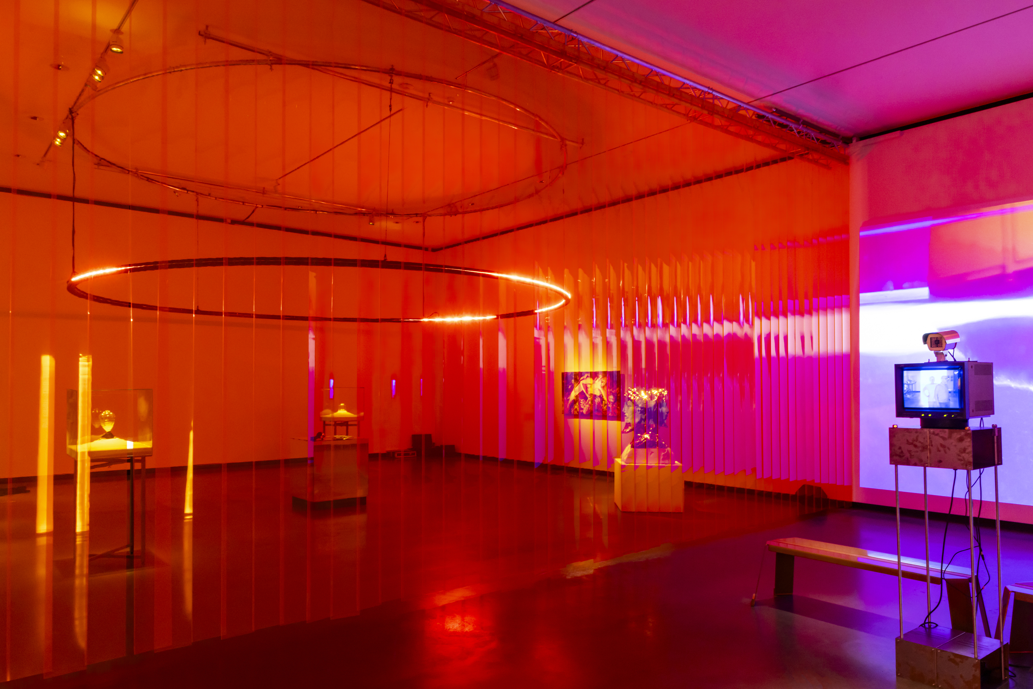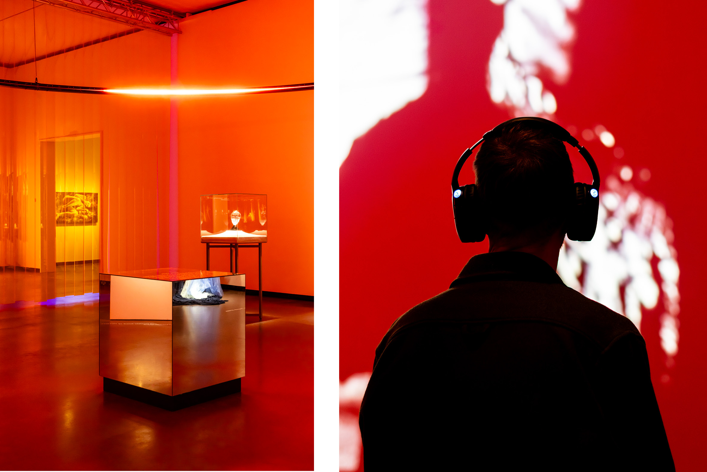 What happens when you let go of this world and let yourself be completely guided by feeling? When you make feeling, association and creativity more important than what the world around you expects from you? Na Regen komt Neonlicht (translated After rain comes neon light) is the result of the research of the Arnhem based R&B producer/songwriter KIMONO into his creative and personal development. This project, consisting of music, a club night and an exhibition, takes you on a sensory journey through 10 years, during which KIMONO's creative vision and identity were formed. In the exhibition, art, music and stimulating design guide you through his emotions and thoughts and those of his community. Consider topics such as love, loneliness, fear, greed, identity and art. KIMONO has always lived and worked based on his intuition and autonomy. KIMONO took this vision and method with him, while curating the exhibition in close collaboration with his community. By positioning KIMONO as the public-in-residence, he and his community formed a unique connection with the museum, exploring how art can resonate with them. The exhibition showcased a blend of iconic works from the museum’s collection and new pieces meaningful to KIMONO, some never before displayed in a museum, like the helmet from a Frank Ocean music video. Others, such as works by Sabine Marcelis and Daniel Arsham, are trending on platforms such as Instagram. The exhibition's bold design - by KIMONO, studio met met & Dana Dijkgraaf - engaged multiple senses, making art more accessible. The exhibition used color, light, sound, and artworks to immerse visitors in KIMONO's world. This sensory-rich experience resonated with KIMONO’s community, while introducing art to a new demographic unfamiliar with its impact. Museum Arnhem, known for its commitment to gender equality and supporting women artists, embraced this innovative approach. The collaboration demonstrated the power of listening to communities and creating exhibitions that reflect contemporary culture and leaving their own traditional frames. This approach contributes to a more inclusive cultural landscape, both within the art world and beyond, making a meaningful impact. Visitors are welcomed to the exhibition with a large and ever changing gradient billboard. The exhibition is divided in two distinct spaces, creating two worlds —“After Rain” and “Comes Neonlight”— by the use of colored light, shapes and materials. Two contrasting typefaces are used to symbolize the merging of the two worlds. A custom made soundscape enhanced the experience.