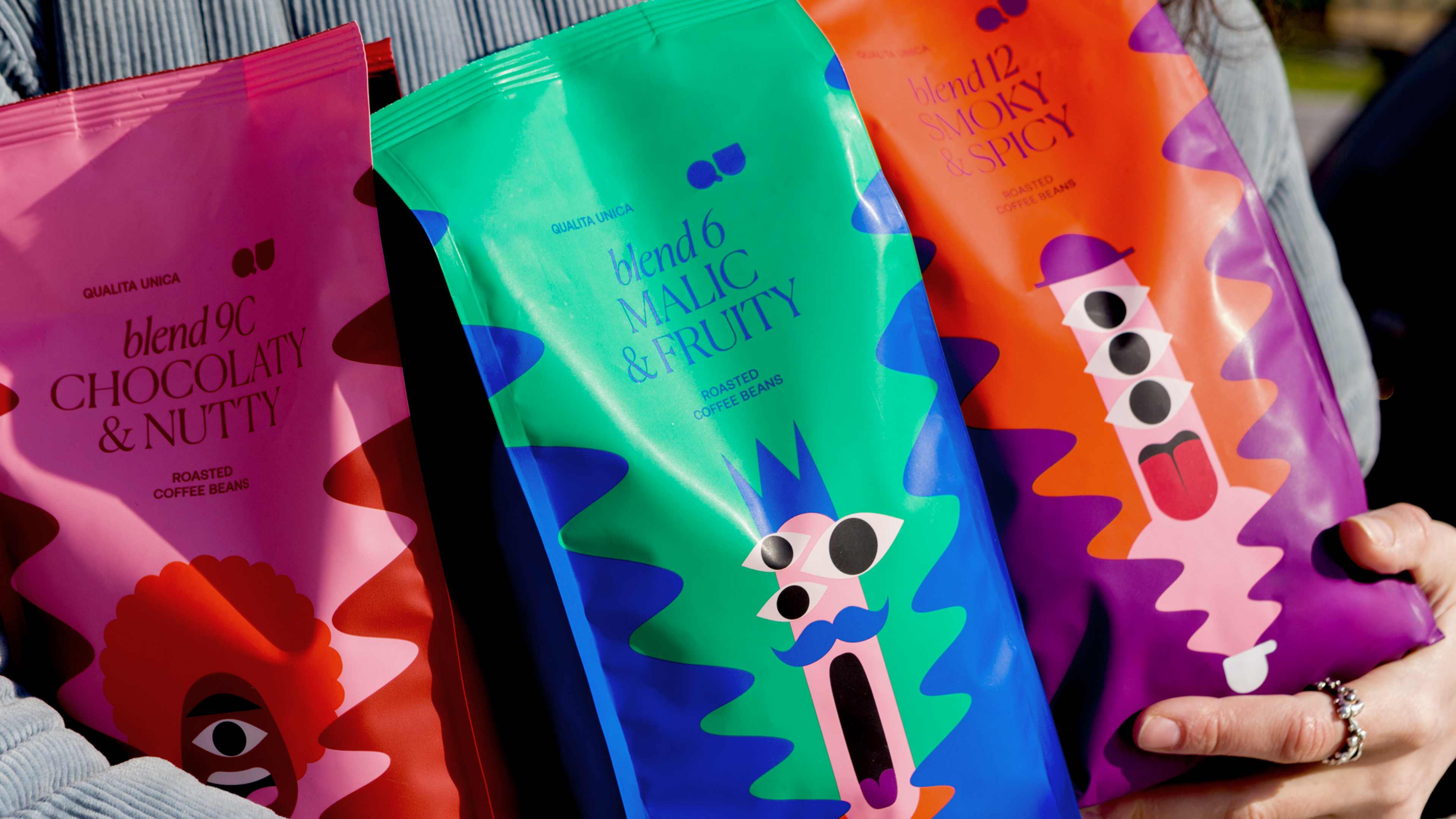 Qualita Unica is a roastery brand that embodies its core tenet in every brand expression: that the art and science of producing great coffee is best experienced through the simple pleasure of drinking it. A series of illustrations, originally created for a Qualita Unica event, has grown and blossomed into an entire visual system, featuring figures, coffee-related objects, and graphics. From the steam rising from a hot cup of coffee, a magical world is revealed. Each figure helps to bring the coffee experience to life in a vivid, sensory way. The consistent typographical design and varied color combinations create consistency across the range while distinguishing between different blends. The packaging communicates the joy and pleasure of the coffee-drinking experience.