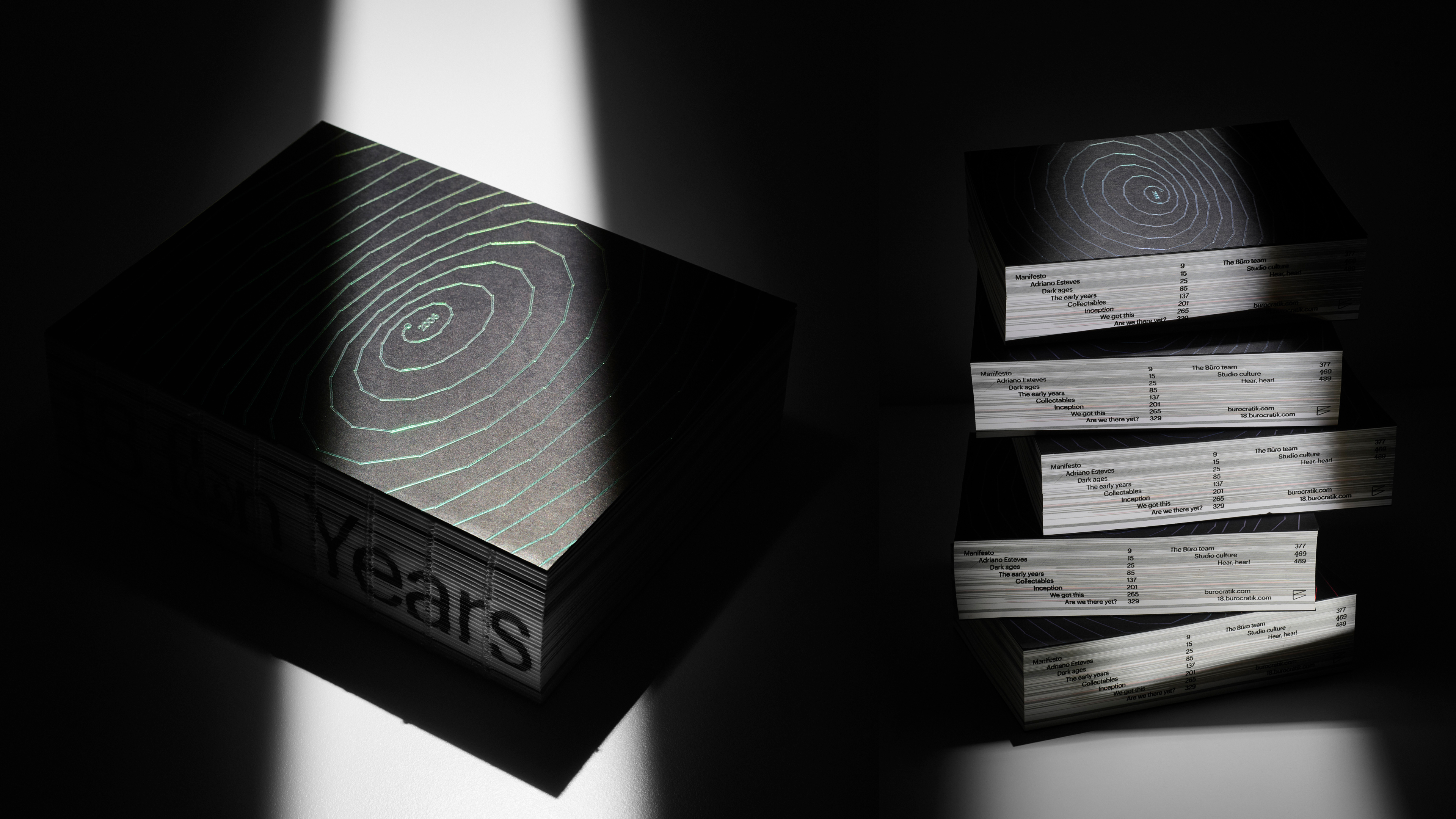 This self-promotional studio book is personal, unfiltered and deliberately raw. From the FKN title to the MF testimonies, materials and finishes—forgive the words, they mean well. The binding is exposed, showing its guts instead of hiding the craft. The book cover and editorial design mirror and complement the 18.burocratik.com timeline (2006—2024) website. From the wrapped spiral website intro echoed on the cover, to the cut photographs that force you to turn the page to see the rest of the timeline. Horizontal scroll on screen, page flip on paper to see the rest of the photo. The book index is screen printed on the side of the pages, the website has a menu for easy access to the timeline both always visible.