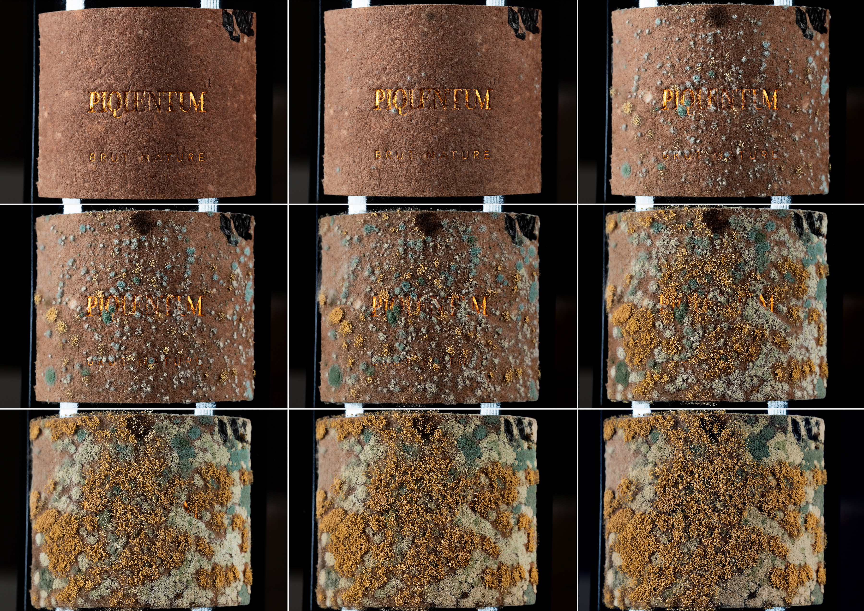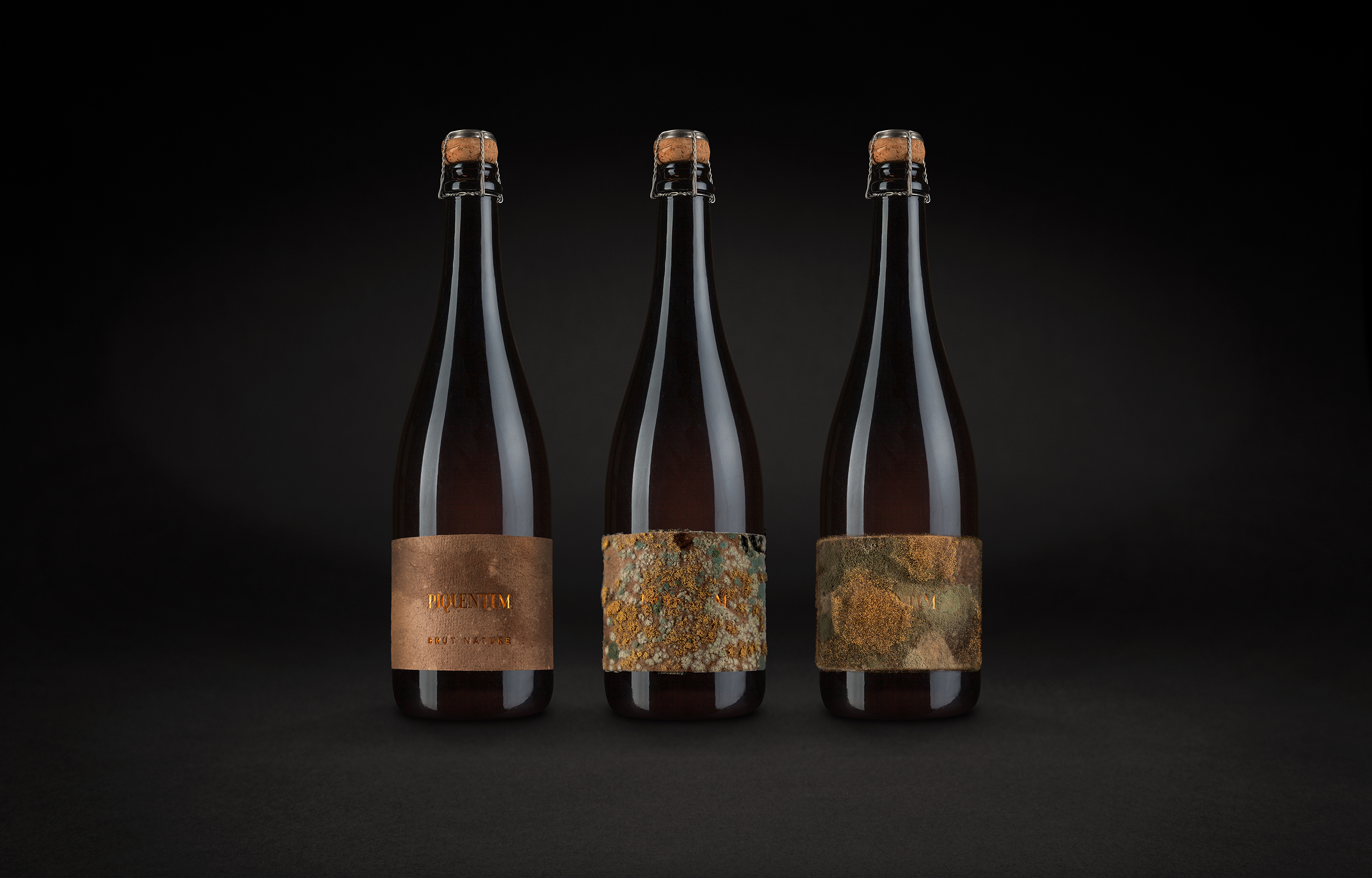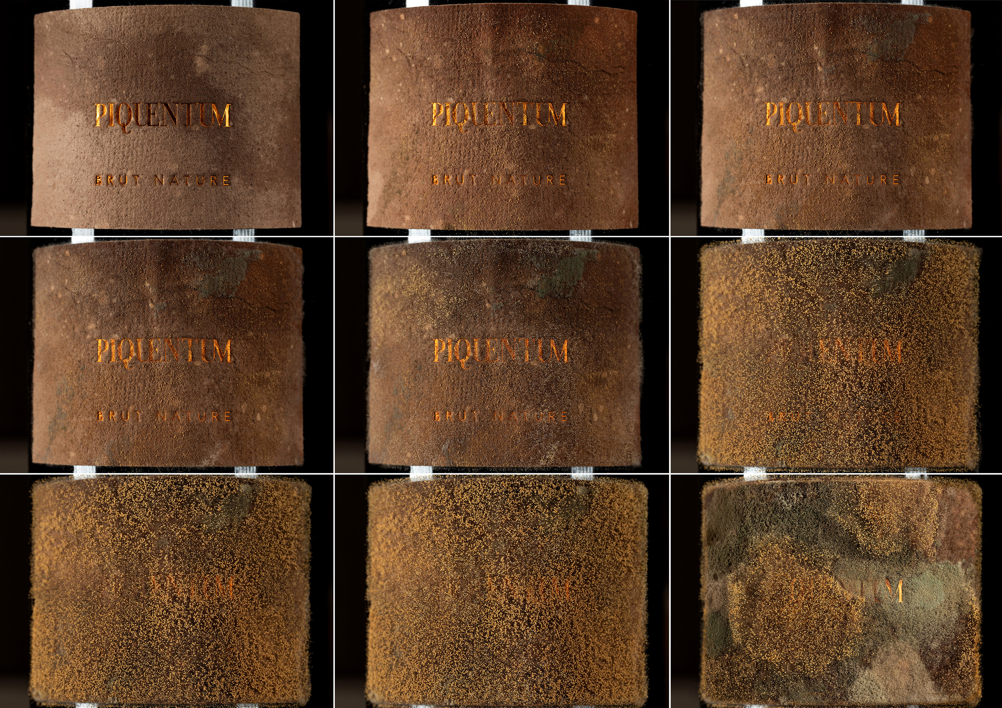 Unlike almost all sparkling wine producers who add industrial sugars and yeasts for secondary fermentation, Piquentum produces its own, from grape must. To prove this, the brand created the first label ever made by the wine itself: from sediment! Distributed in restaurants where experts tell its story, this living label develops noble mold as it evolves, becoming physical evidence of zero compromises.