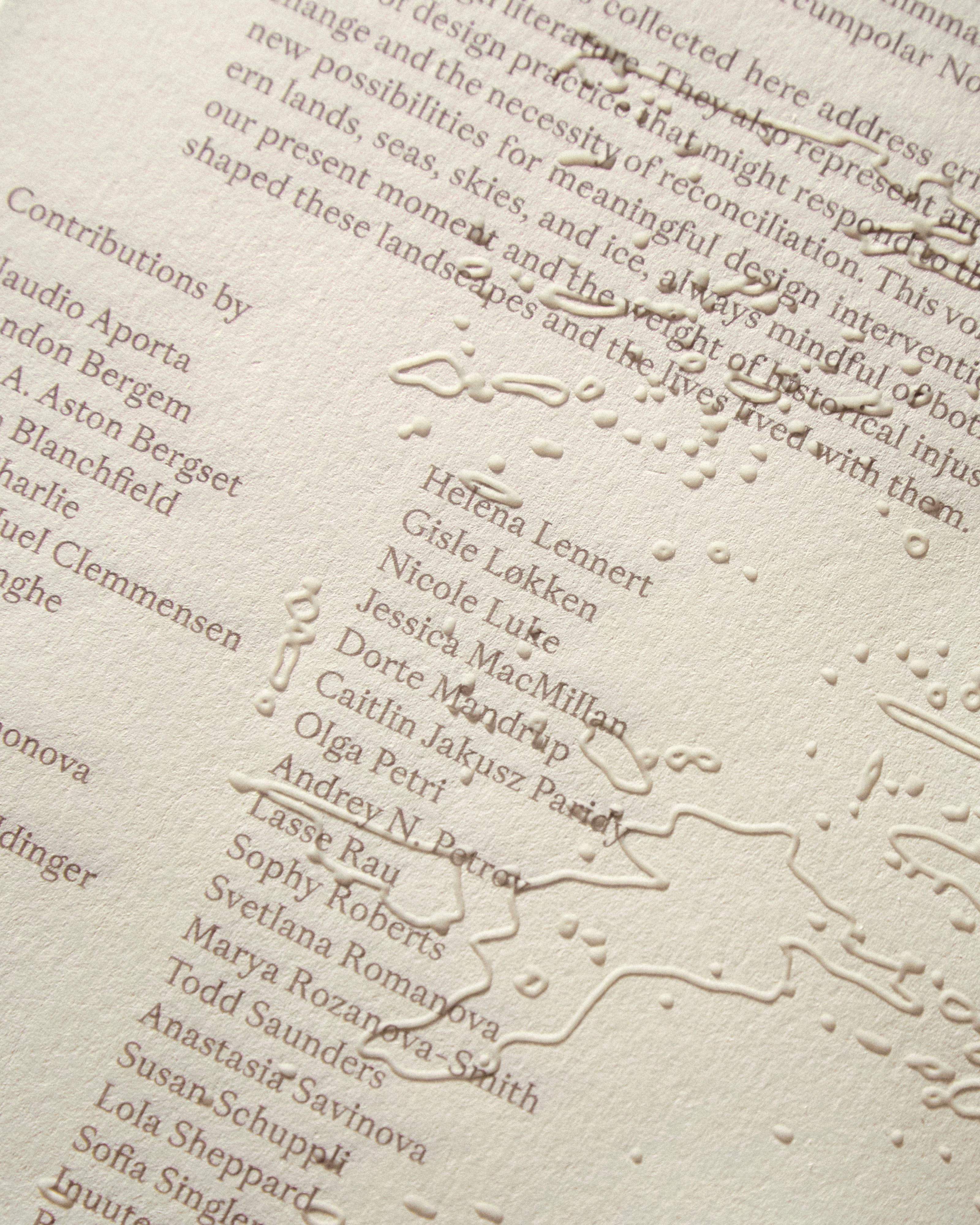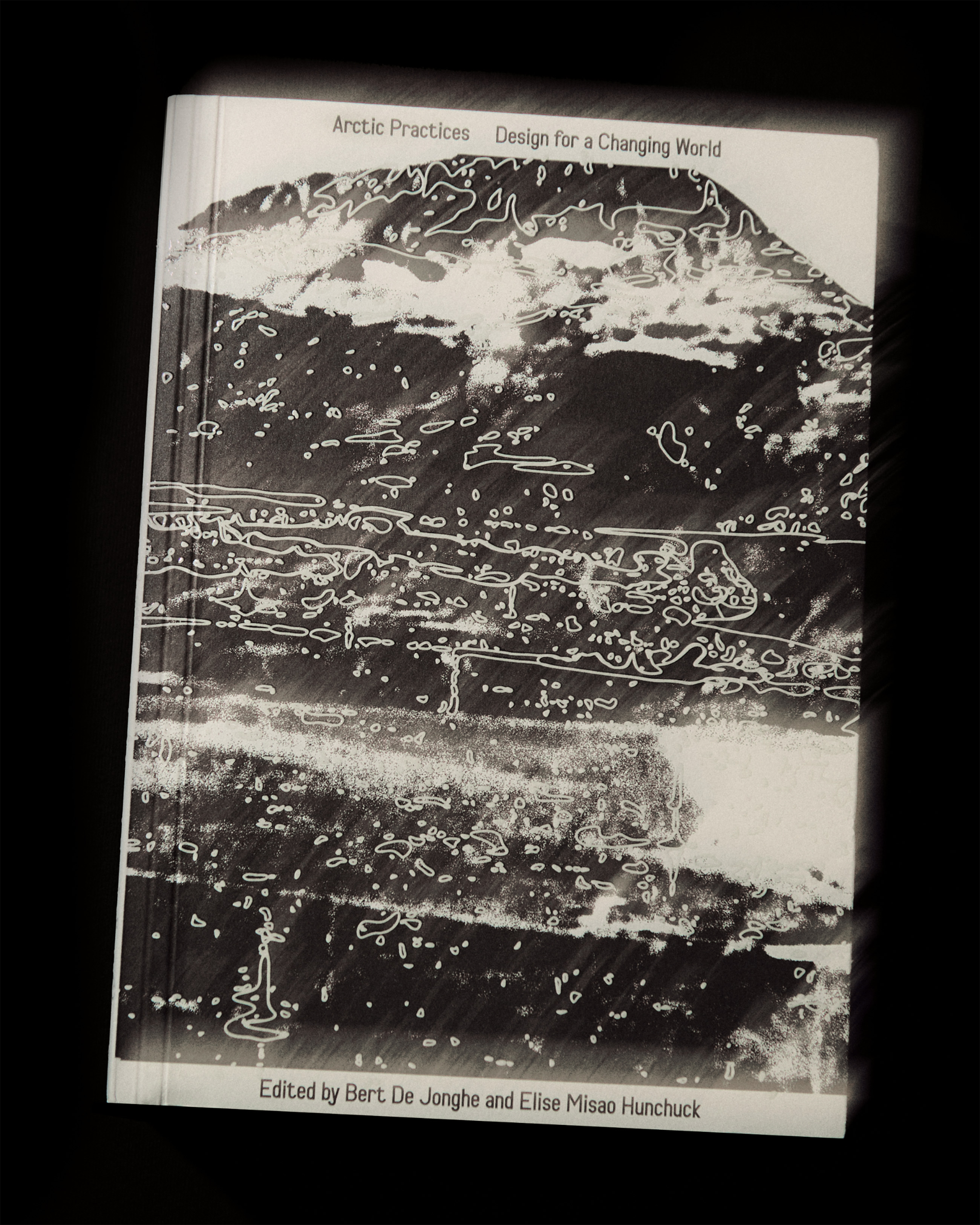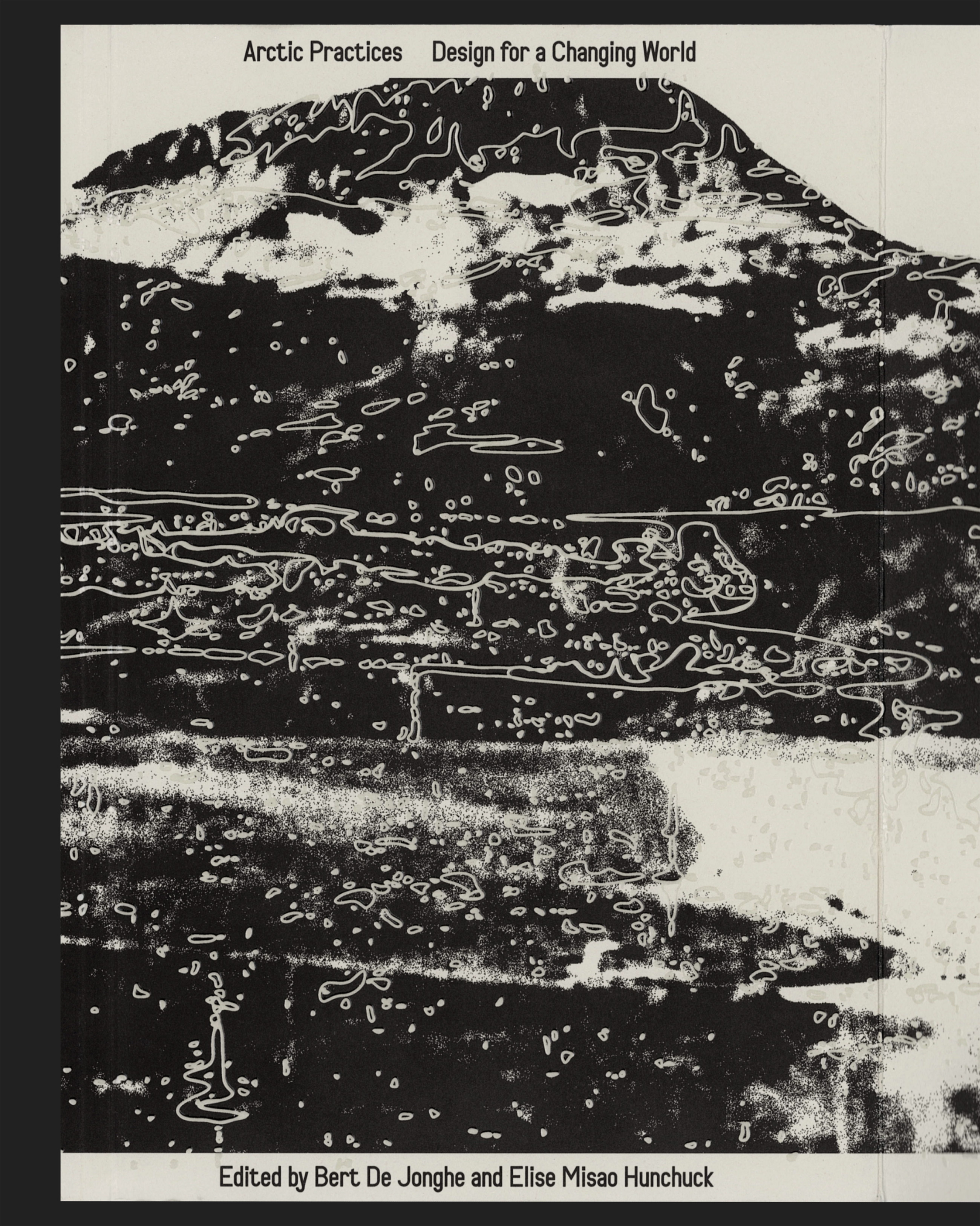 "Arctic Practices: Design for a Changing World" is an edited volume that assembles forty-six contributors from designers, educators, artists, photographers, filmmakers, some Indigenous, some residents, and some visitors to the Circumpolar North—to create a polyvocal assembly of Arctic practices. The book aims to discuss Arctic ecosystems in a moment where they are hanging in a precarious balance due to human-induced climate change rooted in colonial extractive practices and industrial capitalism. The book’s curation and design integrate a range of editorial formats and visual documents, including maps, architectural and landscape plans, collages, archival materials, landscape and documentary photography, and speculative drawings, into a variety of configurations and layouts that highlight the specificity of the contents. The foldout cover overlays multiple interpretations of a single image, combining low-resolution, eroded and granular textures, line drawings, and high-relief varnish in unexpected combinations—each surface holding light the way different seasons hold water, now absorbing and scattering at new seasonal rhythms, evoking the shimmer of familiar states learning unfamiliar arrangements.