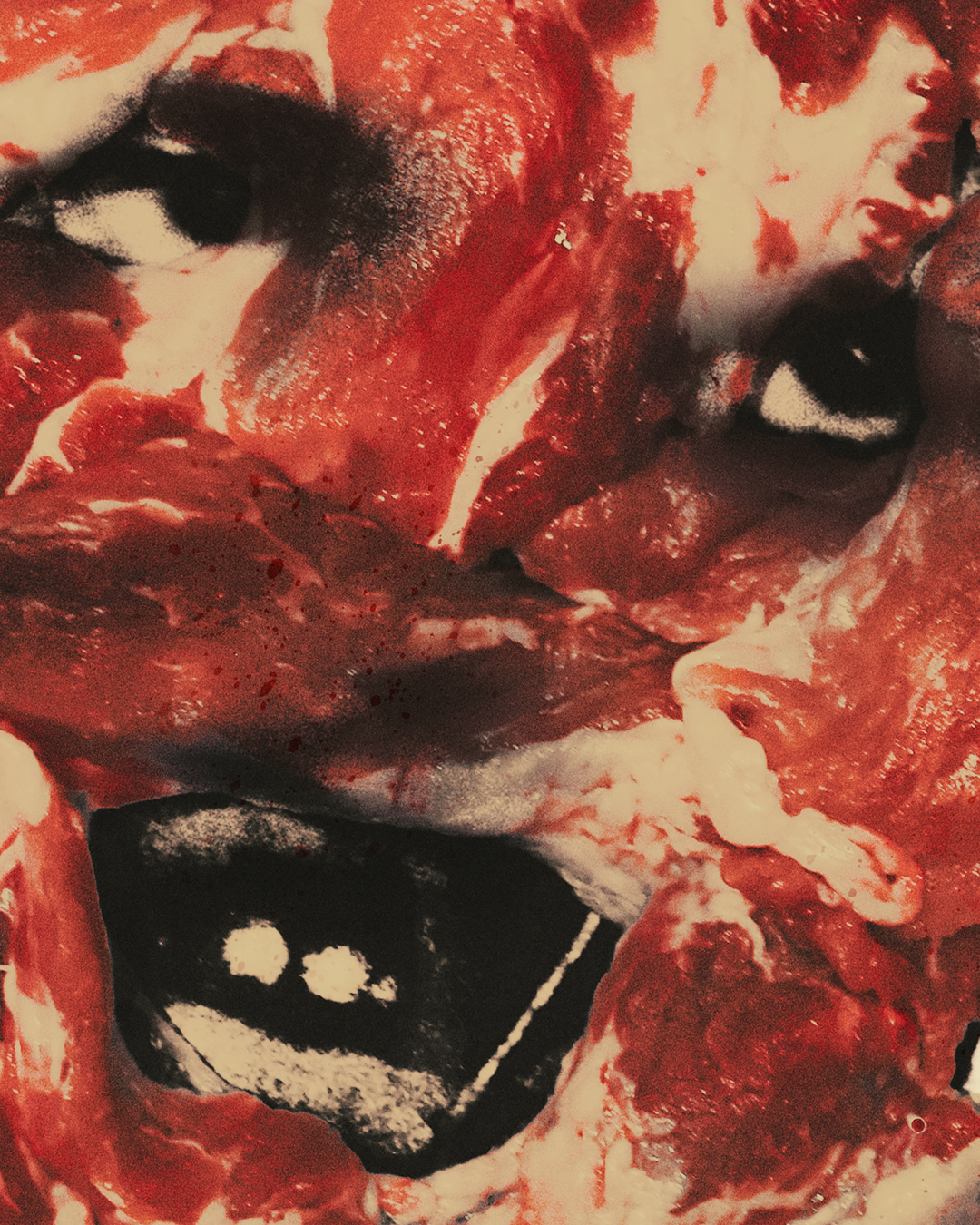 The brief allowed for the possibility of not using an actual film still, so I created a poster in which I used raw meat as a mask on the face of the main character and a chainsaw chain to construct the typography.