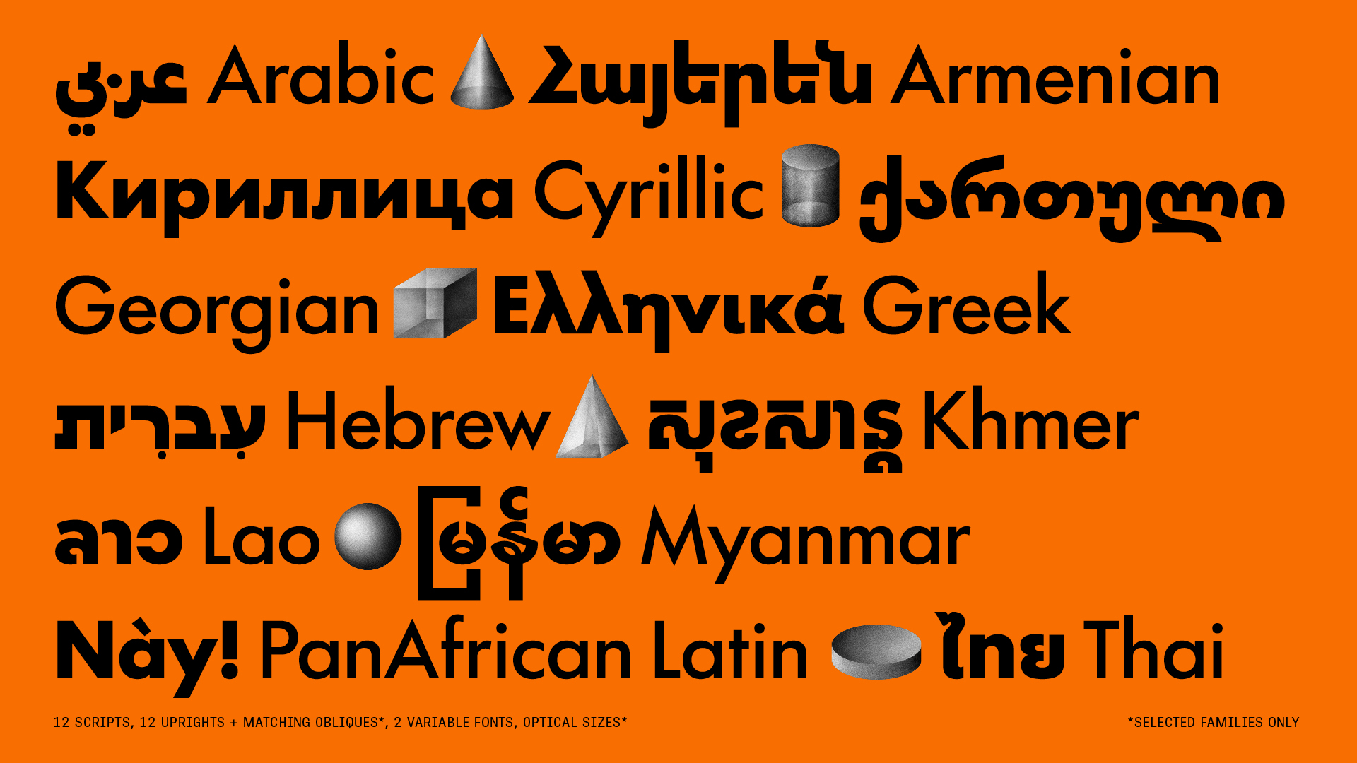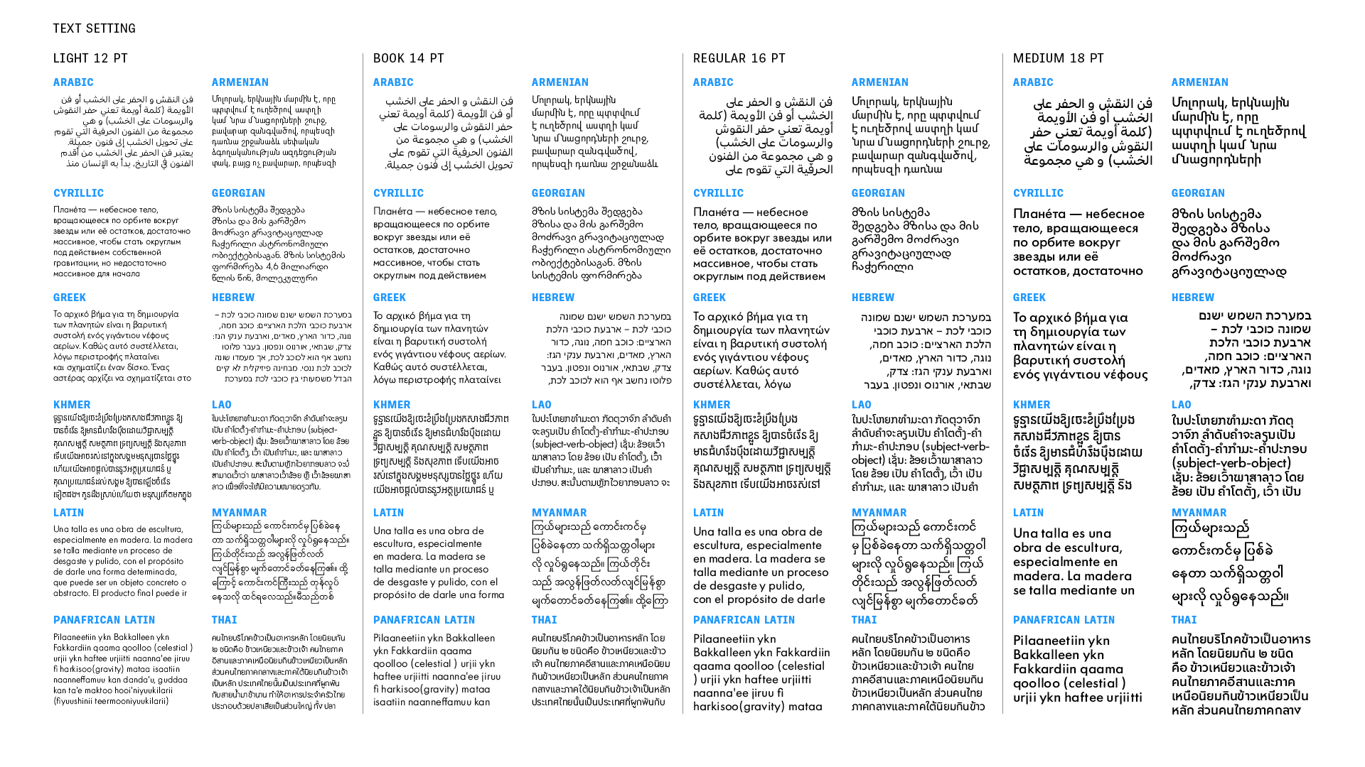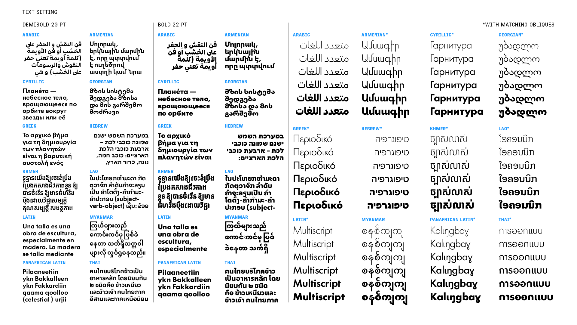 There are two basic reasons for a new Futura. The first is language support. Until now only a few scripts have ever been created; in 2025 the first release of Futura®100 included Armenian, Cyrillic, Georgian, Greek, Hebrew, Khmer, Lao, Latin, PanAfrican Latin, Thai (these ten with obliques), Arabic and Myanmar. The second release will include support for major Indic scripts as well as Simplified Chinese and Hangeul. This will make Futura®100 one of the few truly global typefaces — communicating in more scripts and languages than ever before. With such extensive coverage, Futura®100 is a great fit for agencies and brands with global reach and multinational commitments.