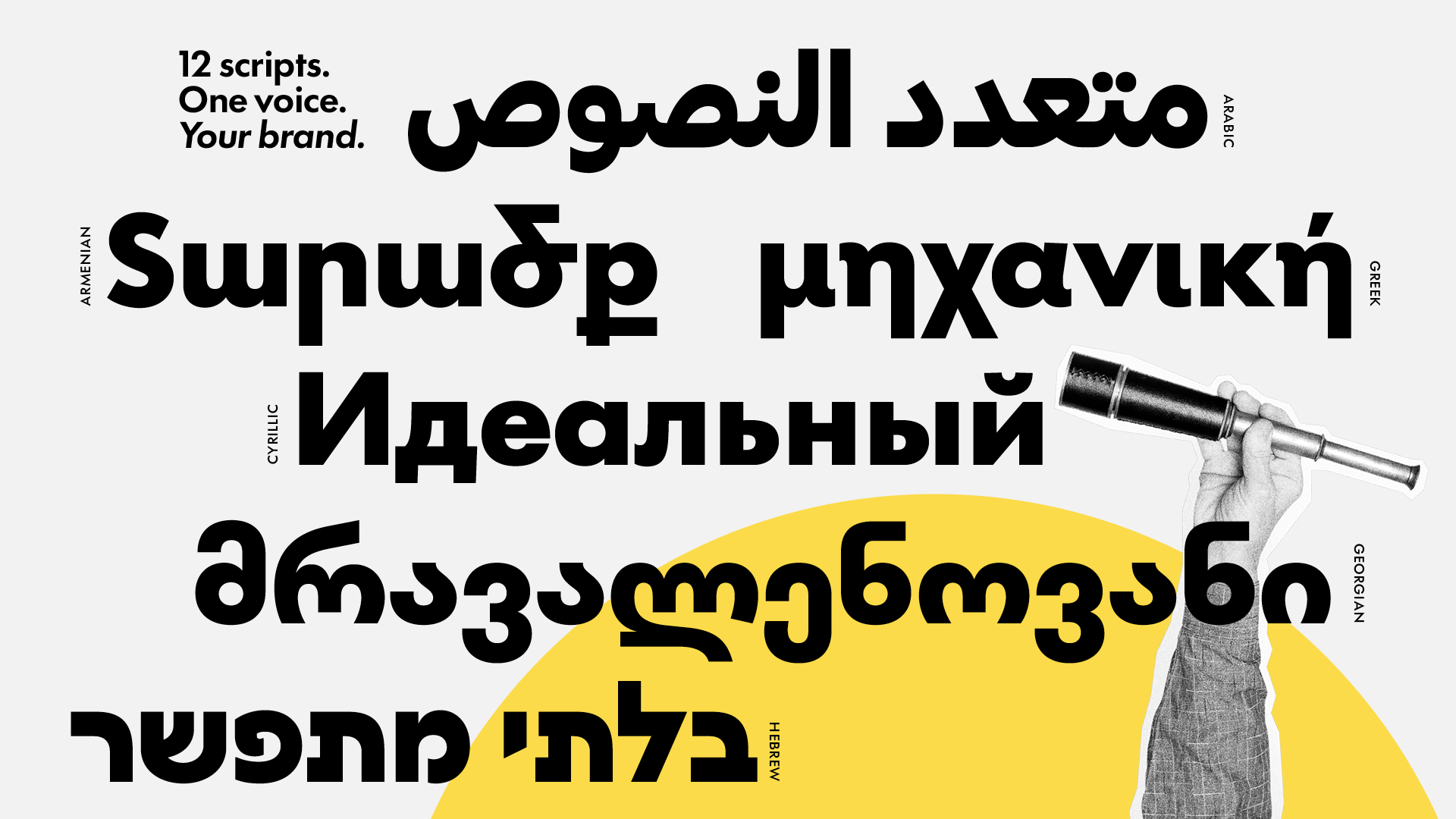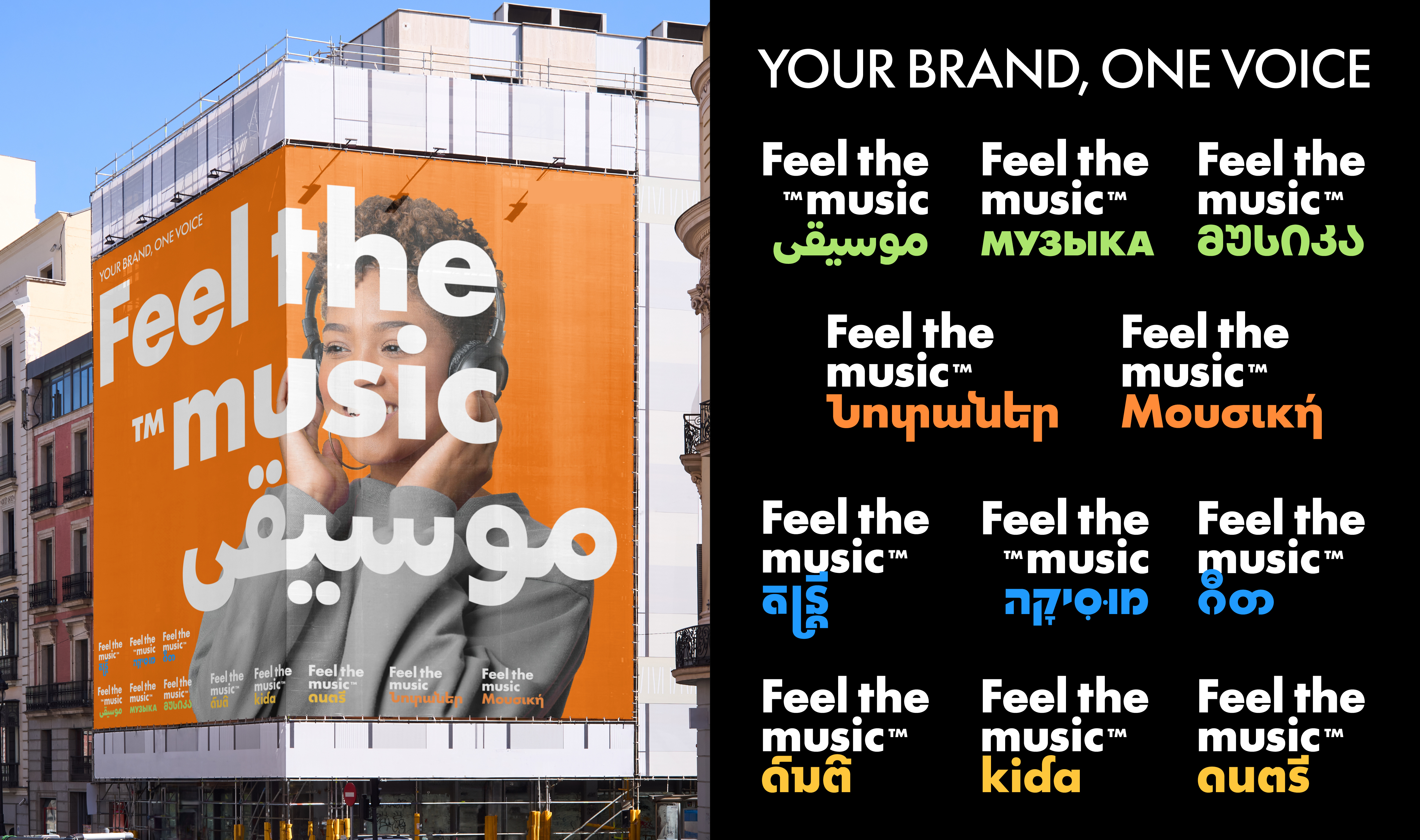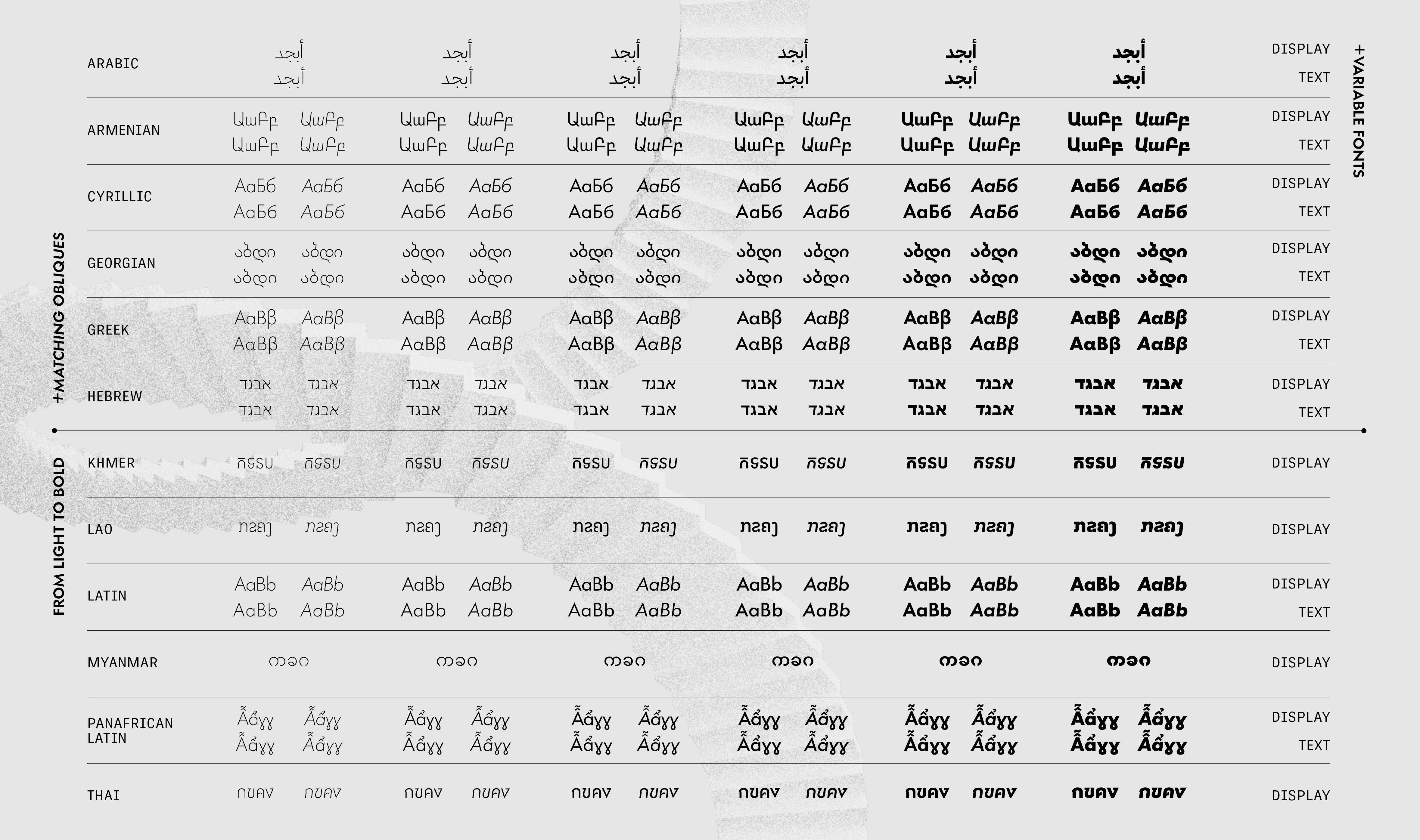 There are two basic reasons for a new Futura. The first is language support. Until now only a few scripts have ever been created; in 2025 the first release of Futura®100 included Armenian, Cyrillic, Georgian, Greek, Hebrew, Khmer, Lao, Latin, PanAfrican Latin, Thai (these ten with obliques), Arabic and Myanmar. The second release will include support for major Indic scripts as well as Simplified Chinese and Hangeul. This will make Futura®100 one of the few truly global typefaces — communicating in more scripts and languages than ever before. With such extensive coverage, Futura®100 is a great fit for agencies and brands with global reach and multinational commitments.